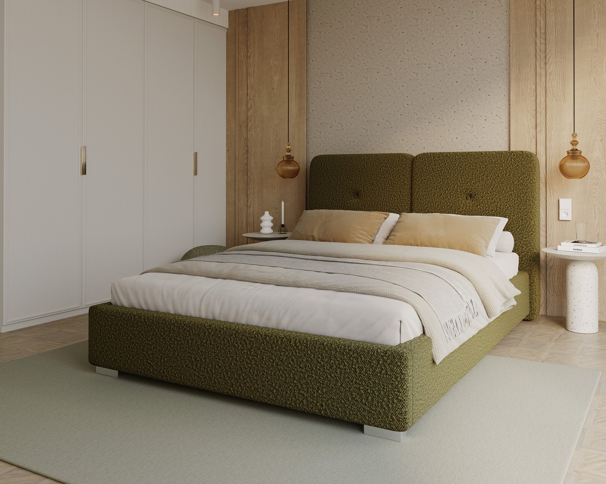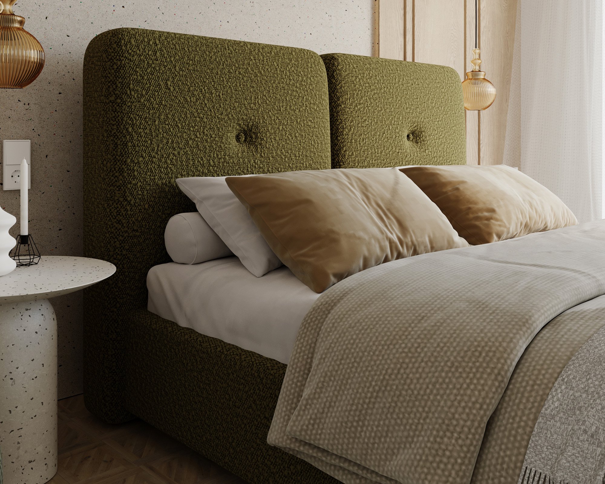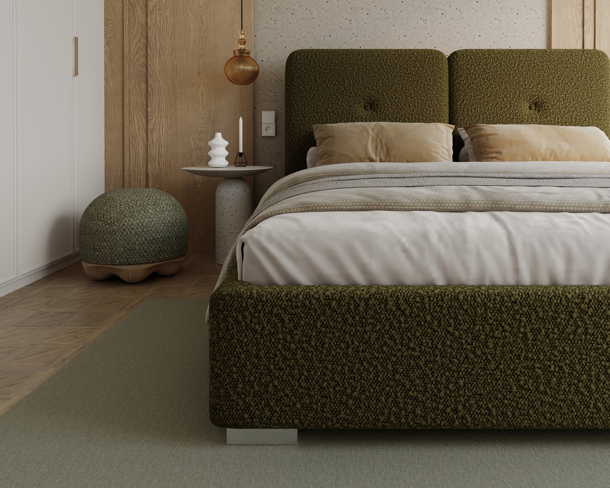 Krevet Bedretto ističe se elegantnim oblikom i profinjenim odabirom materijala. Tapecirani okvir presvučen je mekom i izdržljivom tkaninom Boucle Olive, koja krevetu daje moderan izgled i ugodan osjećaj na dodir. Boucle tkanina poznata je po svojoj karakterističnoj teksturi koja podsjeća na vunenu petlju, zbog čega je površina kreveta vizualno zanimljiva i istovremeno udobna. Materijal je otporan na svjetlost i habanje, što osigurava dugotrajan svjež izgled čak i pri svakodnevnoj uporabi.