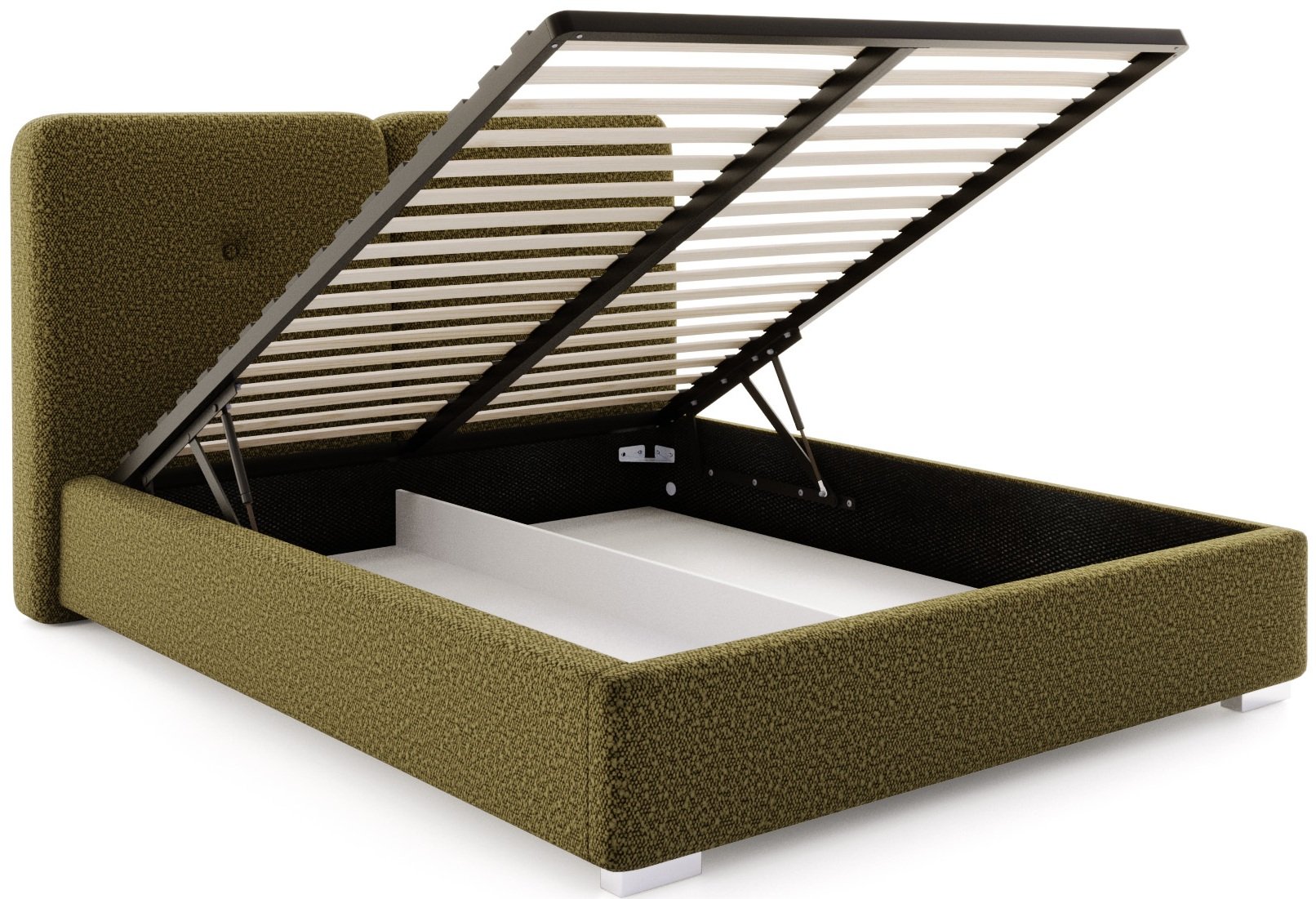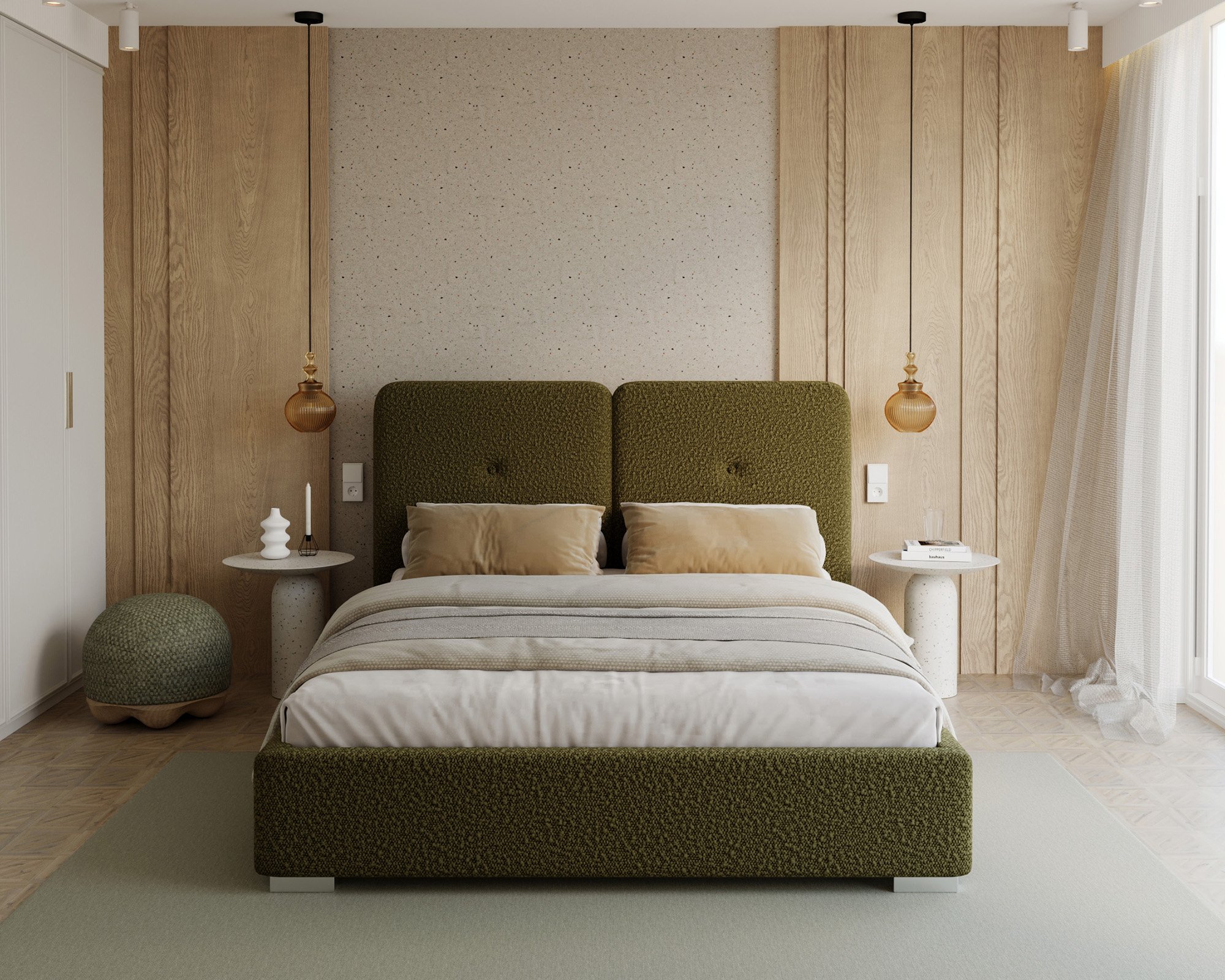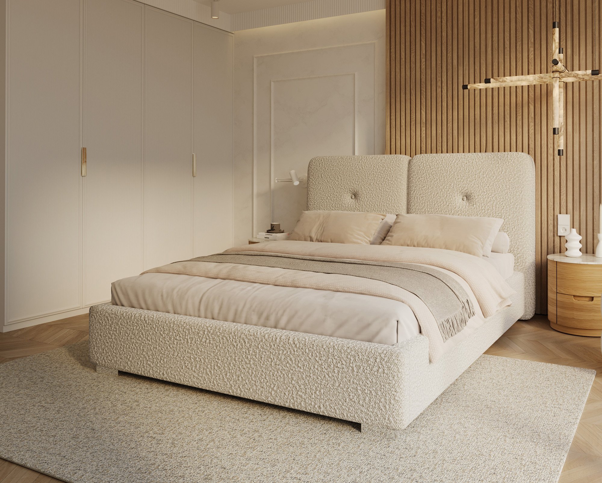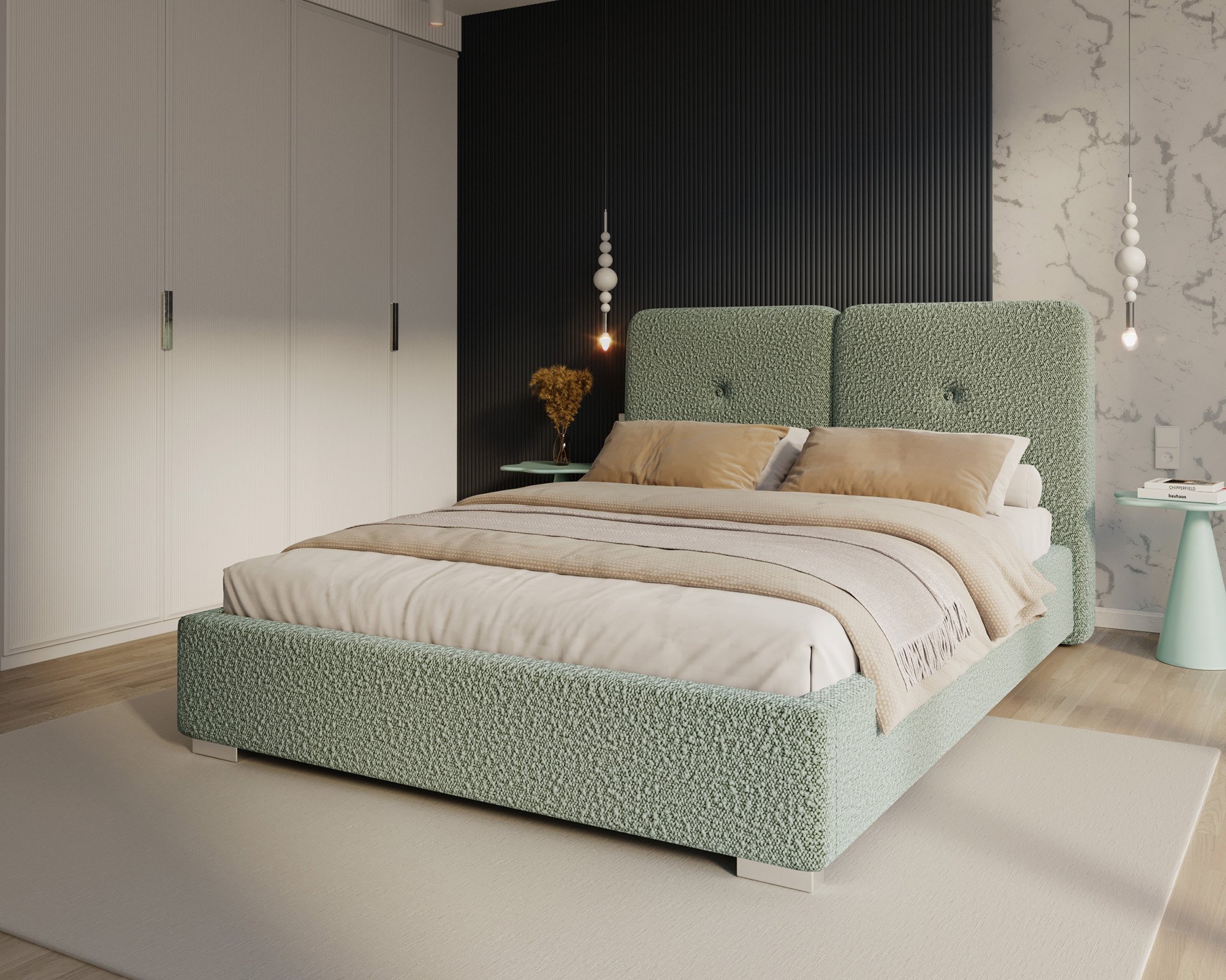 Krevet Bedretto ističe se elegantnim oblikom i profinjenim odabirom materijala. Tapecirani okvir presvučen je mekom i izdržljivom tkaninom Boucle Olive, koja krevetu daje moderan izgled i ugodan osjećaj na dodir. Boucle tkanina poznata je po svojoj karakterističnoj teksturi koja podsjeća na vunenu petlju, zbog čega je površina kreveta vizualno zanimljiva i istovremeno udobna. Materijal je otporan na svjetlost i habanje, što osigurava dugotrajan svjež izgled čak i pri svakodnevnoj uporabi.
