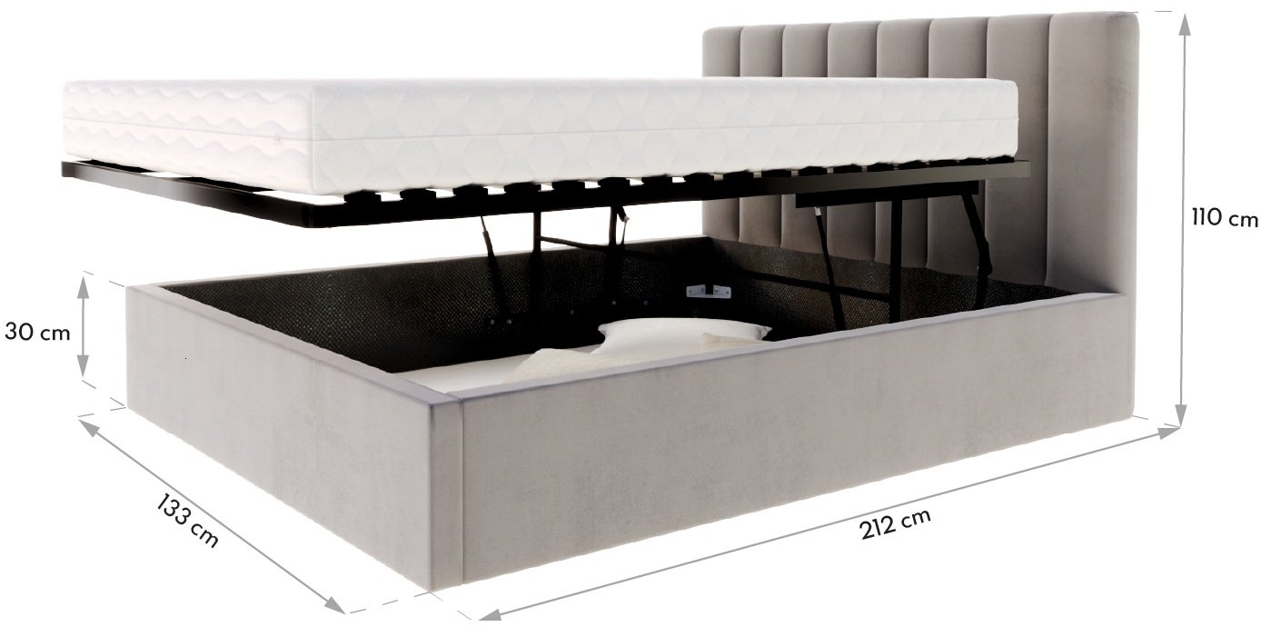 Ležajna površina 120x200 cm, što omogućuje izbor između različitih veličina ovisno o potrebama korisnika. Ispuna je sastavljena od pjene T-25, drveta i iverice, što osigurava dobru potporu tijelu te stabilnost pri svakodnevnoj uporabi. Visina ležajne površine iznosi 30 cm, što omogućuje udoban pristup krevetu i istovremeno doprinosi elegantnom izgledu cijele konstrukcije.