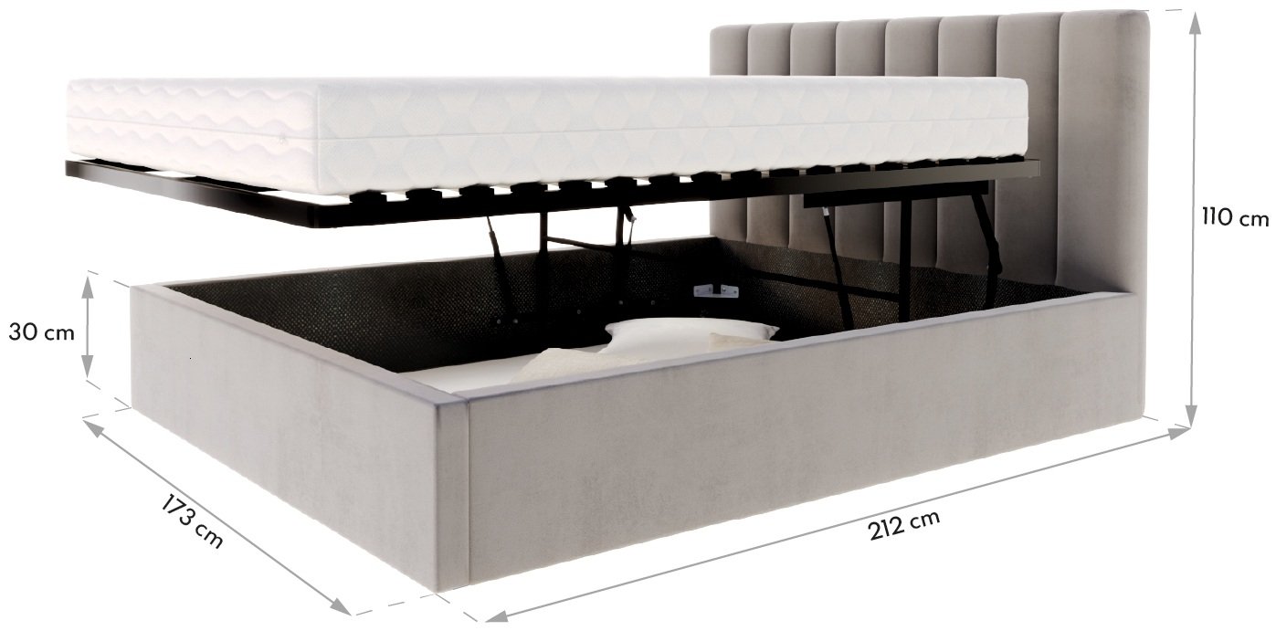 Ležajna površina 160x200 cm omogućuje odabir između različitih dimenzija prema potrebama korisnika. Ispuna je sastavljena od pjene T-25, drva i iverice, što osigurava dobru potporu tijelu te stabilnost pri svakodnevnoj upotrebi. Visina ležajne površine iznosi 30 cm, što omogućuje udoban pristup krevetu i istodobno pridonosi elegantnom izgledu cijele konstrukcije.
