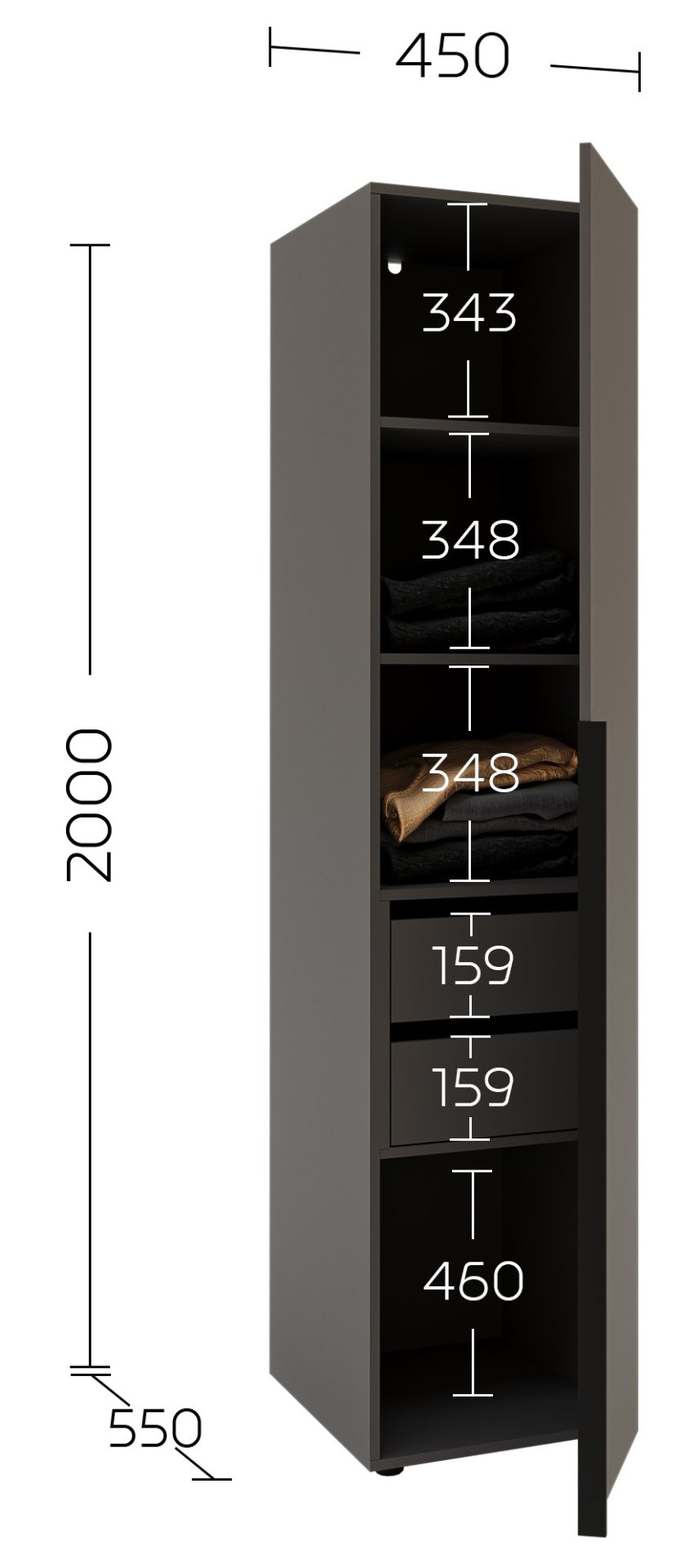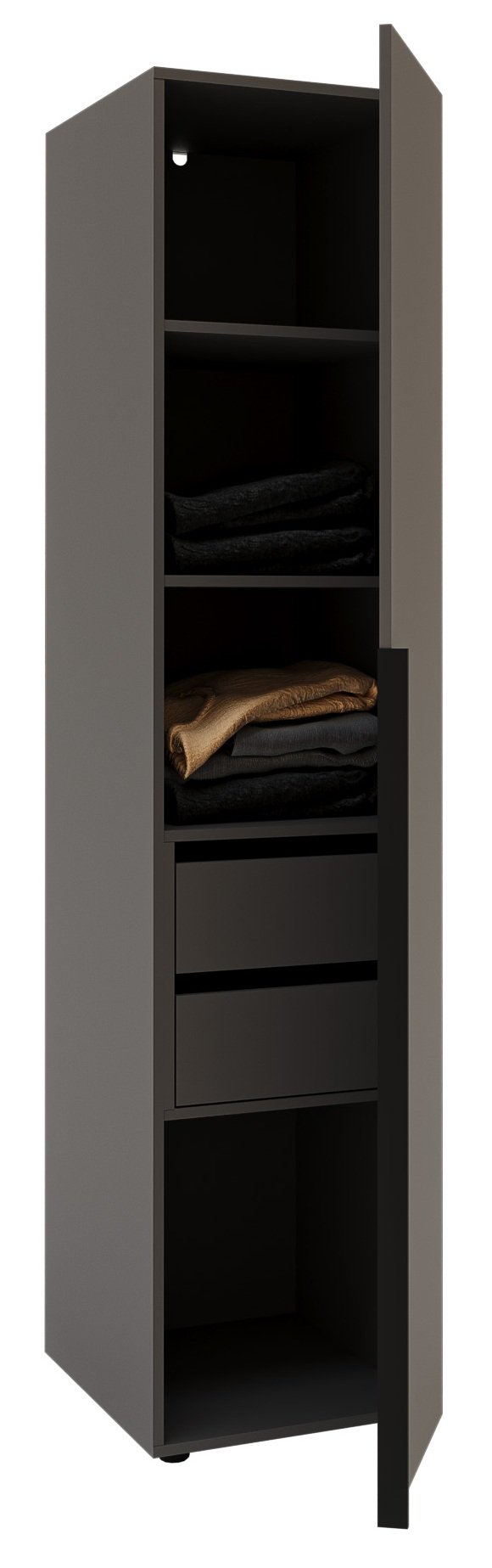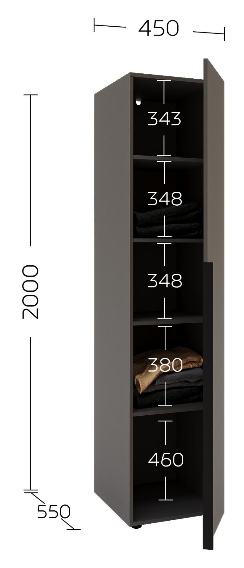 Ormar s dimenzijama 45x55x200 cm savršeno se uklapa u različite prostore – od spavaće sobe i predsoblja do dječje sobe ili ureda. Zbog svoje visine omogućuje optimalno iskorištavanje prostora, dok unutarnje police osiguravaju pregledno pohranjivanje odjeće, kutija, knjiga ili drugih osobnih predmeta. Grafitno siva boja u kombinaciji s metalnim ručkama stvara moderan, ali istovremeno neutralan izgled koji se lijepo uklapa u različite stilove unutarnjeg uređenja.