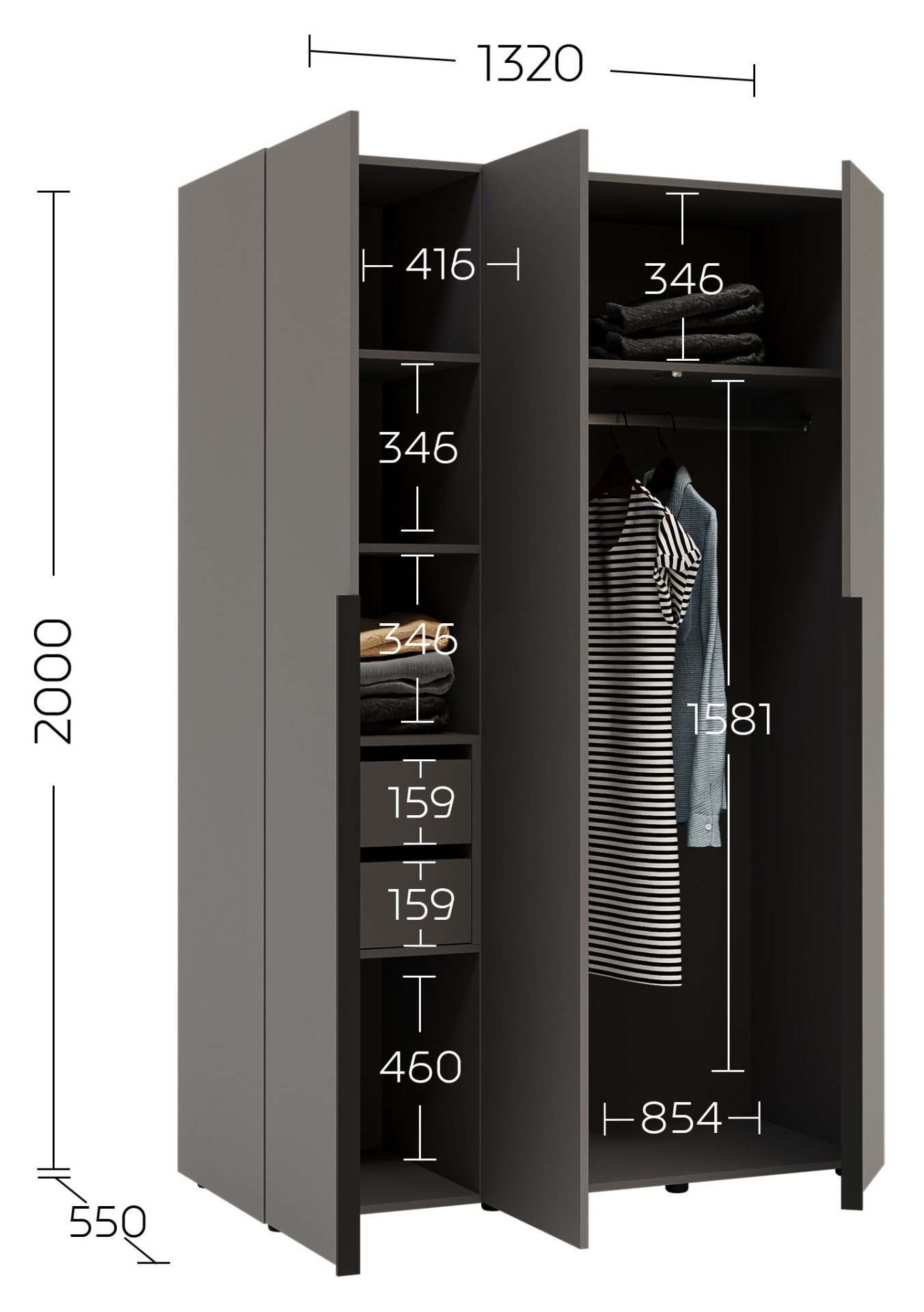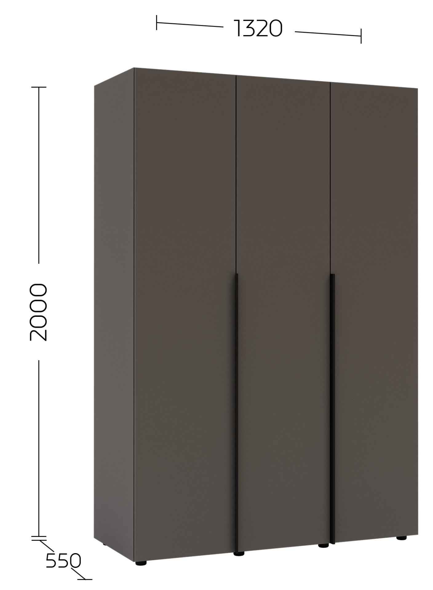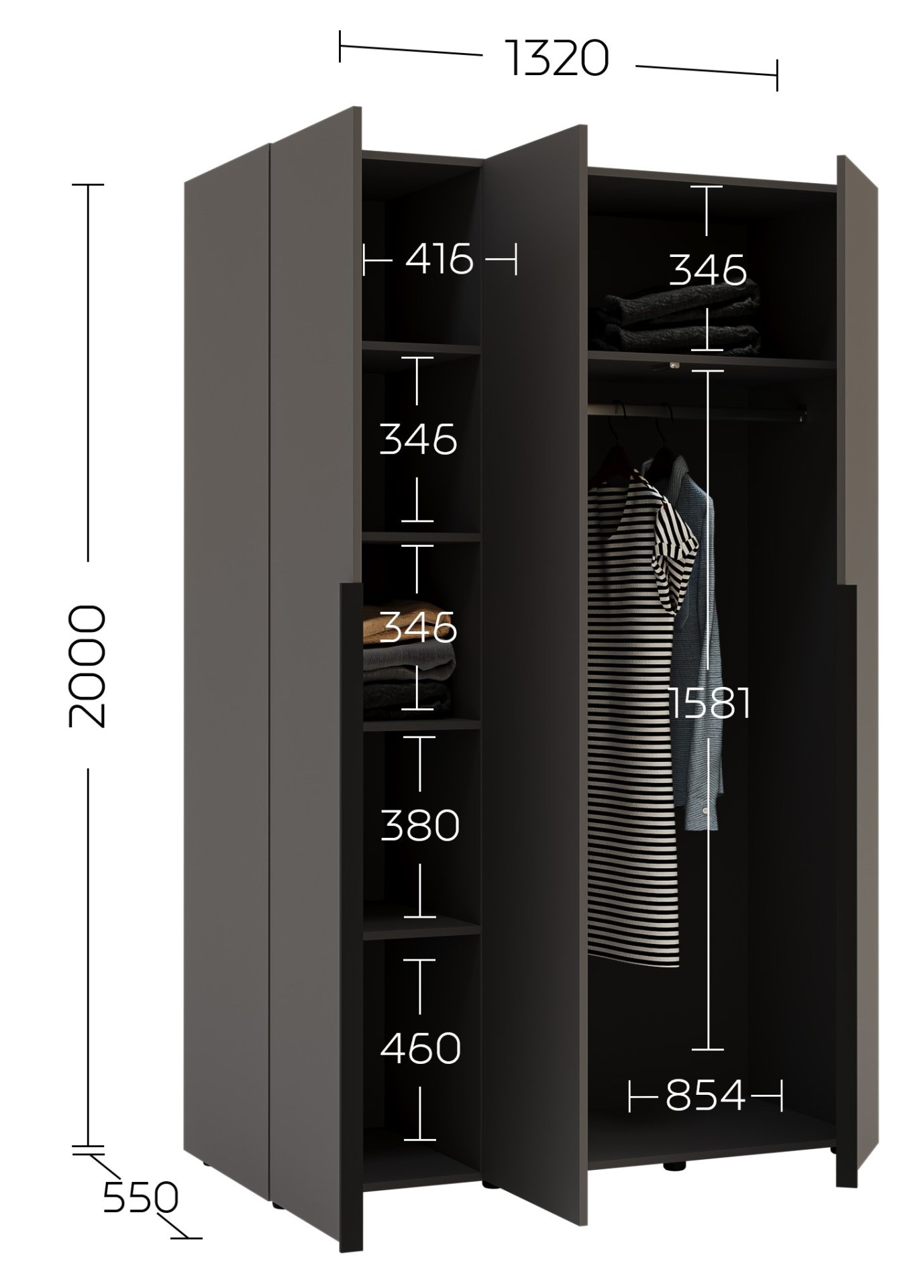 Ormar dimenzija 132x55x200 cm dizajniran je tako da se odlično uklapa u većinu prostora, a da pritom ne zauzima previše površine. Boja grafitno sivog tona osigurava moderan izgled koji se lijepo slaže i s minimalističkim i s klasičnim unutarnjim stilovima. Metalne ručke dodaju dašak elegancije, dok skrivene podesive noge omogućuju stabilnost i na nešto neravnijim podovima, bez narušavanja estetskog izgleda.