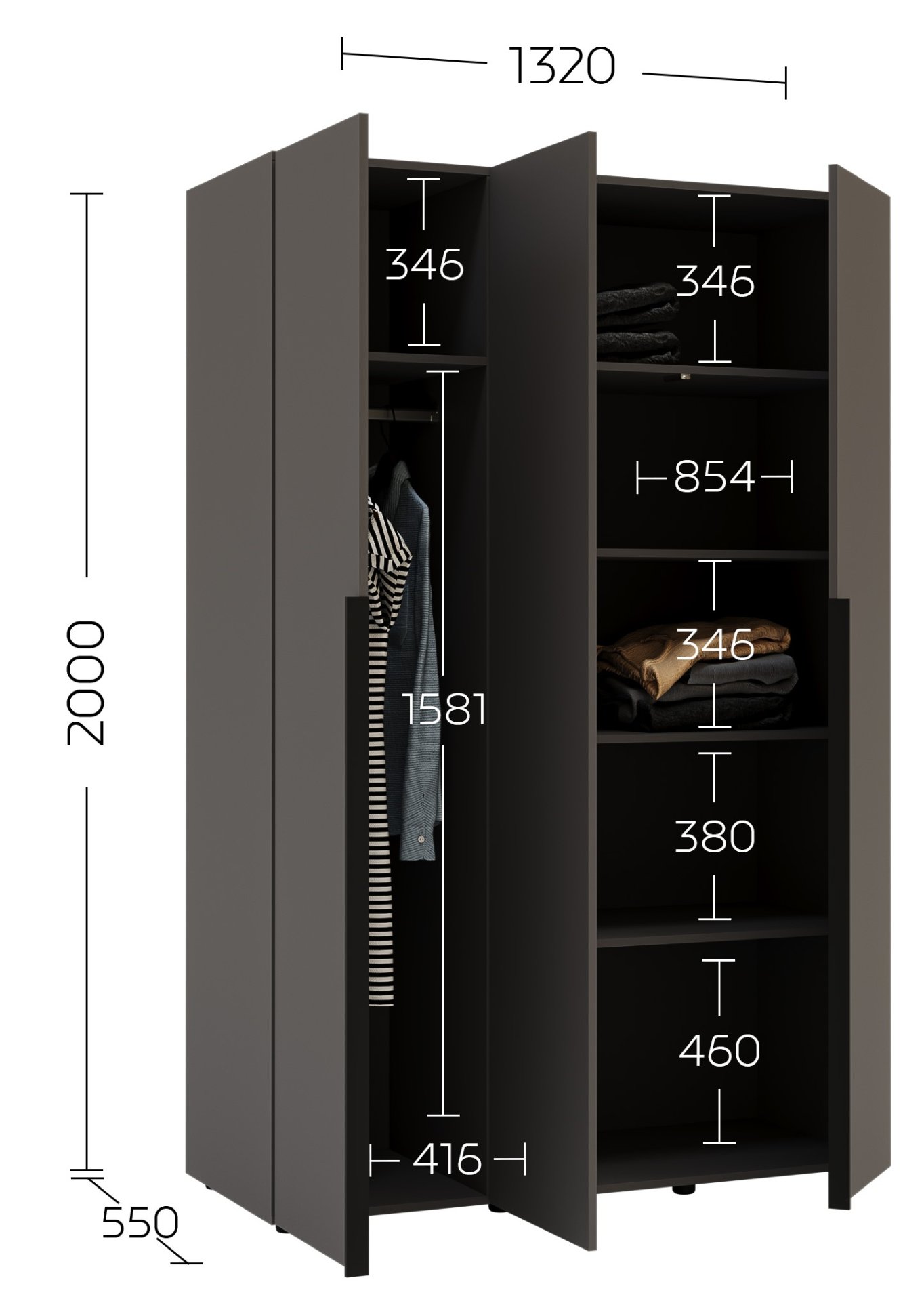 S dimenzijama 132x55x200 cm ormar nudi dovoljno prostora za pohranu sve vaše odjeće i dodataka. Unutra se nalaze prostrene ladice, police i dio s vješalicama koji omogućuju savršenu organizaciju garderobe. Tako ćete uvijek imati pregled nad svojim stvarima – od elegantnih haljina do svakodnevnih odjevnih komada. Osim toga, moguće je dodatno kupiti i gornji ormar koji pruža dodatnu površinu za pohranu sezonske odjeće, posteljine ili drugih predmeta koje ne trebate svakodnevno.