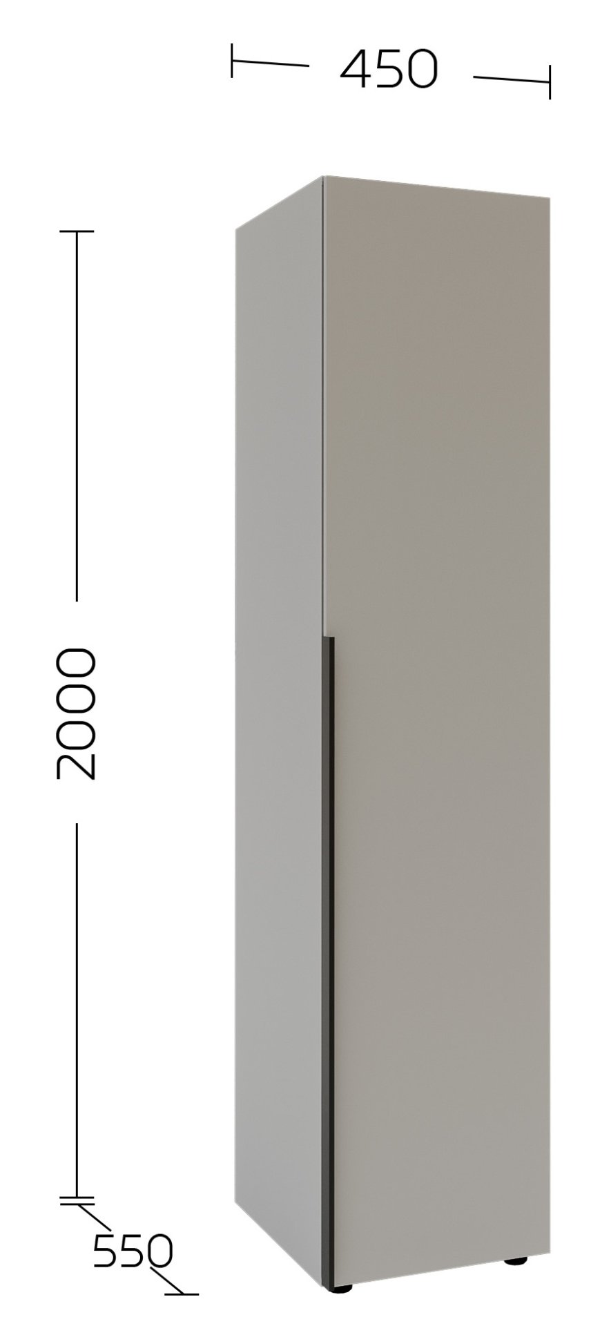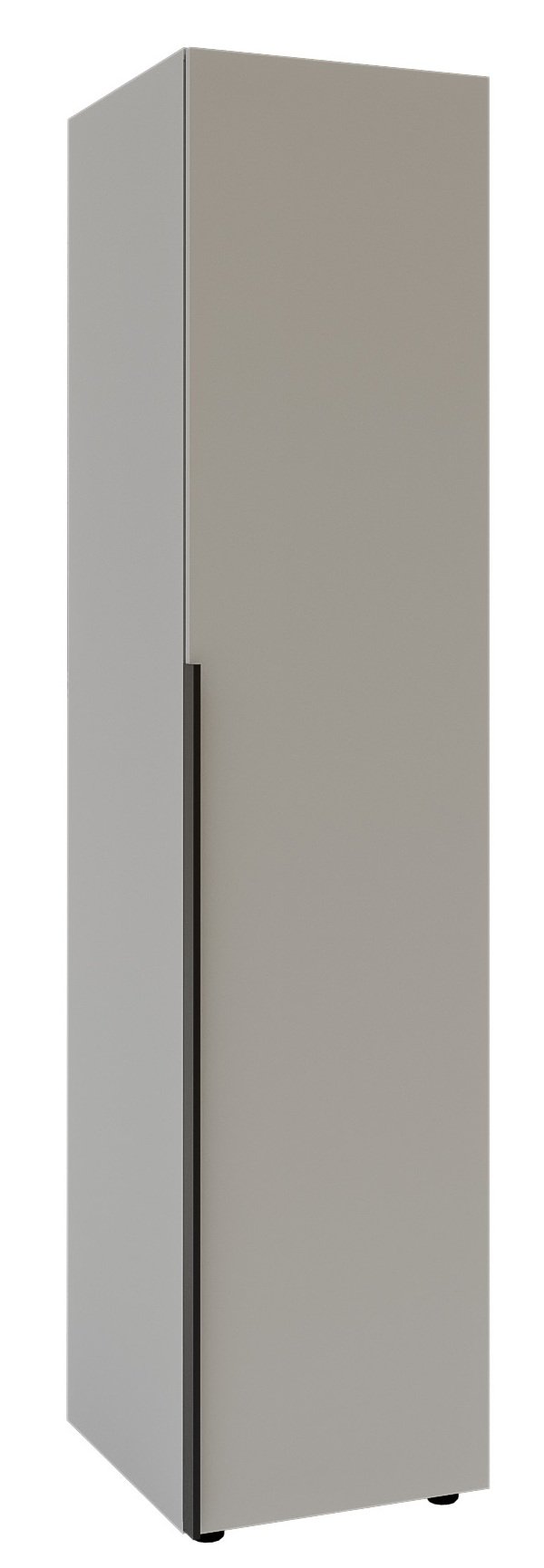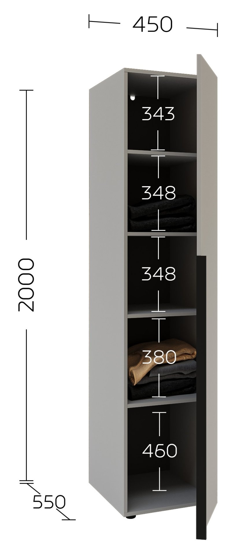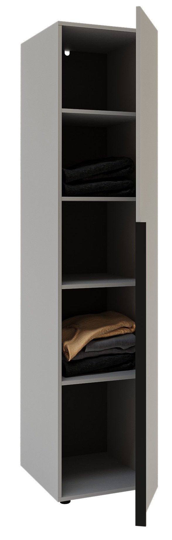 Unutrašnjost garderobnog ormara dizajnirana je s mišlju na optimalno pohranjivanje. Više prostranih polica omogućuje uredno spremanje odjeće, posteljine, torbi ili drugih osobnih predmeta. Zbog jednostrukih vrata ormar je idealan izbor za manje prostore, gdje je važan svaki kvadratni centimetar, ali unatoč kompaktnim dimenzijama (45x55x200 cm) nudi iznenađujuće mnogo korisnog prostora.