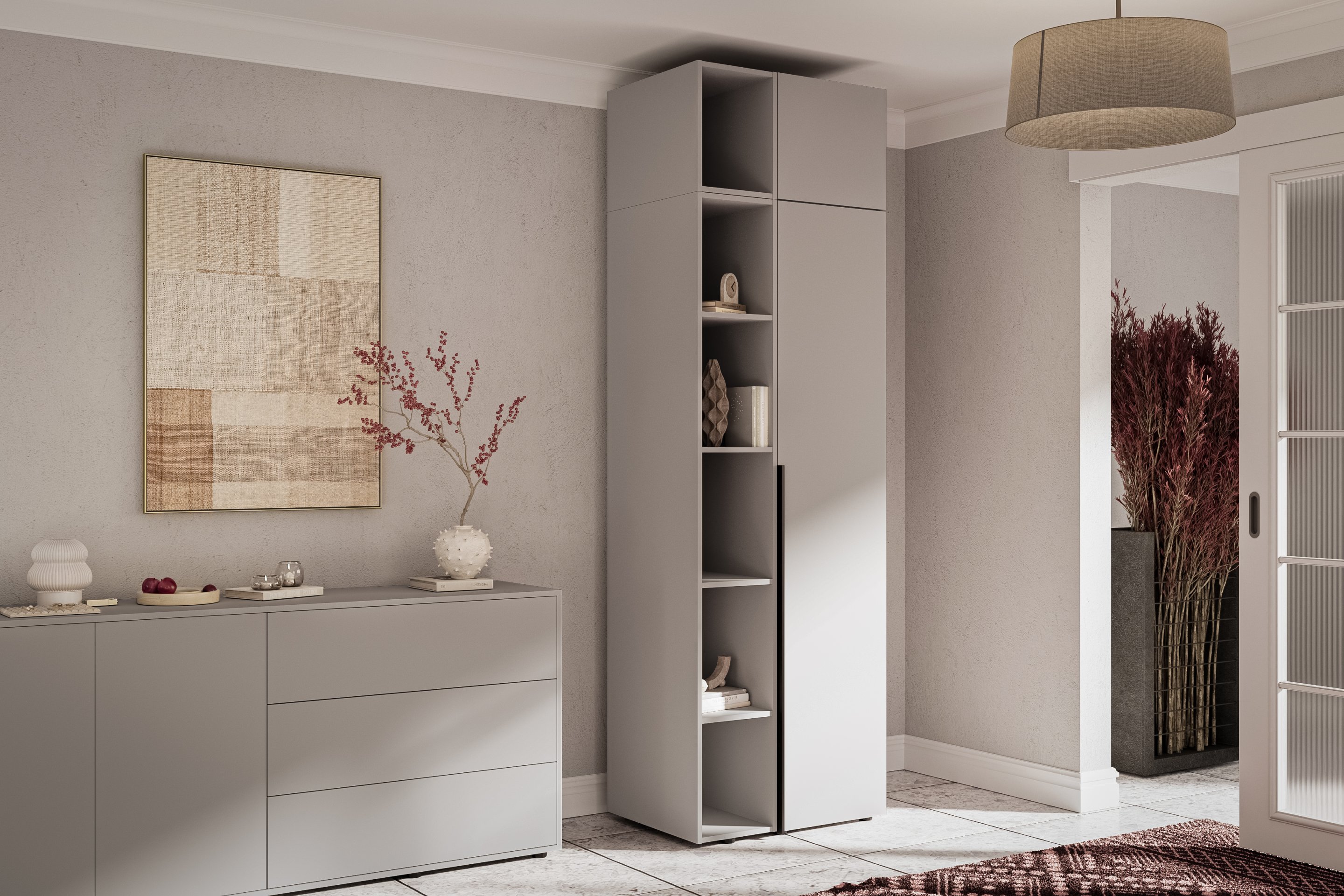 Siva boja garderobnog ormara donosi osjećaj mira i profinjenosti, a istovremeno omogućuje jednostavno kombiniranje s drugim komadima namještaja. Zbog svoje neutralnosti lijepo se slaže i sa suvremenim minimalističkim interijerima i s klasičnim drvenim elementima. Metalne ručke dodaju dašak modernosti i izdržljivosti, dok skrivene podesive noge omogućuju potpunu stabilnost i na nešto neravnijim podovima.