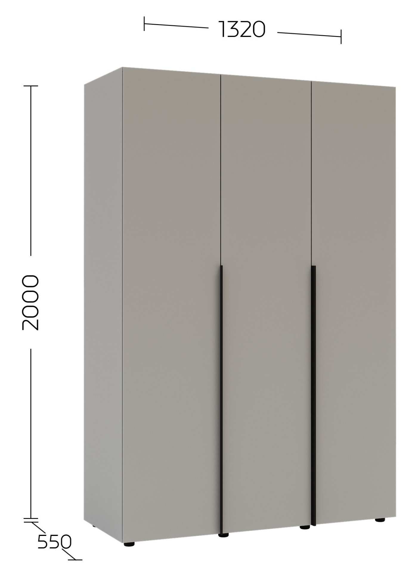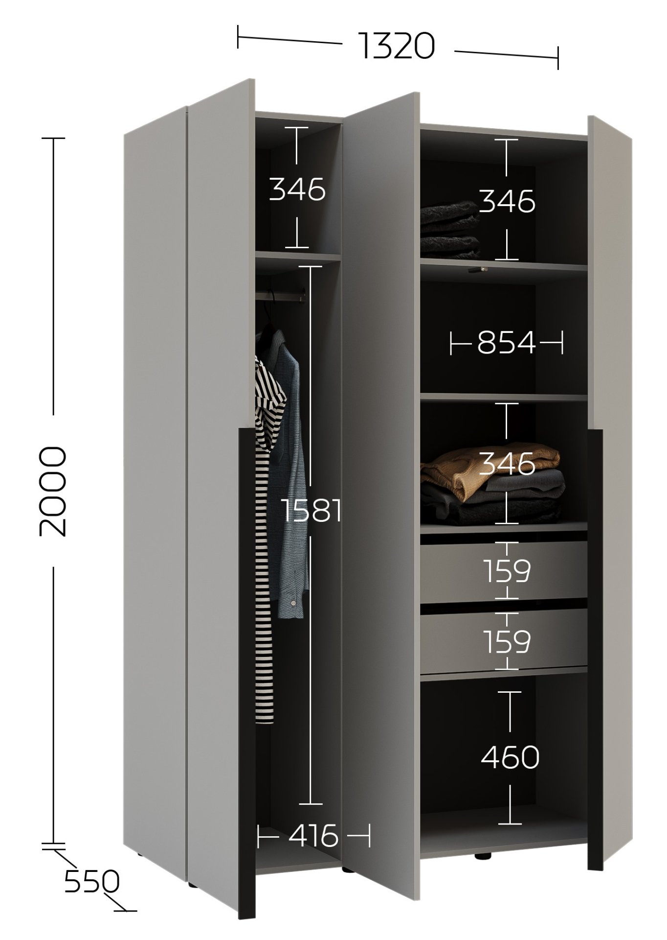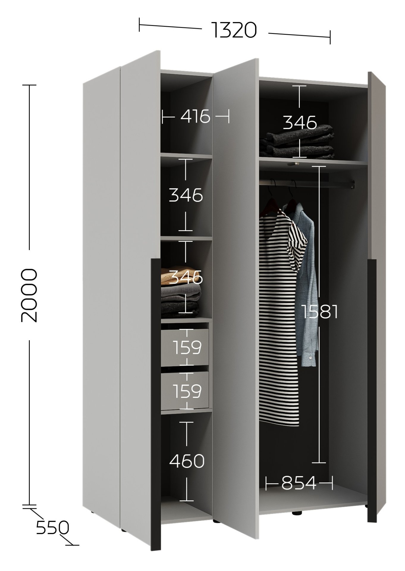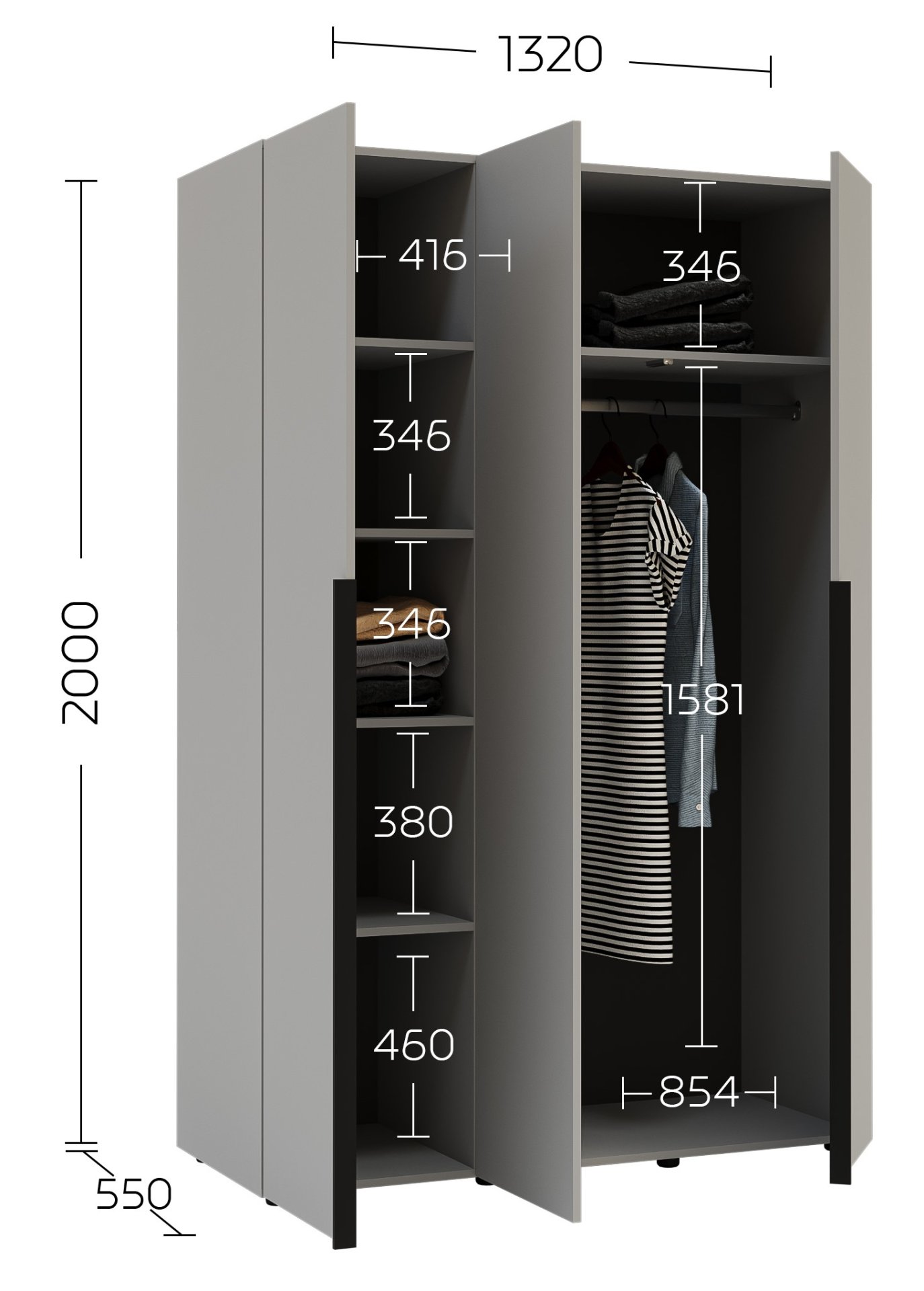 Dimenzije 132x55x200 cm omogućuju optimalno korištenje prostora, a istovremeno osiguravaju dovoljno mjesta za sve vaše potrebe za odjećom. Unutrašnjost ormara osmišljena je tako da omogućuje pregledno pohranjivanje odjeće, modnih dodataka i drugih osobnih predmeta. Tri prostrana odjeljka omogućuju učinkovitu organizaciju – vješalice za odjeću, police za složene komade i prostor za kutije ili cipele.