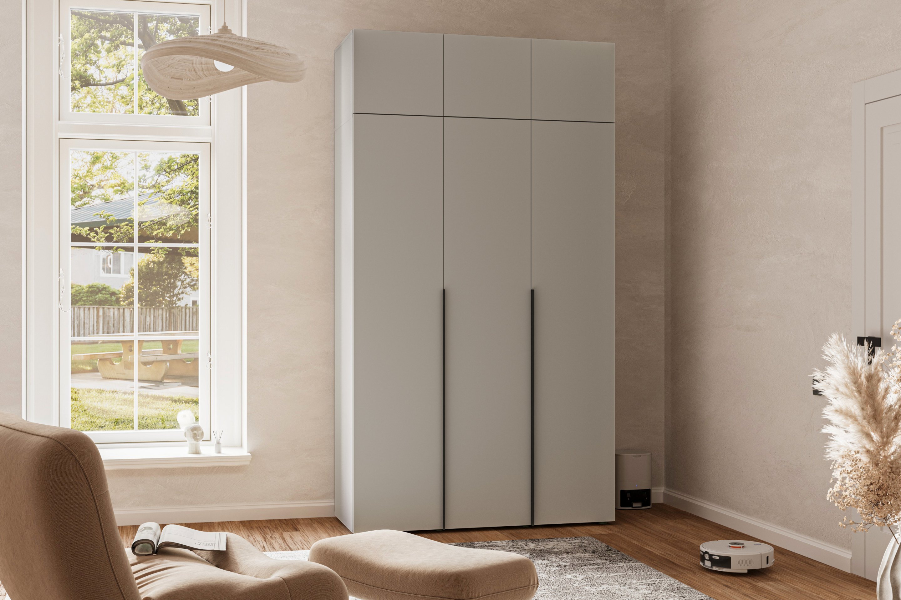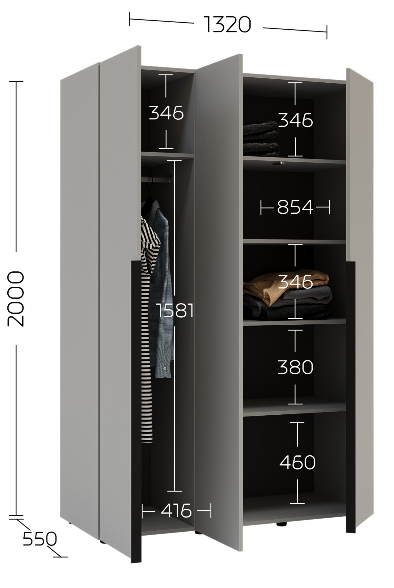 Dimenzije 132x55x200 cm omogućuju optimalno iskorištavanje prostora u svakom domu. Unutrašnjost je osmišljena tako da omogućuje pregledno pohranjivanje – iskoristite veće odjeljke za vješanje odjeće, police za složene komade i prostor za dodatke. Ormar se po želji može nadograditi dodatnim gornjim ormarom, što nudi još više prostora za sezonsku odjeću, posteljinu ili kutije s dodacima.