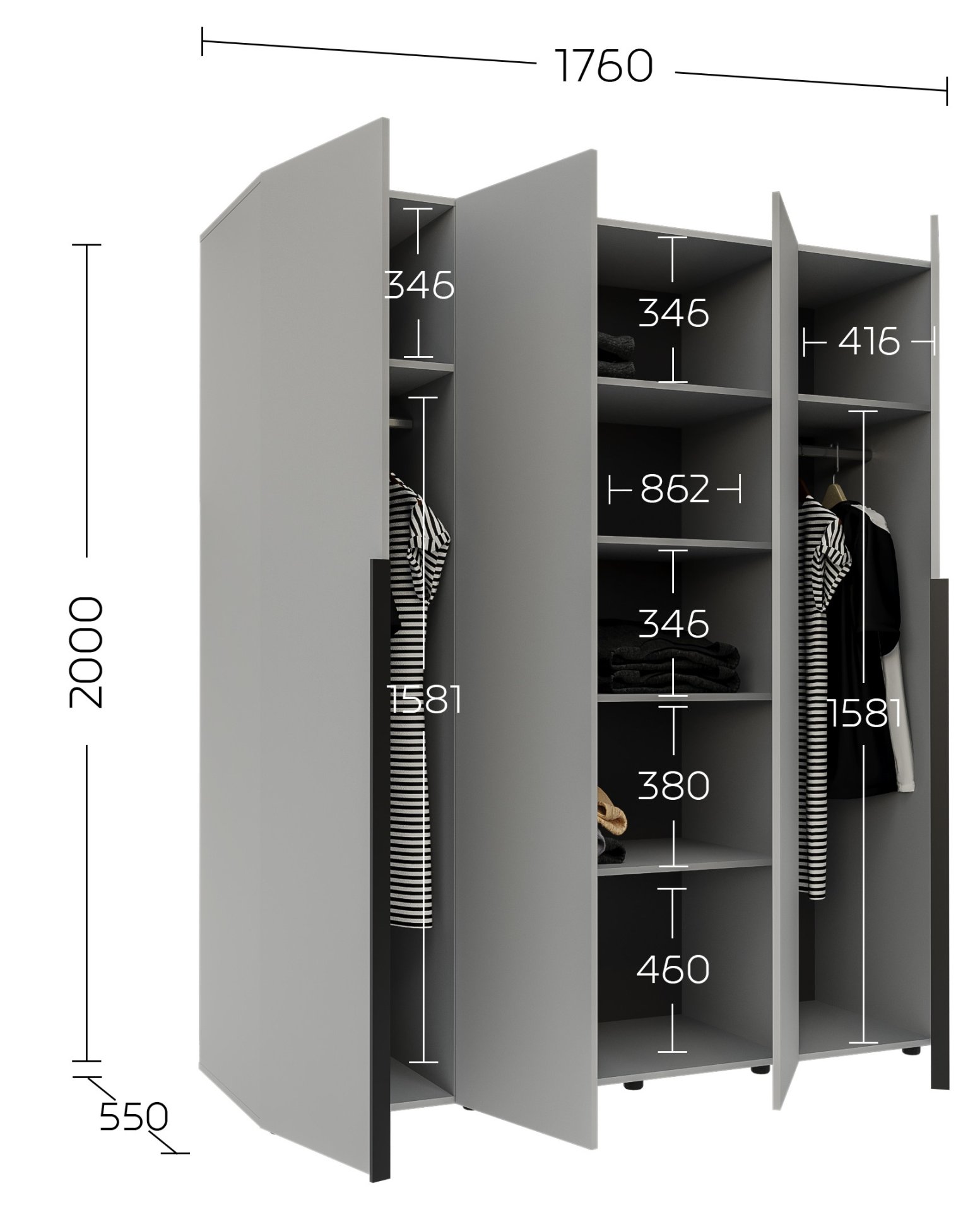 Dimenzije 176x55x200 cm omogućuju optimalno iskorištavanje prostora, a da ormar ne djeluje prevelik ili nametljiv. Unatoč svojim kompaktnim vanjskim mjerama, nudi iznimnu prostranost u unutrašnjosti. U njemu ćete bez poteškoća pohraniti odjeću, sezonske komade, dodatke i posteljinu. Svojim pametnim rasporedom polica i dijelova za vješanje omogućuje preglednost i jednostavan pristup svim predmetima.