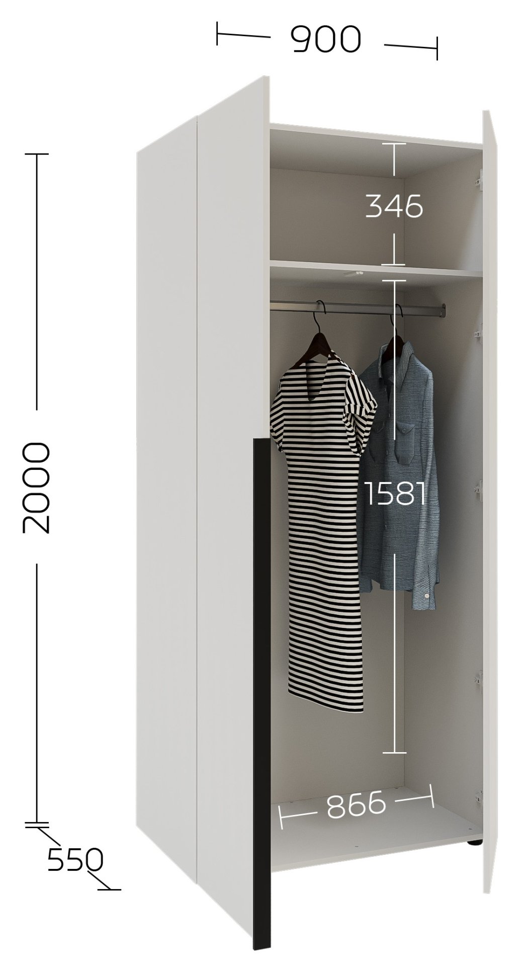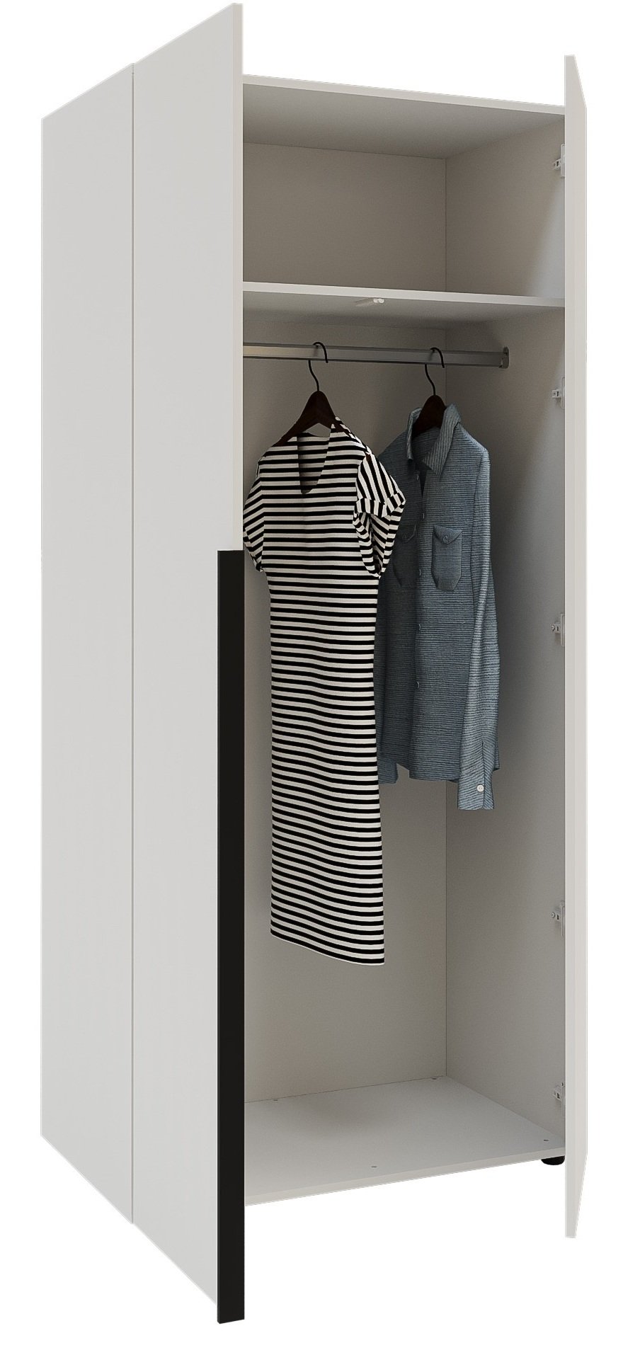 Za razliku od običnih ormara, Solo 2D T osmišljen je s mislima na korisnika. U unutrašnjosti nudi pametan raspored prostora, gdje se mogu kombinirati police i vješalice prema vašim željama. Tako možete jednostavno organizirati garderobu – od dugih kaputa i haljina do manjih komada odjeće i modnih dodataka. Dodatna prednost je mogućnost dokupa gornjeg ormara, koji omogućuje još više prostora za pohranu sezonske odjeće ili posteljine. Ta prilagodljivost znači da ormar možete potpuno prilagoditi svojim potrebama i veličini prostora.