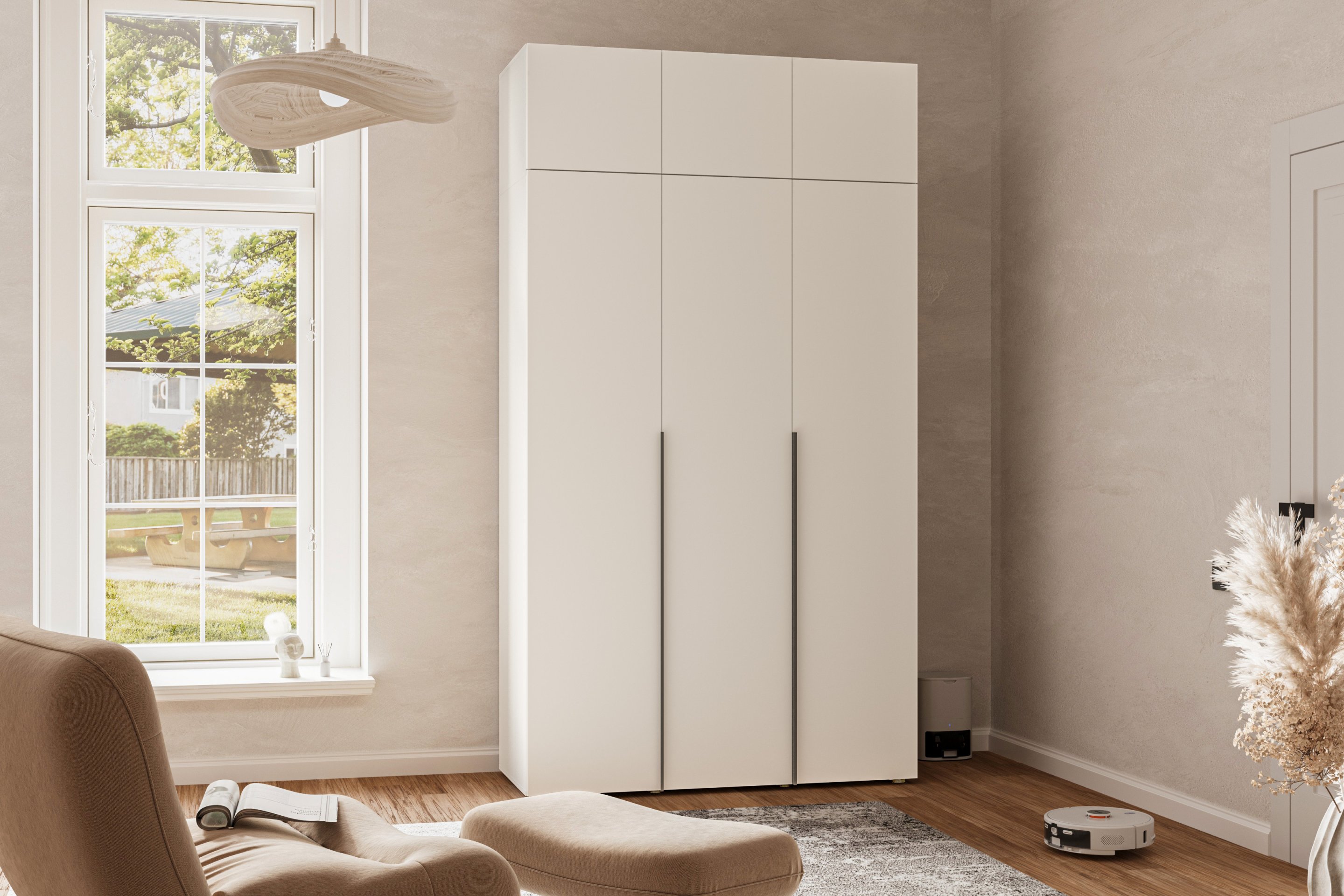 Svaki detalj ovog ormara osmišljen je s mišlju na udobnost i uporabnost. Metalne ručke osiguravaju čvrst prihvat te dodaju dašak suvremene elegancije, dok podesive noge, skrivene u unutrašnjosti, omogućuju potpunu stabilnost i na nešto neravnijem podu. Unutrašnjost ormara funkcionalno je raspoređena – na raspolaganju imate prostrani dio s vješalicom za odjeću, police za složene komade i dodatnu mogućnost da po želji dokupite gornji element te još povećate prostor za pohranu. Ta prilagodljivost omogućuje da ormar potpuno prilagodite svojim potrebama i veličini prostora.