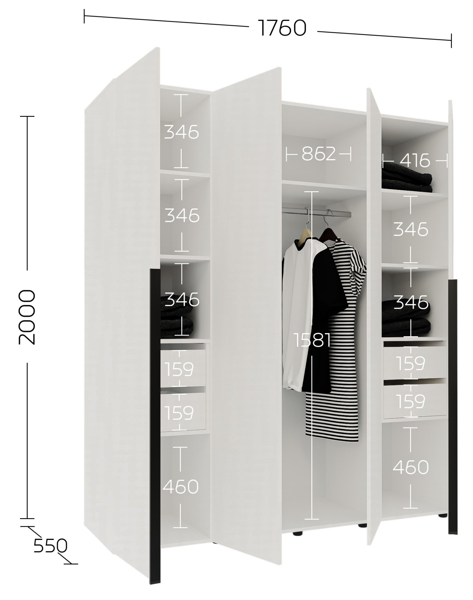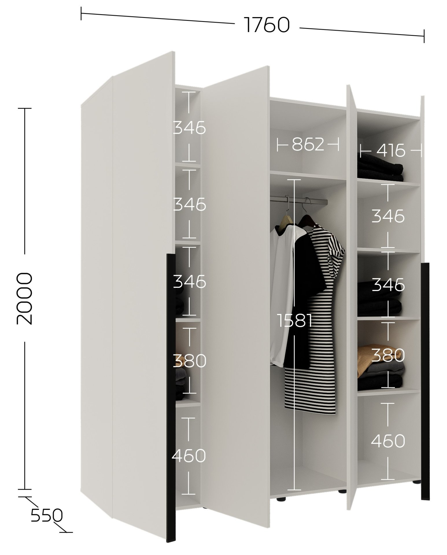 Unutarnji raspored ormara Solo 4D T osmišljen je s mišlju na praktičnost. Iza četiriju vrata skrivaju se prostrani dijelovi s vješalicama i policama, koji omogućuju preglednu organizaciju odjeće – od košulja i haljina do posteljine i sezonskih komada. Dodatnu prednost predstavljaju podesive noge, koje su skrivene unutar konstrukcije i omogućuju potpunu stabilnost i na nešto neravnijem podu.