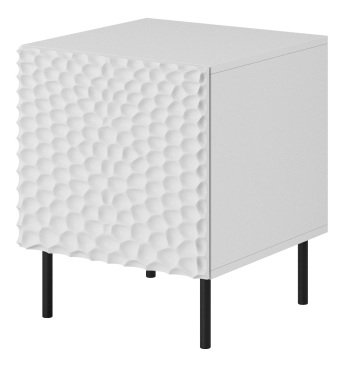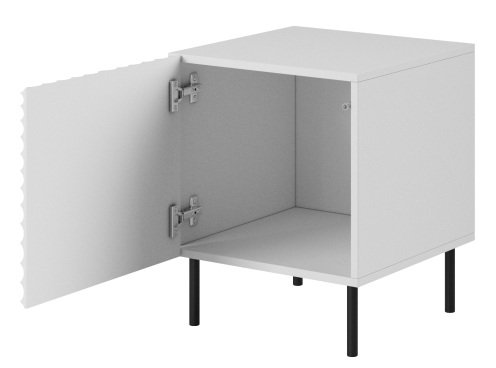 Kombinacija bijele boje i crnih metalnih nogu stvara suptilan kontrast koji naglašava moderan karakter ormarića. Zbog kompaktnih dimenzija komplet se odlično uklapa i u manje spavaće sobe ili garsonijere, gdje je važna optimalna iskoristivost prostora.