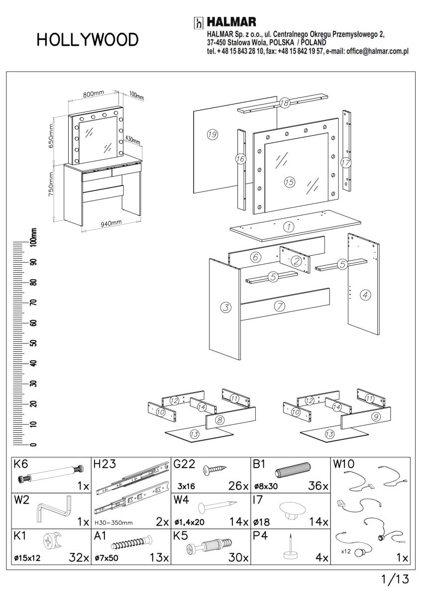 S kompaktnim mjerama, stol za šminkanje Hollywood – Halmar lako se uklapa i u manje spavaće sobe ili garderobne prostore. Unatoč tome, nudi dovoljno radne površine za pohranu kozmetike, kistova, parfema i dodataka. Visina od 140 cm osigurava udobnu upotrebu, bez obzira sjedite li na stolcu ili tabureu.