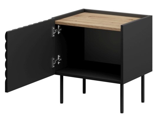 Kombinacija crne boje i toplog dekora hrasta artisan omogućuje da se komplet noćnih ormarića Onda lijepo uklopi kako u moderne minimalističke spavaonice, tako i u klasičnije prostore. Crna boja dodaje dašak elegancije, dok drveni ton donosi toplinu i osjećaj prirodnosti. Zbog uravnoteženog oblika i neutralnih boja komplet se lako kombinira s drugim komadima namještaja – od kreveta i garderobnih ormara do dekorativnih dodataka.