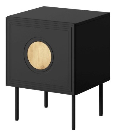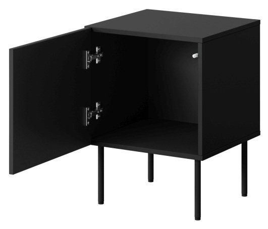 Kućište od laminirane ploče debljine 16 mm izdržljivo je i otporno na svakodnevna opterećenja, dok MDF fronta osigurava glatku površinu i elegantan izgled. Mat obrada smanjuje vidljivost otisaka prstiju i prašine, što olakšava održavanje. Metalne noge u crnoj boji nadopunjuju cjelokupan izgled s osjećajem lakoće, a istovremeno pridonose čvrstoći konstrukcije. Sustav PUSH-CLICK omogućuje meko otvaranje i zatvaranje vrata bez ručkica – samo pritiskom na prednju ploču.