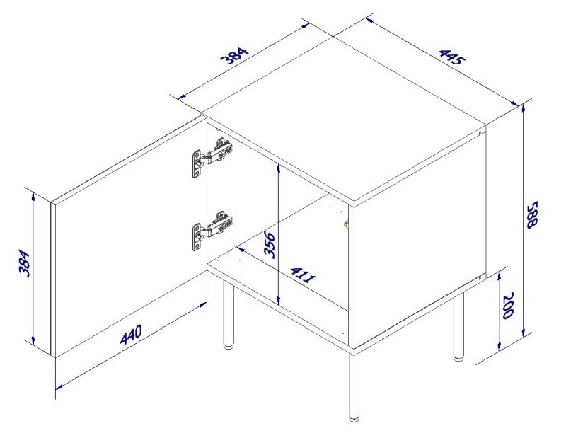 Dimenzije pojedinog ormarića su 59x40x44,5 cm, što omogućuje praktičnu visinu uz krevet i dovoljno prostora za pohranu. Zbog svoje kompaktnosti komplet se lijepo uklapa u različite vrste spavaćih soba – od manjih urbanih prostora do većih, klasično uređenih soba. Visina 20 cm metalnih nogu omogućuje jednostavno čišćenje donjeg dijela i osigurava stabilnost cijele konstrukcije. Minimalistički oblik lako se kombinira s ostalim komadima namještaja, bez obzira na paletu boja prostora.