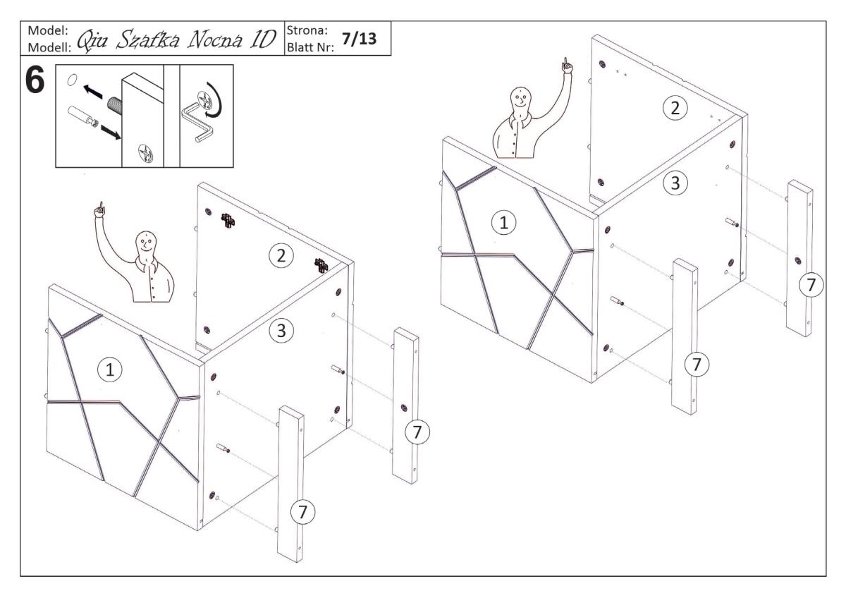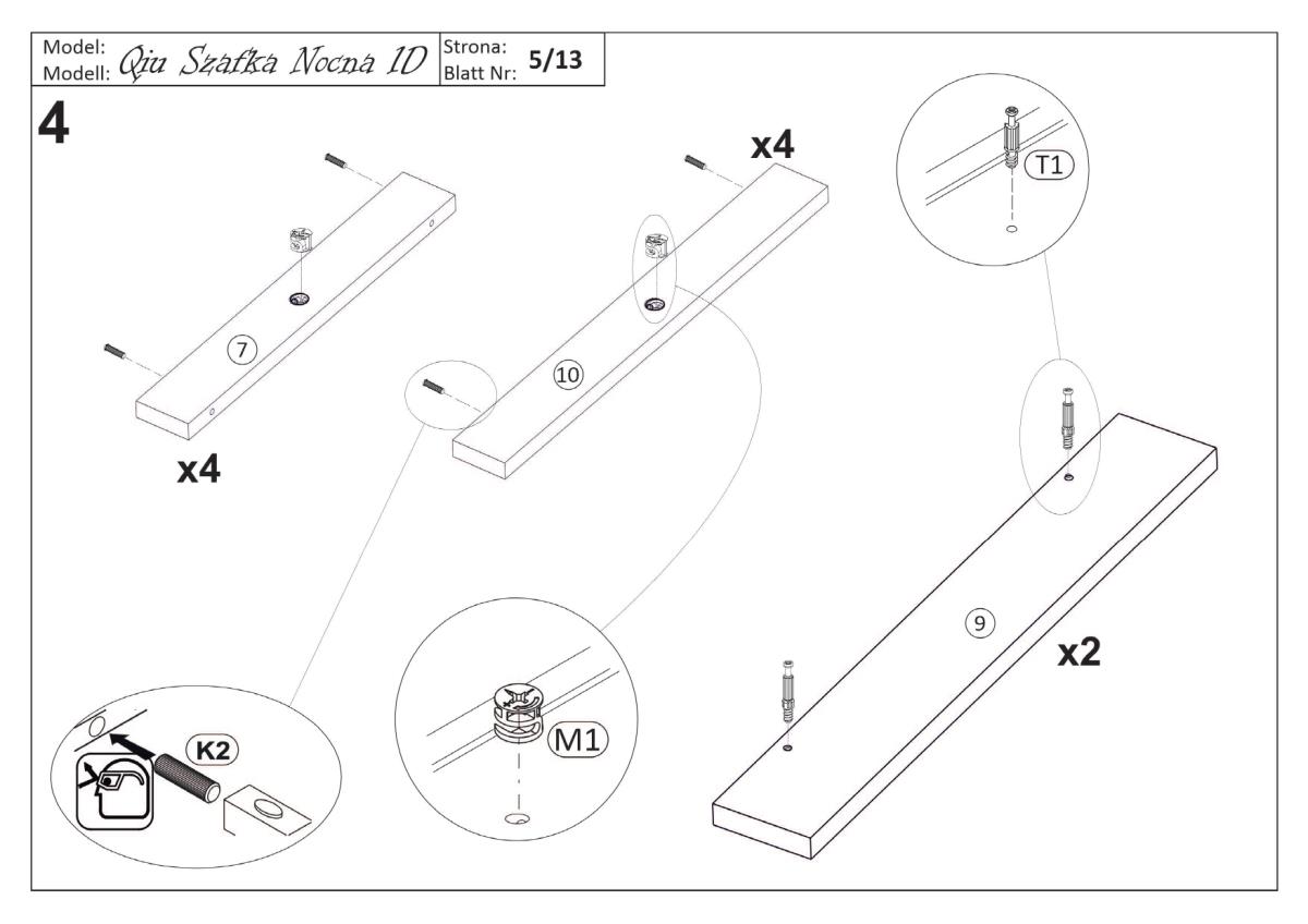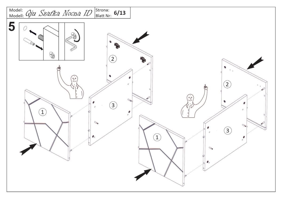 Noćni ormarići stoje na diskretnom postolju – nogama, koje osiguravaju stabilnost i omogućuju jednostavno čišćenje poda ispod namještaja. Funkcionalne ručke dizajnirane su tako da prednje ploče lagano prelaze preko gornje površine, što omogućuje udobno otvaranje ladica bez klasičnih metalnih ručki. Ovo rješenje održava glatku i minimalističku liniju cijelog komada.