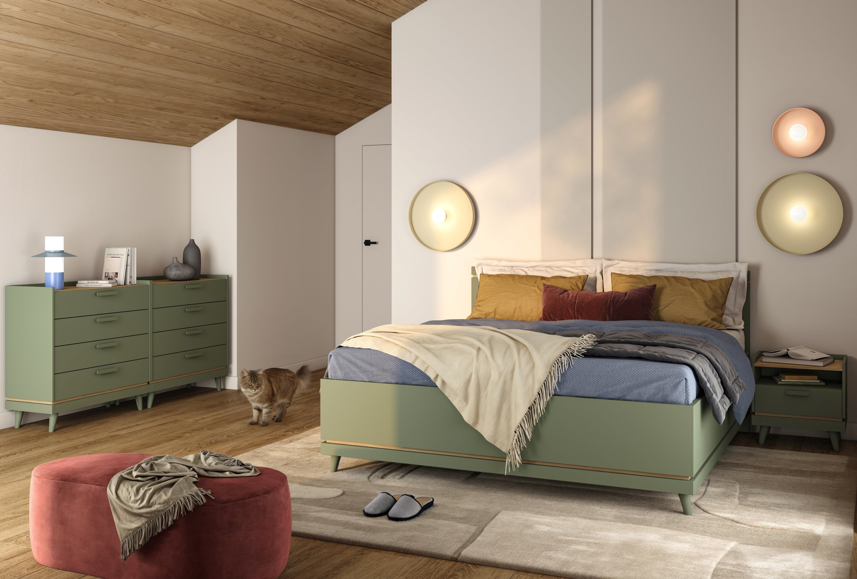 Kombinacija boja izblijedjelog zelenog hrasta s uljenim izgledom i smirene zelene nijanse čini prostor opuštajućim, modernim i ujedno toplim. Ova nijansa prirode idealna je za spavaću sobu jer stvara osjećaj mira i unosi svježinu u svakodnevicu.