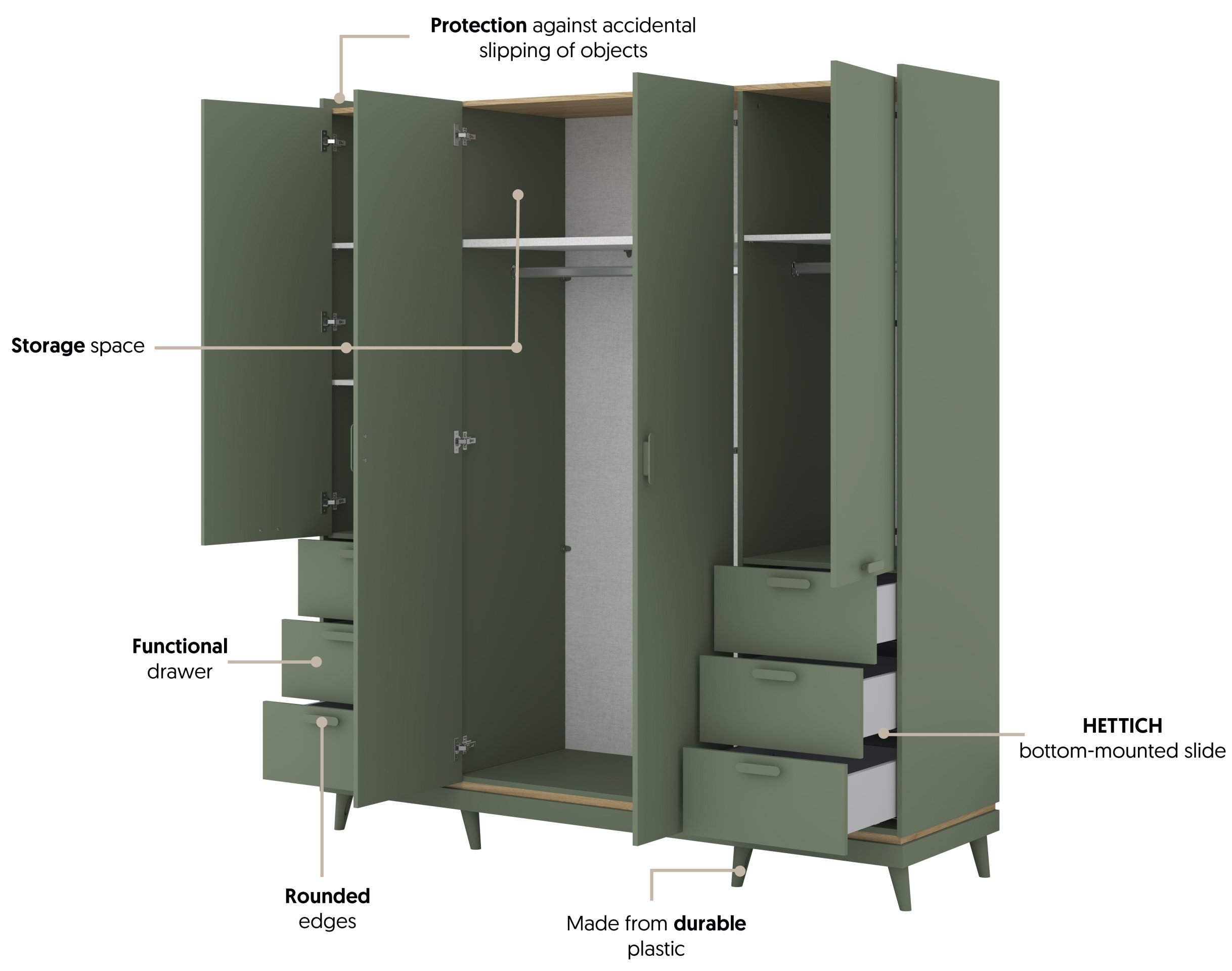 Ako tražite namještaj koji spaja estetiku, funkcionalnost i kvalitetu, ovaj ormar izvrsno je rješenje. Njegov dizajn slijedi trendove suvremenog uređenja interijera, a istovremeno zadržava bezvremensku eleganciju koja nikada ne izlazi iz mode. Zbog svoje neutralne palete boja lako se uklapa u različite kombinacije u prostoru, dok prirodni ton hrasta u kombinaciji sa zelenom unosi toplinu i osjećaj prirodne povezanosti.