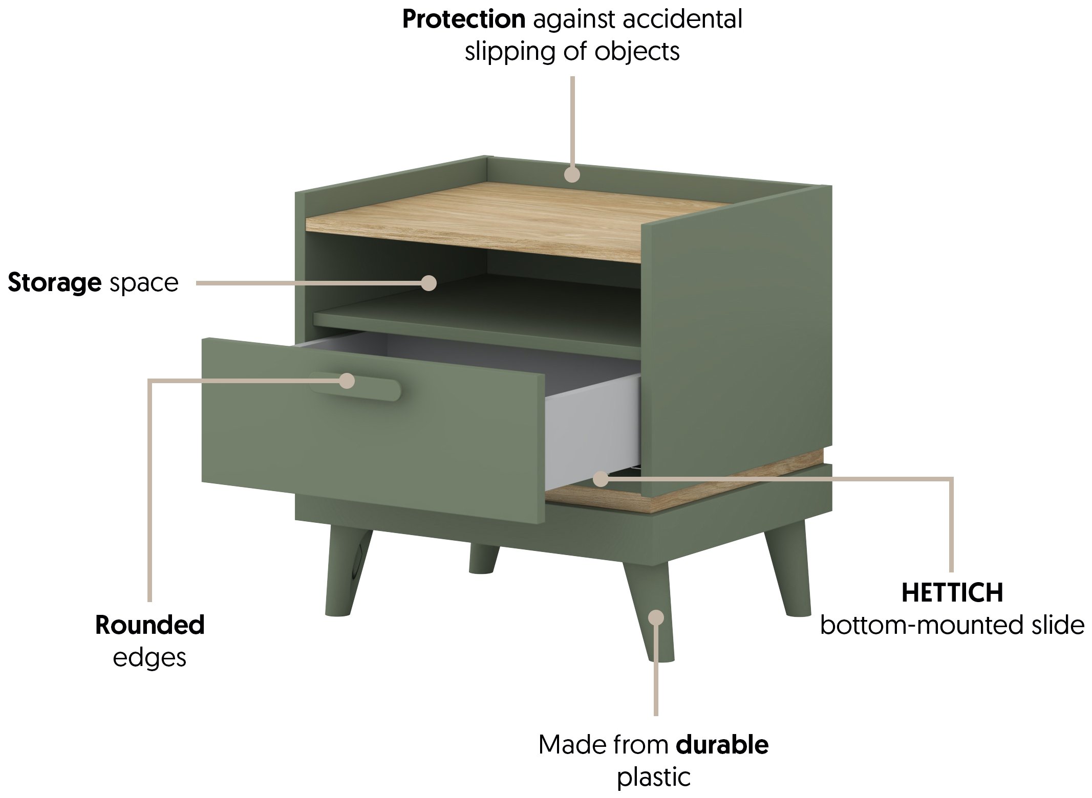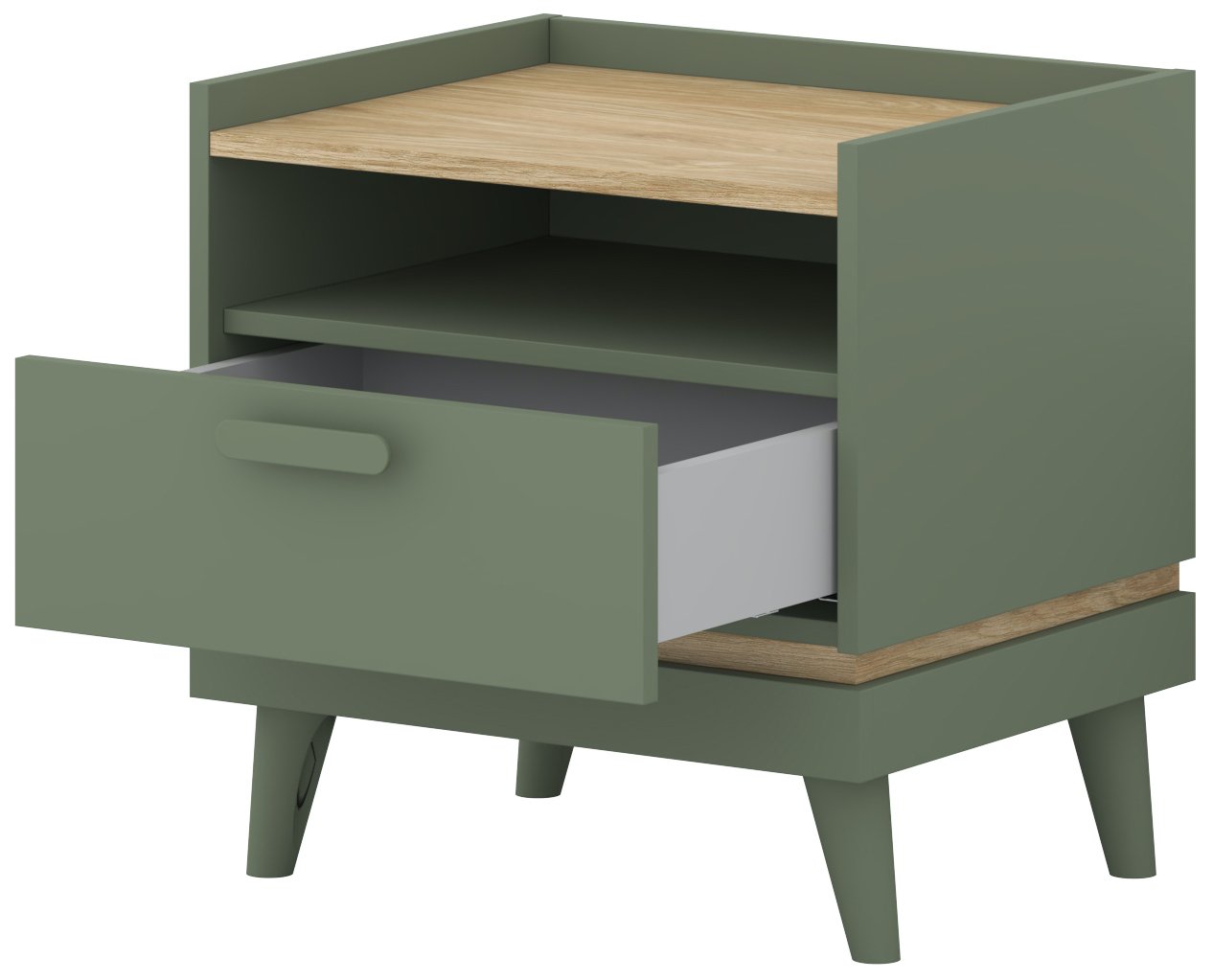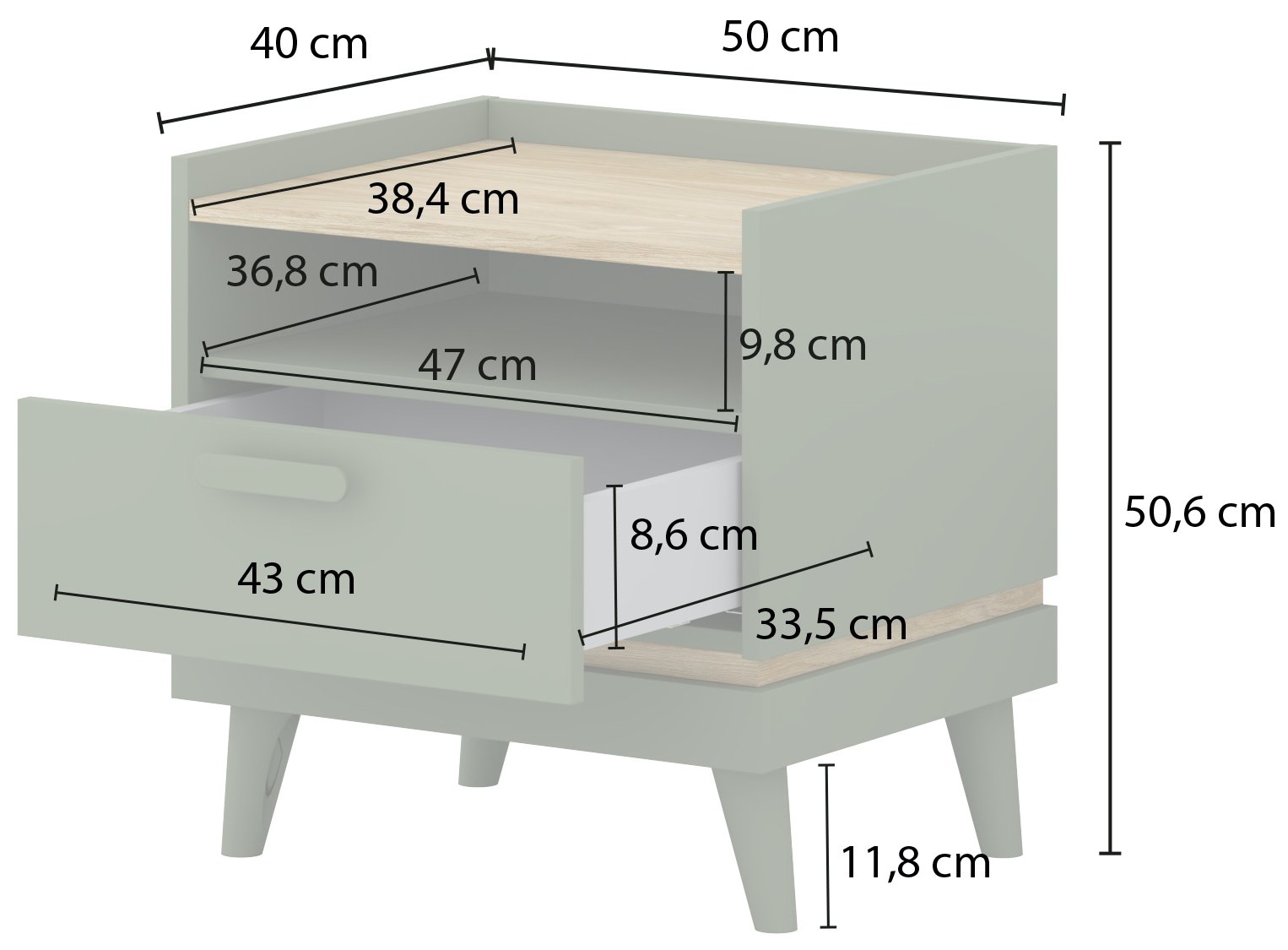 Savršena kombinacija prirodne topline i suvremene elegancije – ovaj noćni ormarić u prekrasnoj nijansi izblijedjele zelene boje s detaljima nauljenog hrasta unosi u spavaću sobu osjećaj svježine, mira i skandinavske jednostavnosti. Svojim minimalističkim oblikom i promišljenim dizajnom savršeno se uklapa u različite stilove uređenja interijera – od modernih do rustikalnih, a istovremeno nudi praktičan prostor za pohranu i uredan izgled prostora.