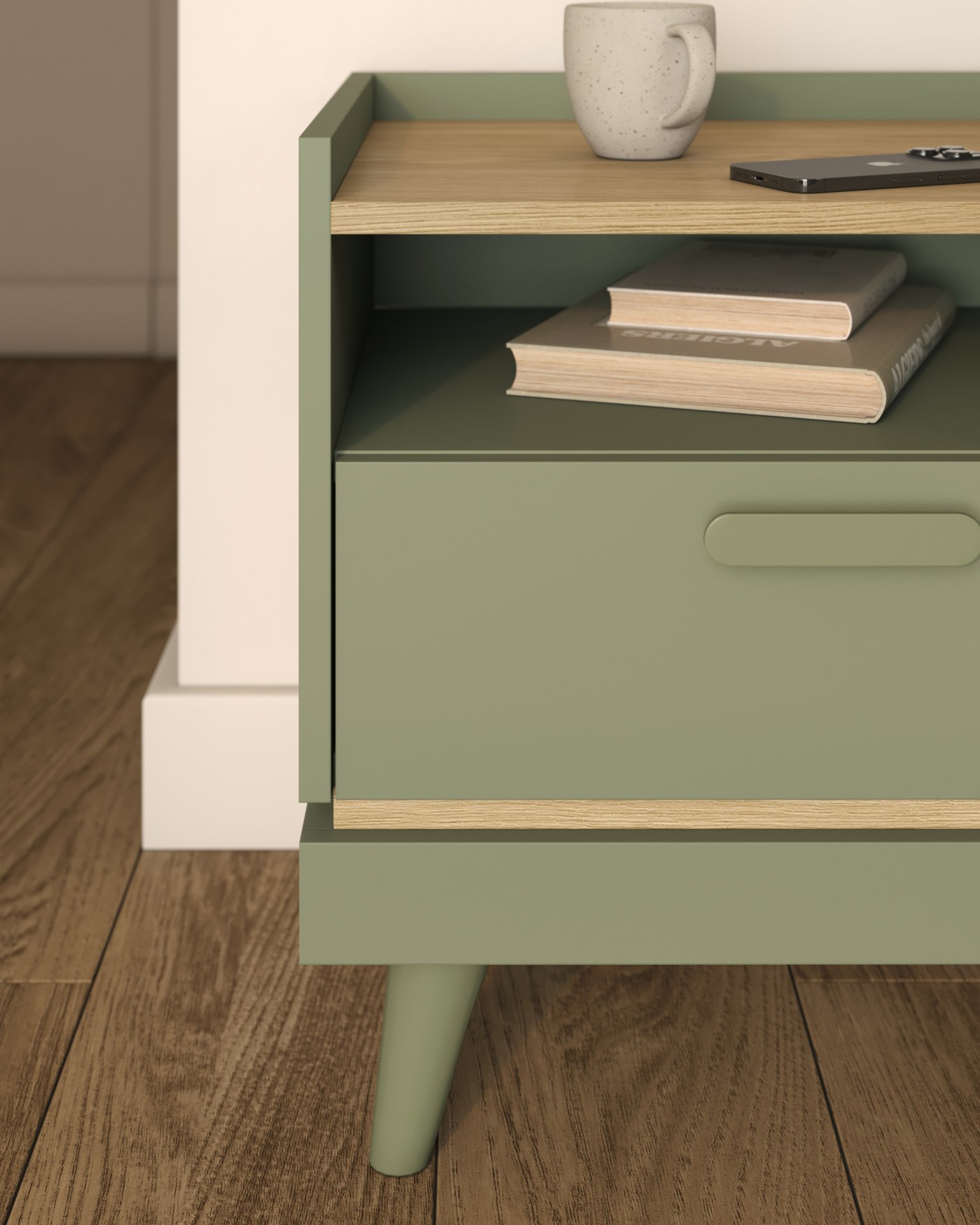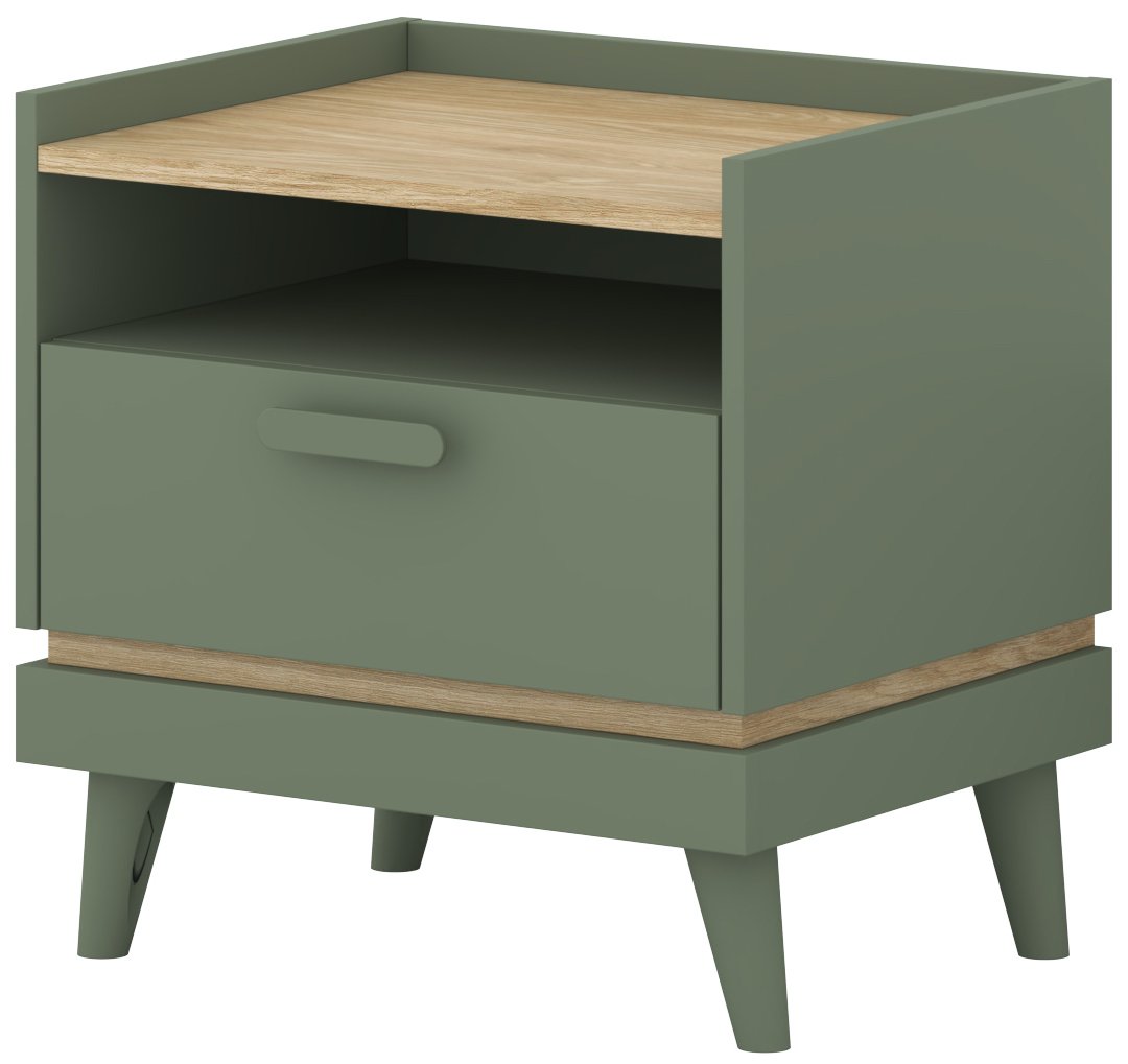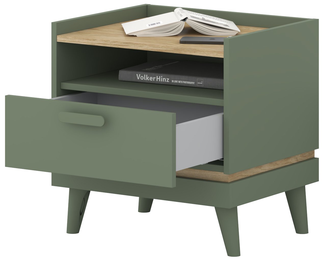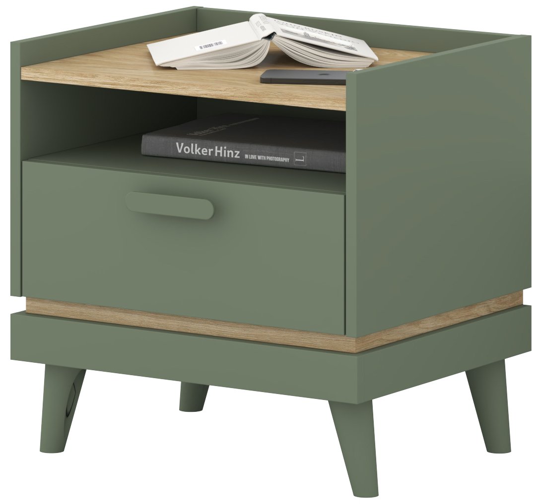 Savršena kombinacija prirodne topline i suvremene elegancije – ovaj noćni ormarić u prekrasnoj nijansi izblijedjele zelene boje s detaljima nauljenog hrasta unosi u spavaću sobu osjećaj svježine, mira i skandinavske jednostavnosti. Svojim minimalističkim oblikom i promišljenim dizajnom savršeno se uklapa u različite stilove uređenja interijera – od modernih do rustikalnih, a istovremeno nudi praktičan prostor za pohranu i uredan izgled prostora.