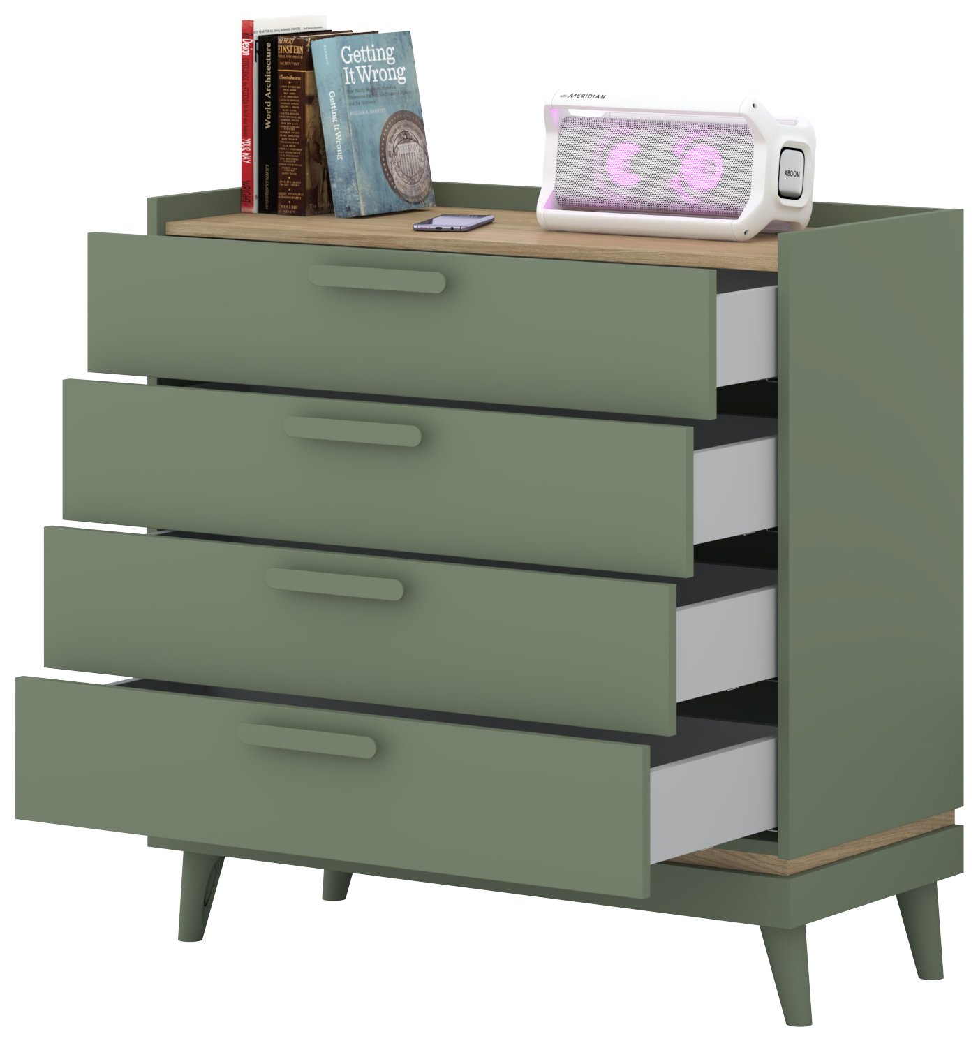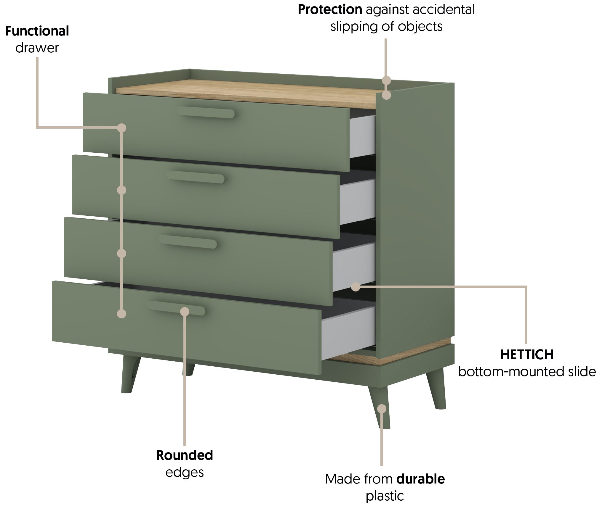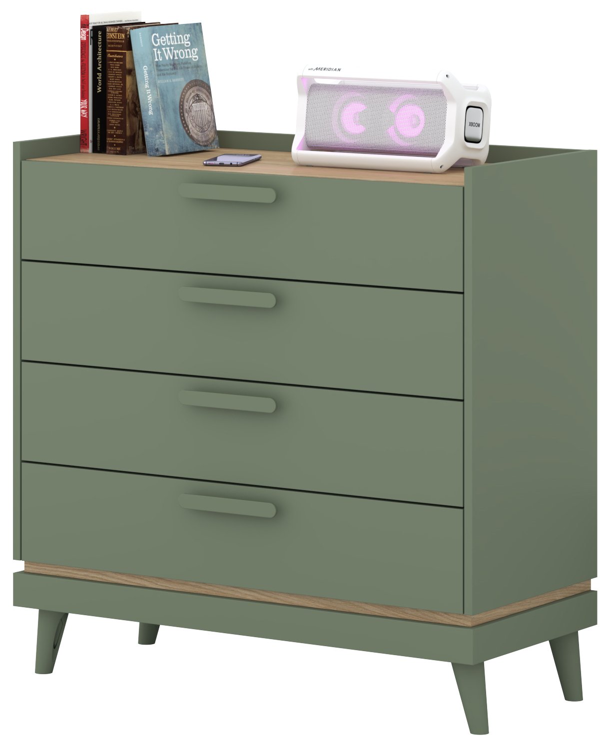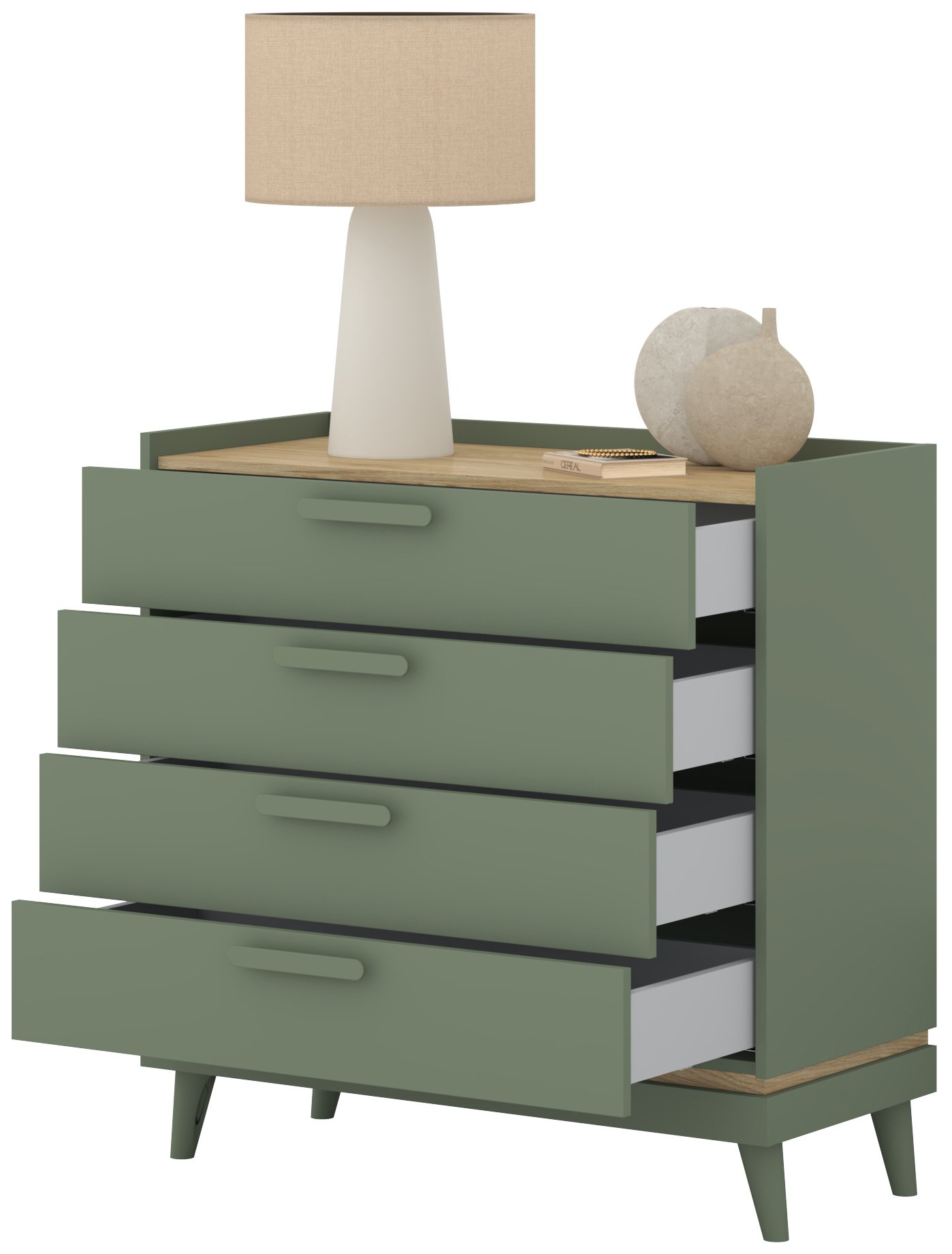 Posebnost ove komode je njezina kombinacija boja – nježna izblijedjela zelena boja stvara osjećaj svježine i prirodne povezanosti, dok topli tonovi hrasta dodaju dozu domaćeg ugođaja i topline. Takva kombinacija boja omogućuje lako uklapanje u različite stilove interijera – od suvremenog minimalizma do rustikalnog ili vintage izgleda.