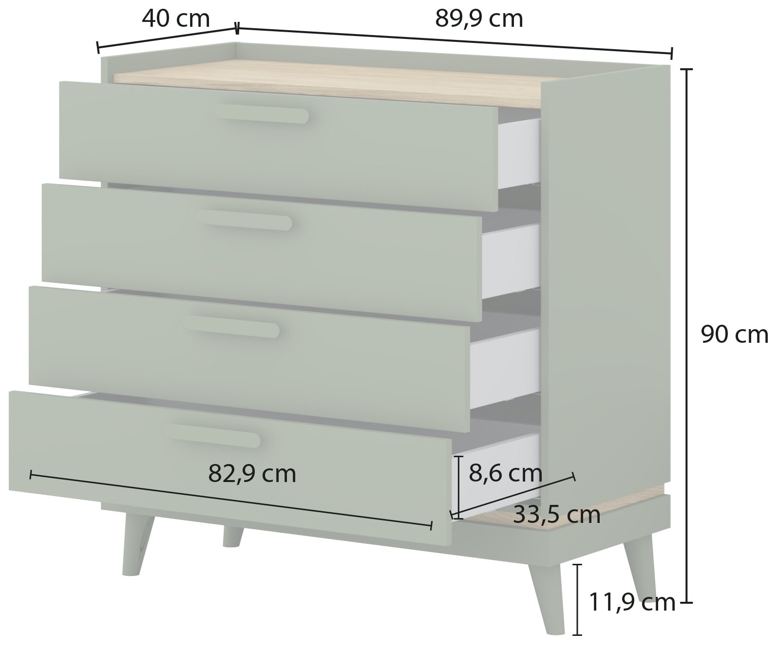 Komoda dimenzija 90x40x90 cm idealan je izbor za dnevni boravak, spavaću sobu, predsoblje ili čak kućni ured. Zahvaljujući optimalnim mjerama, savršeno se uklapa i u manje i u veće prostore. Njezina prostrana unutrašnjost s četiri ladice omogućuje pregledno pohranjivanje odjeće, dokumenata, dodataka ili drugih osobnih predmeta koje želite imati uvijek pri ruci, a istovremeno uredno pospremljene.