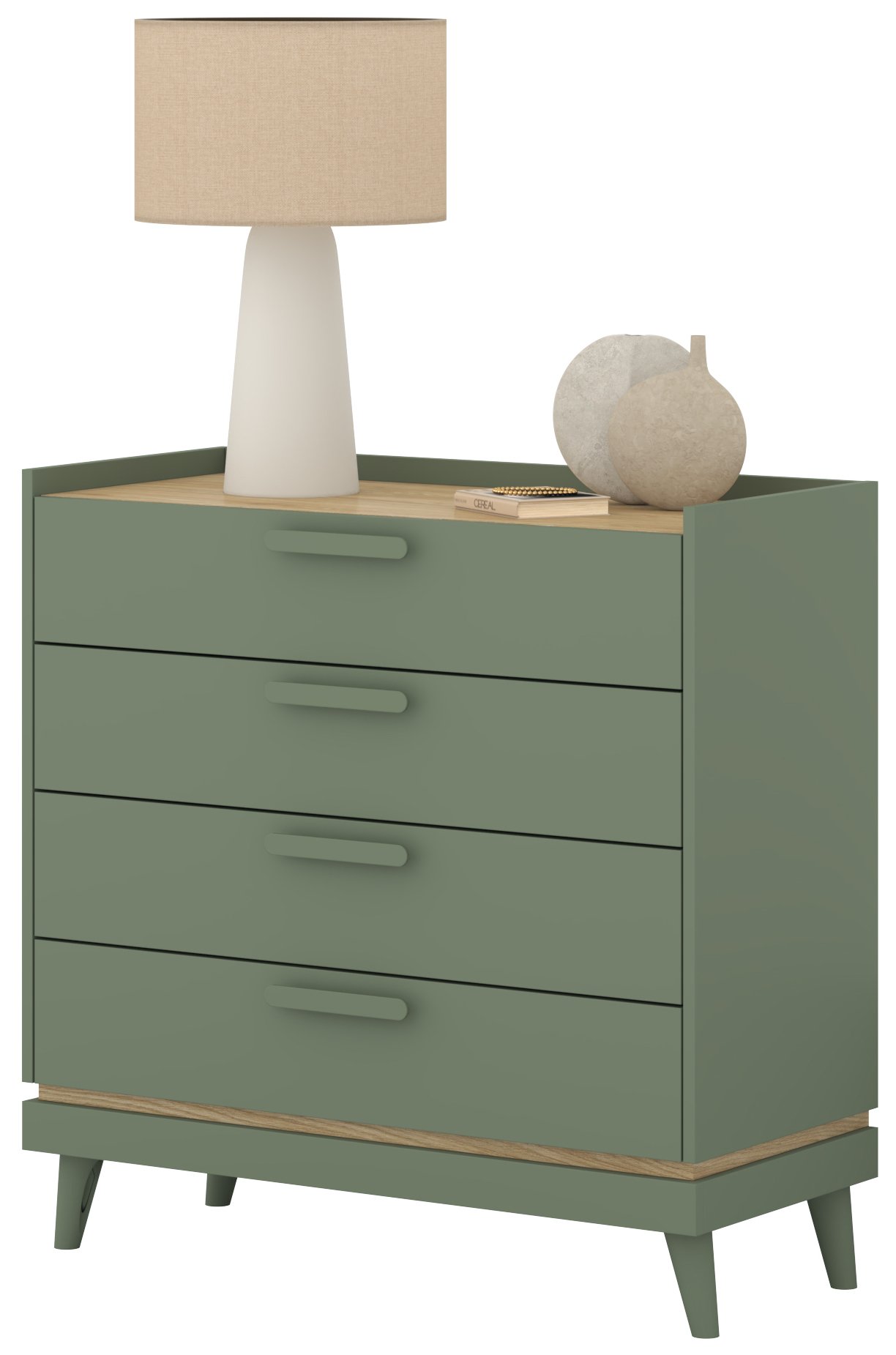 Savršena kombinacija suvremenog izgleda i bezvremenske elegancije skriva se u ovoj iznimnoj komodi, koja svojom izblijedjelom zelenom bojom i toplim tonom uljem obrađenog hrasta donosi u svaki dom osjećaj smirenosti, prirodne svježine i nordijske jednostavnosti. Njezin je dizajn nadahnut minimalističkom estetikom skandinavskog stila, koji naglašava funkcionalnost, čiste linije i prirodne materijale – sve to objedinjeno je u komadu namještaja koji će vašem prostoru dodati karakter i toplinu.