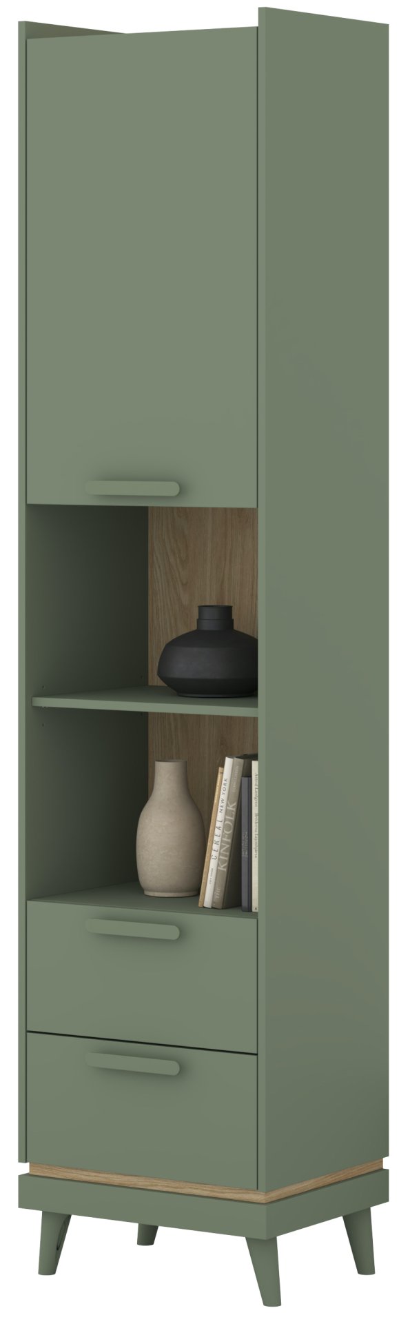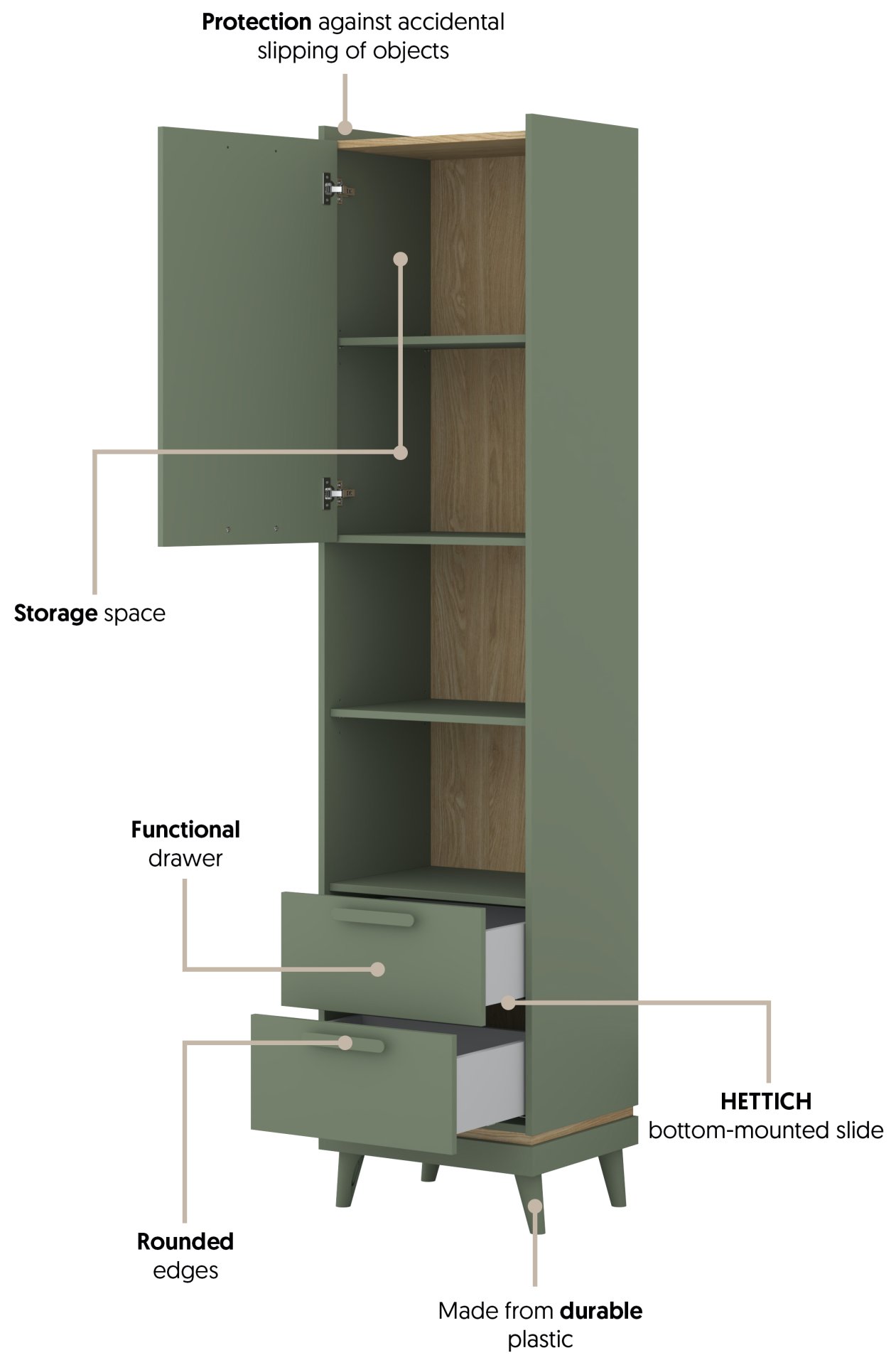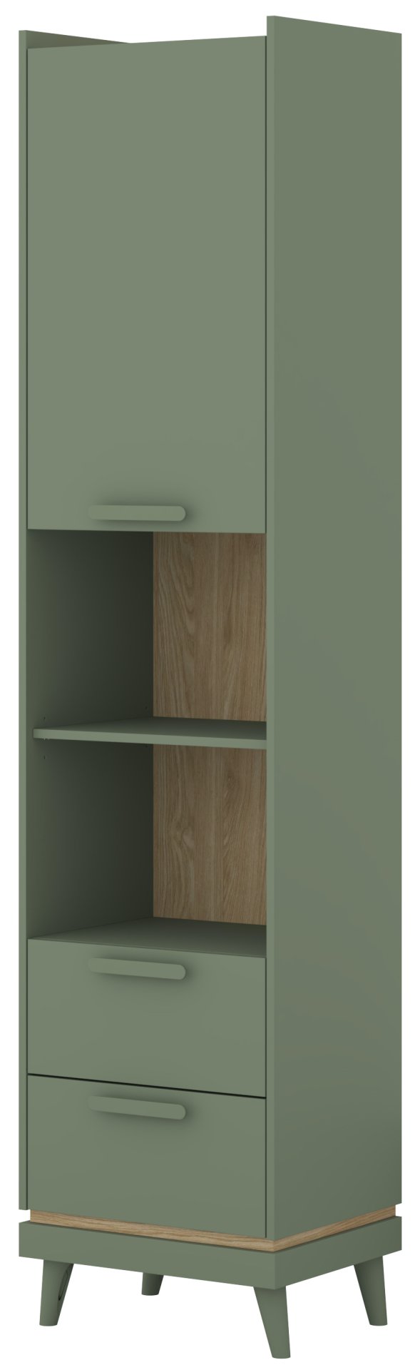 Ormar Scandi 2 savršen je izbor za sve koji cijene kvalitetu, estetiku i funkcionalnost. Njegov promišljen dizajn omogućuje da u vaš dom unese red i eleganciju, a pritom stvara ugodnu, prirodnu atmosferu. Idealan je za moderna stanovanja gdje je važno da svaki komad namještaja ima svoju svrhu i skladno se uklapa u okolinu. S njim ćete stvoriti prostor koji diše toplinom drveta i suptilnom svježinom zelene boje.