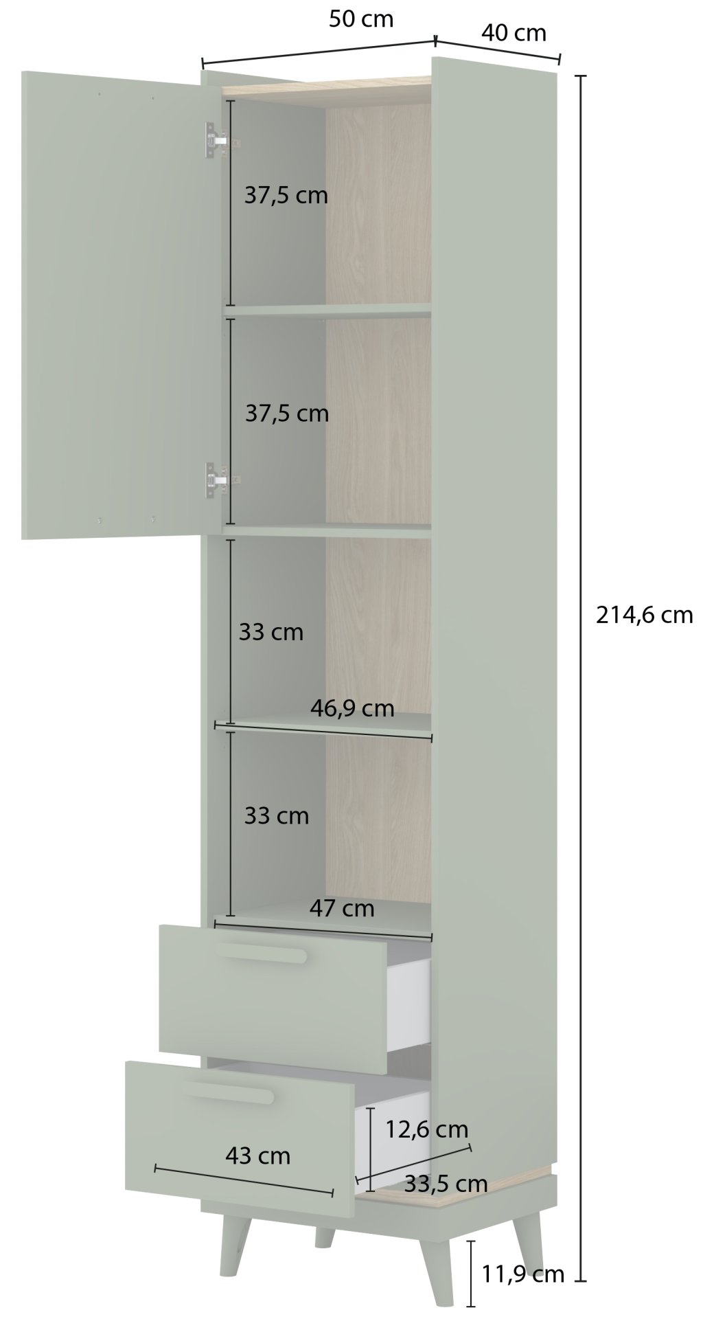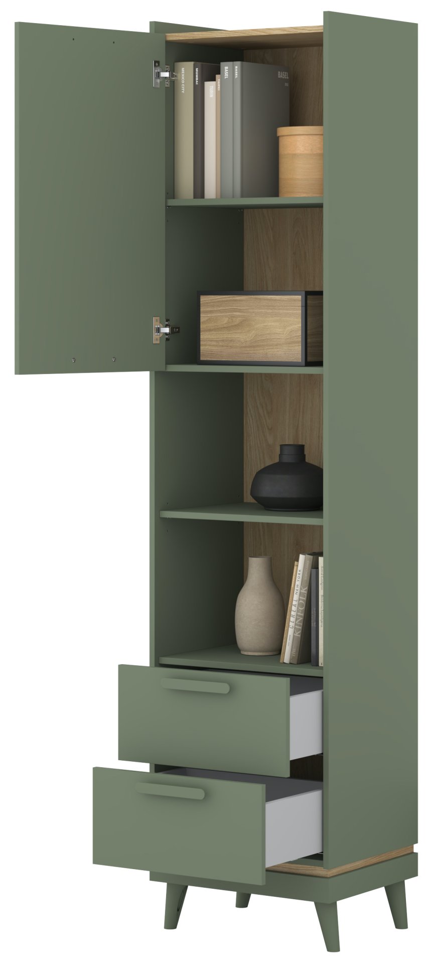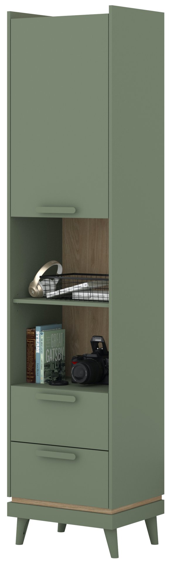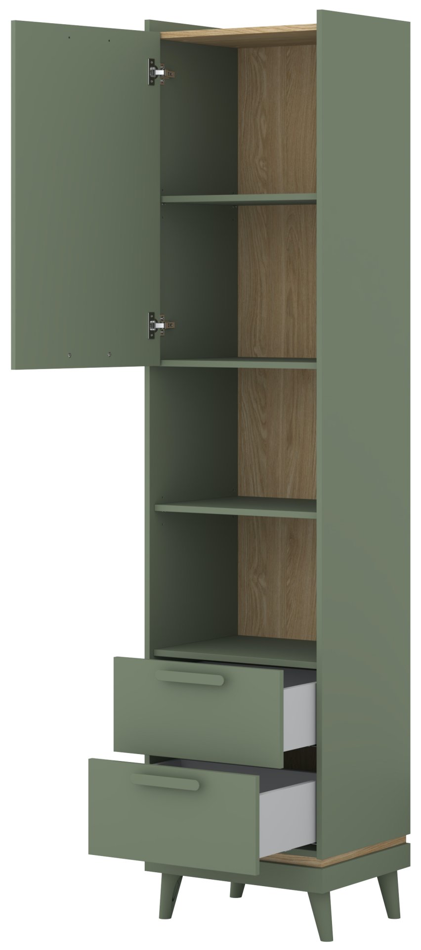 Ormar Scandi 2 savršen je izbor za sve koji cijene kvalitetu, estetiku i funkcionalnost. Njegov promišljen dizajn omogućuje da u vaš dom unese red i eleganciju, a pritom stvara ugodnu, prirodnu atmosferu. Idealan je za moderna stanovanja gdje je važno da svaki komad namještaja ima svoju svrhu i skladno se uklapa u okolinu. S njim ćete stvoriti prostor koji diše toplinom drveta i suptilnom svježinom zelene boje.