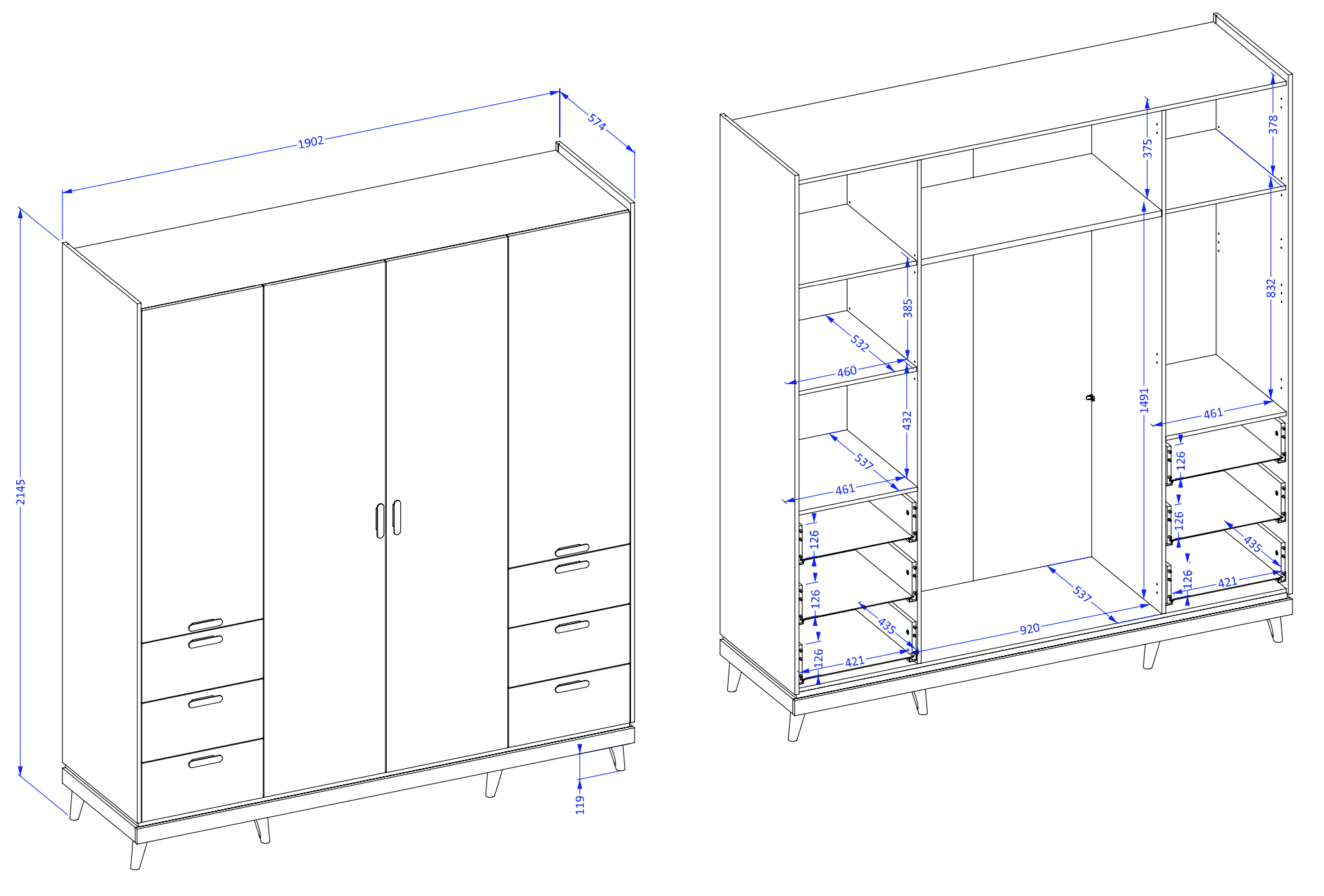 Garderobni ormar Scandi 2 može se pohvaliti pametnim rasporedom unutrašnjosti koji omogućuje optimalno iskorištavanje prostora. S četiri vrata i šest prostranih ladica imat ćete dovoljno mjesta za pohranu sve svoje odjeće, dodataka i sezonskih predmeta. Unutrašnjost je osmišljena tako da omogućuje logičan raspored – od viseće odjeće do složenih komada, obuće i modnih dodataka. Tako će vaša garderoba uvijek biti pregledna, uredna i lako dostupna.