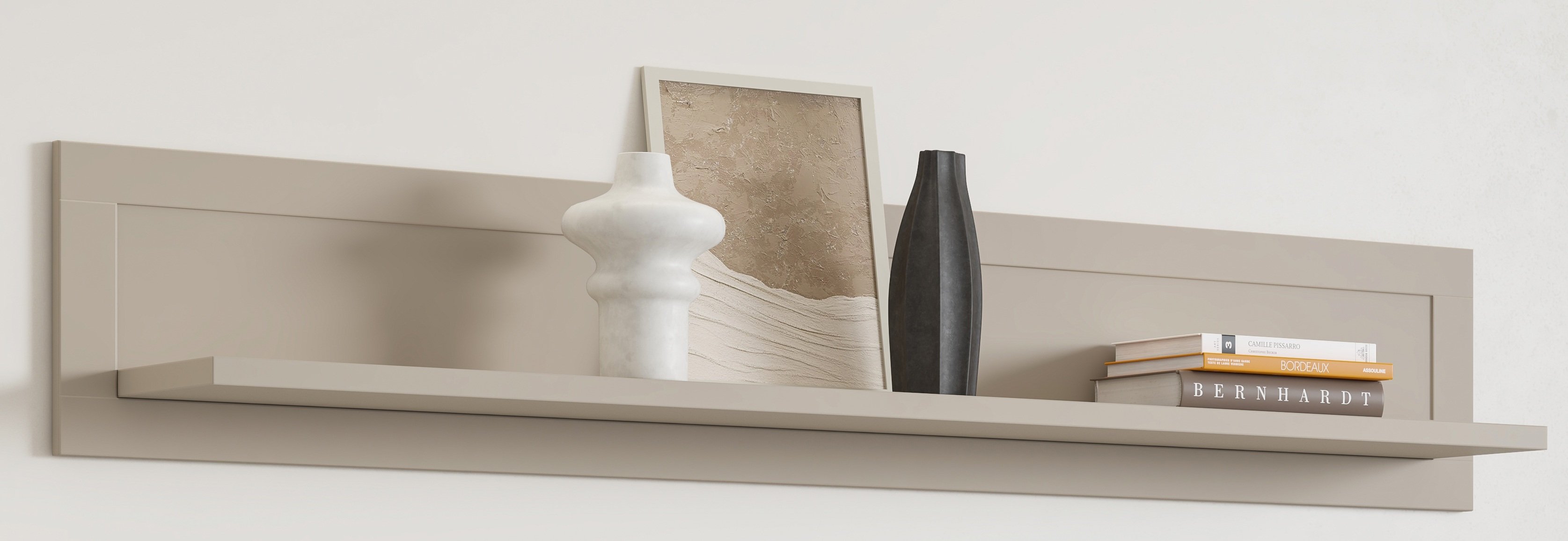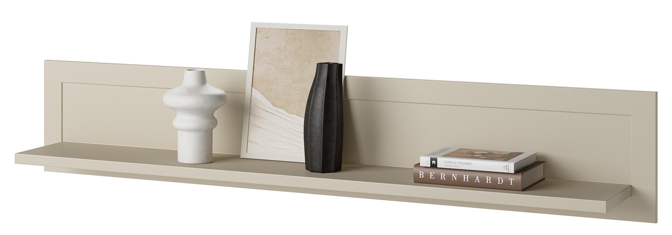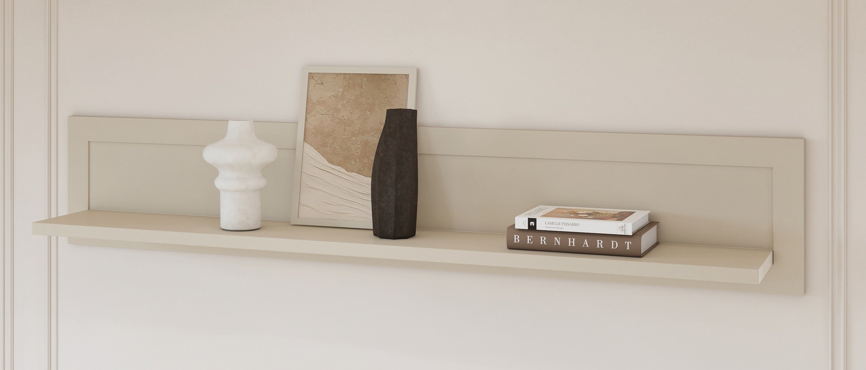 Zidna polica Evora dio je suvremene kolekcije namještaja proizvođača Helvetia meble iz Poljske. S dimenzijama 177x25x32 cm predstavlja uravnotežen omjer između funkcionalnosti i estetike, jer nudi dovoljno prostora za izlaganje dekorativnih predmeta, knjiga ili osobnih uspomena. Svijetlo bež koloristička kombinacija s toplim tonom hrasta dunin stvara ugodan kontrast koji se lijepo uklapa u različite unutarnje stilove – od modernog do klasičnog.