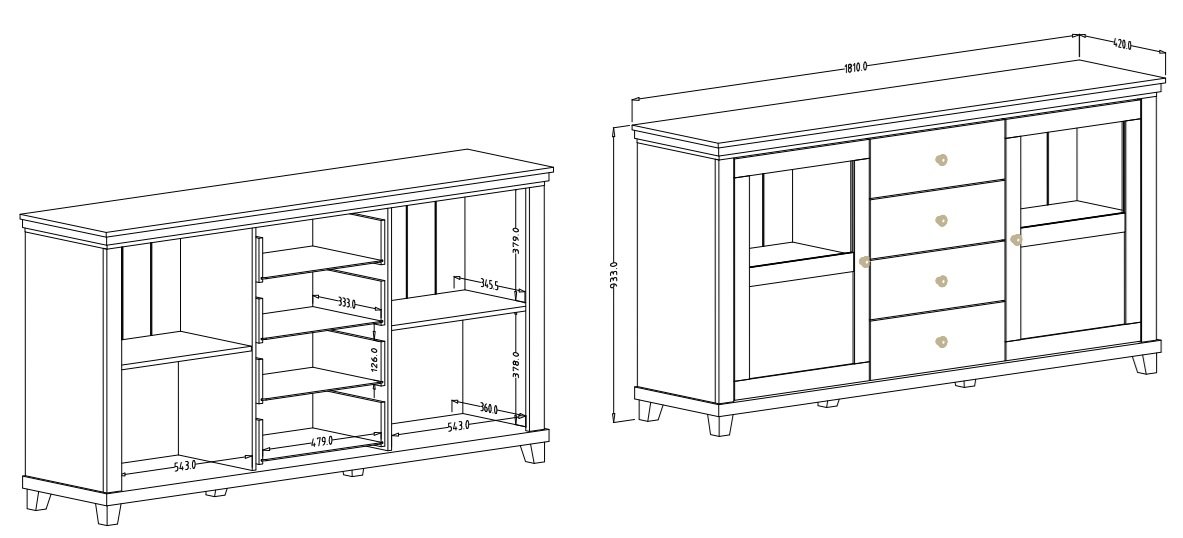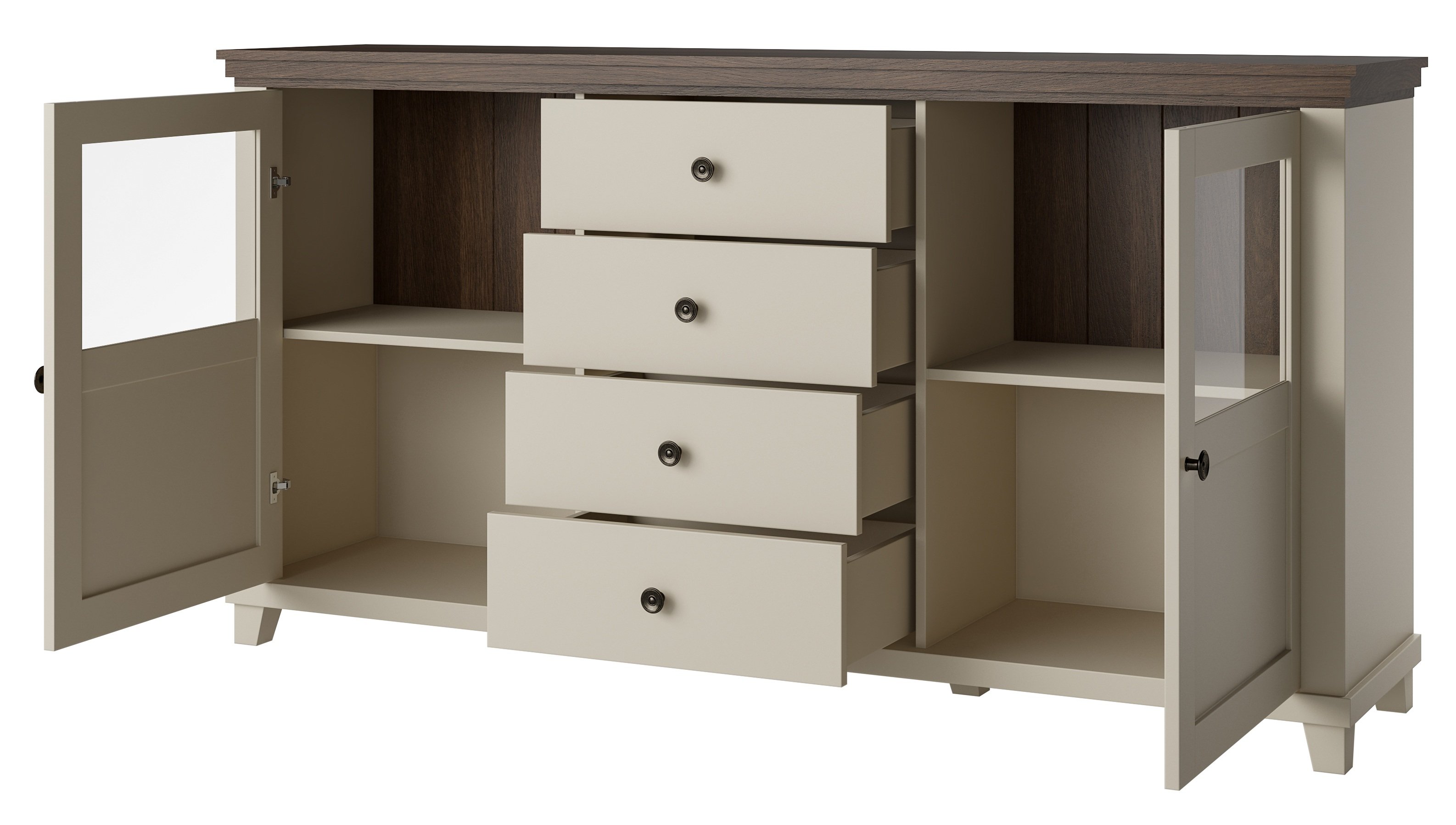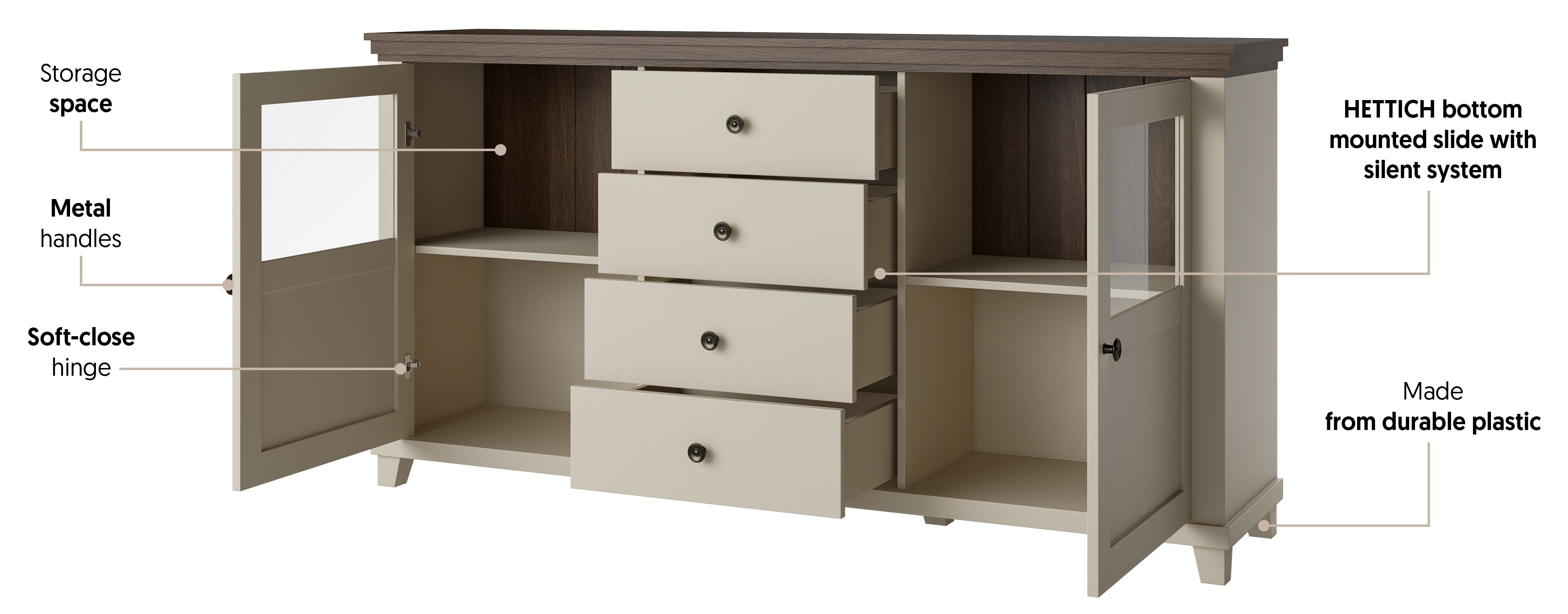 Komoda Evora dizajnirana je s naglaskom na praktičnost. Sastoji se od dvoja vrata i četiri ladice, koje omogućuju pregledno pohranjivanje različitih predmeta. Dovoljna je za spremanje dokumenata, tekstila, pribora za jelo kao i dekorativnih dodataka. Vrata se otvaraju meko i tiho, a ladice klize glatko po vodilicama, što omogućuje ugodno svakodnevno korištenje.