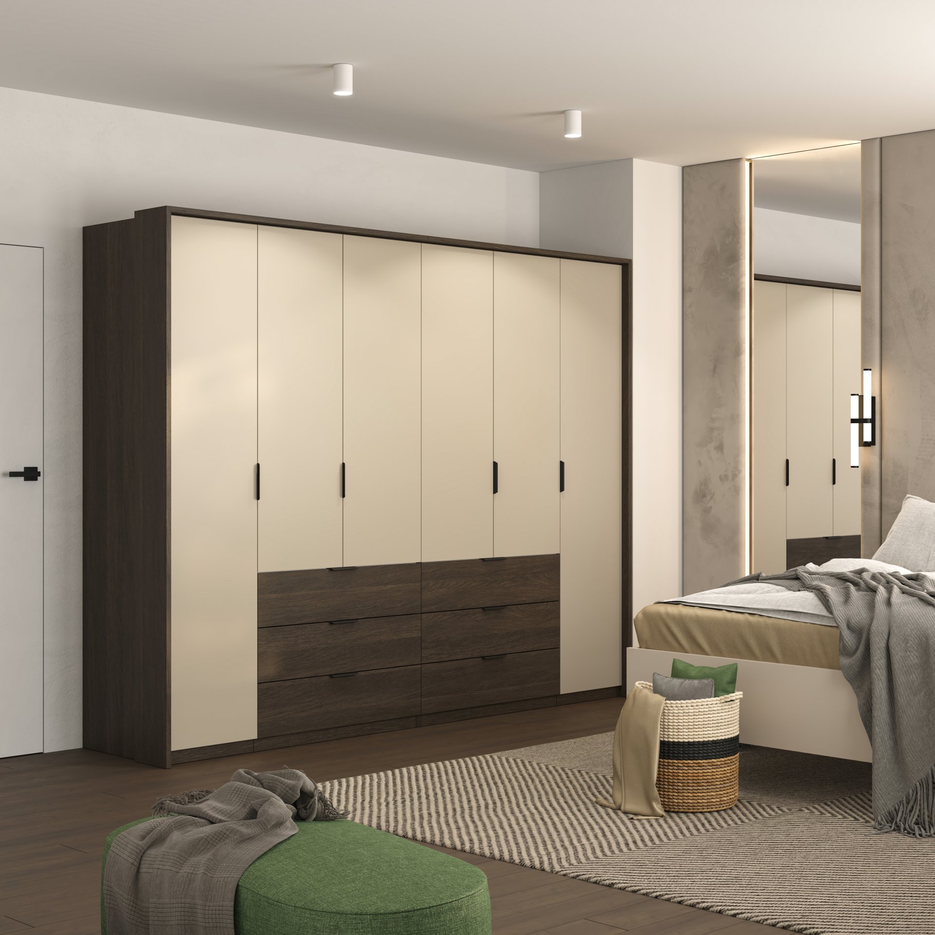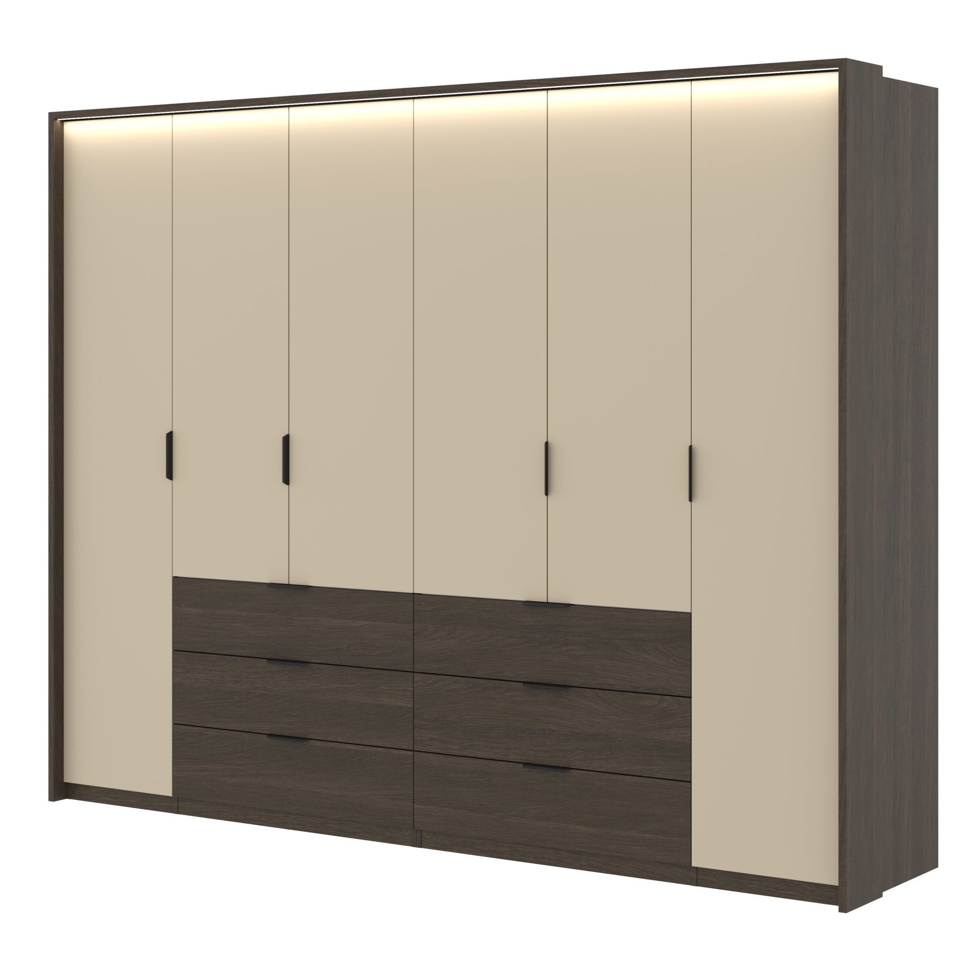 Dimenzije garderobnog ormara iznose 274 × 63 × 217 cm, što znači da nudi iznimno mnogo prostora za pohranu odjeće, modnih dodataka i drugih predmeta. Konstrukcija uključuje šest vrata i šest ladica, što omogućuje pregledan raspored sadržaja. Prostrana unutrašnjost osmišljena je tako da omogućuje kombinaciju polica i vješalica, čime se prilagođava različitim potrebama korisnika.