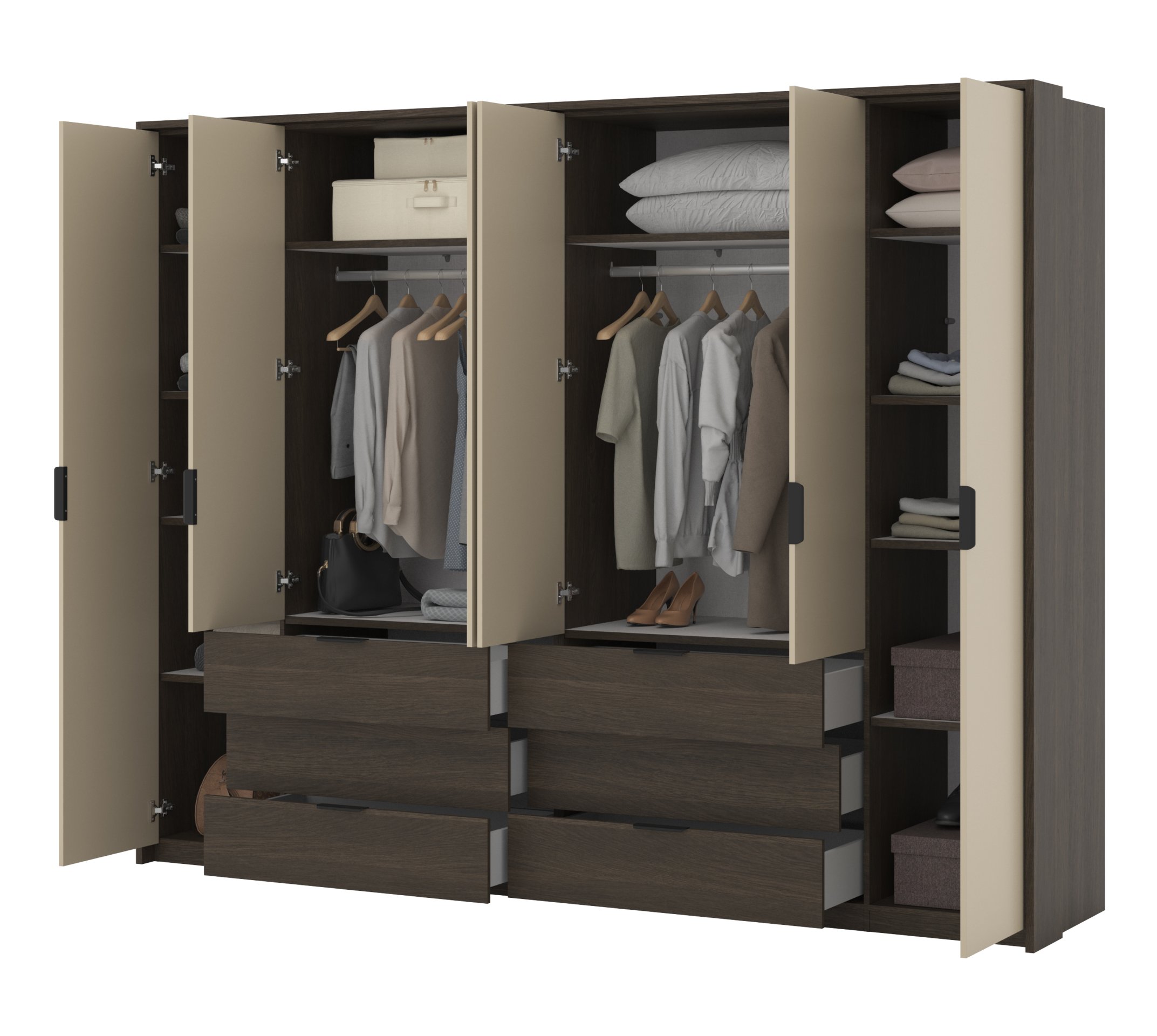 Unutarnji dizajn garderobnog ormara Mola omogućuje podjelu na više funkcionalnih zona. Prostrana područja s vješalicama prikladna su za kapute, haljine i košulje, dok su police i ladice namijenjene pohrani složene odjeće i dodataka. Šest ladica u donjem dijelu omogućuje praktičan pristup manjim komadima garderobe, poput donjeg rublja, modnih dodataka ili sezonskih predmeta. Zahvaljujući promišljenom dizajnu, unutrašnjost se po potrebi može dodatno prilagoditi dodatnim policama ili organizatorima.