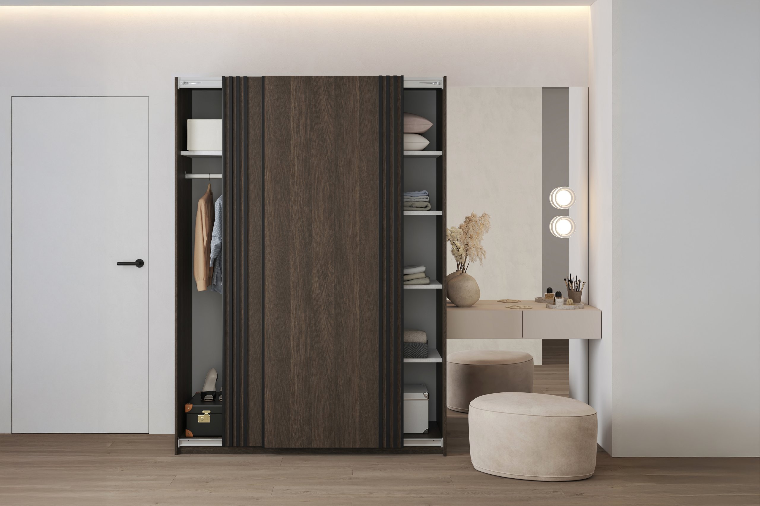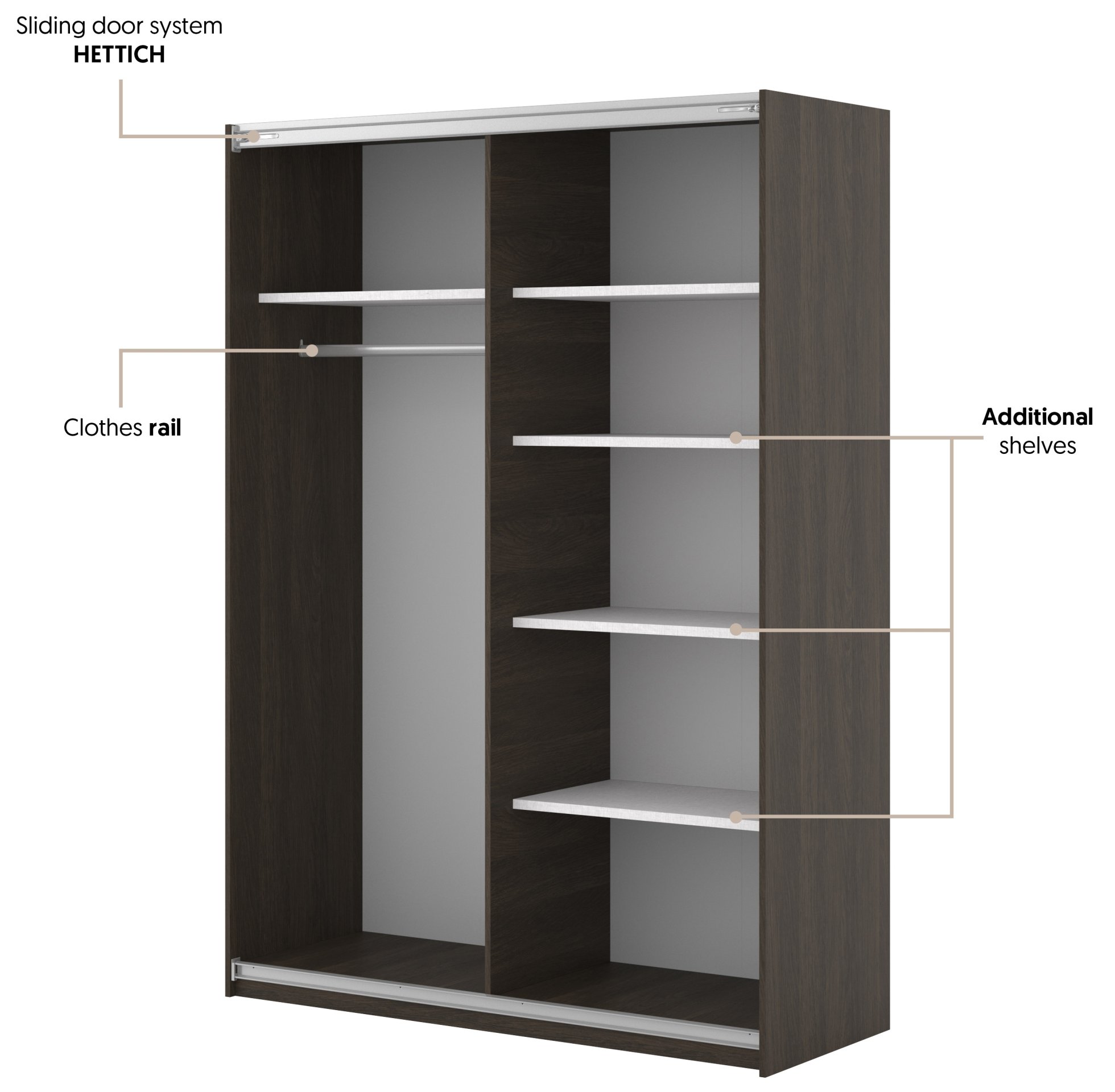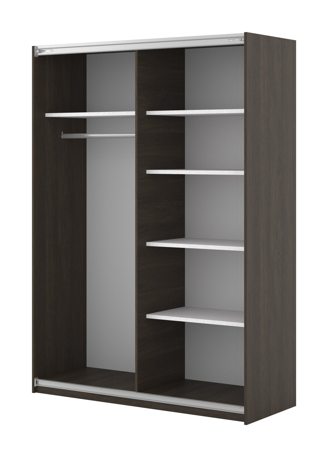 Unutrašnjost sadrži police i vješalicu koje omogućuju pregledan raspored garderobe. Na policama možete pohraniti složenu odjeću, kutije ili dodatke, dok vješalica omogućuje vješanje košulja, haljina ili kaputa. Takav unutarnji raspored omogućuje optimalno iskorištavanje prostora i jednostavnu organizaciju garderobe prema potrebama pojedinca.