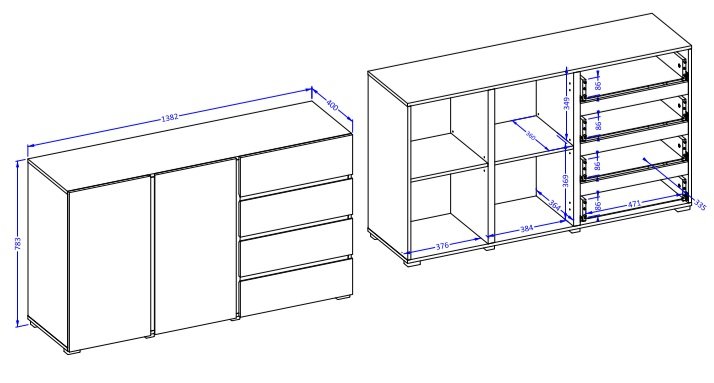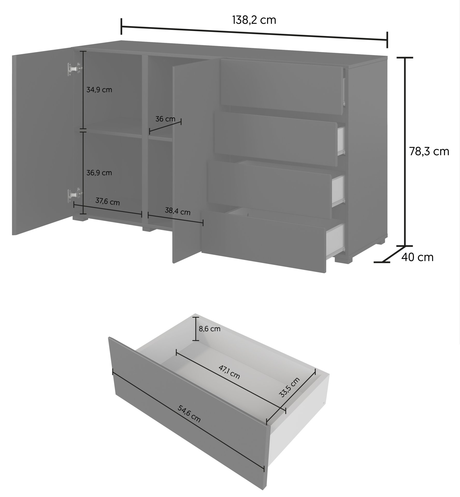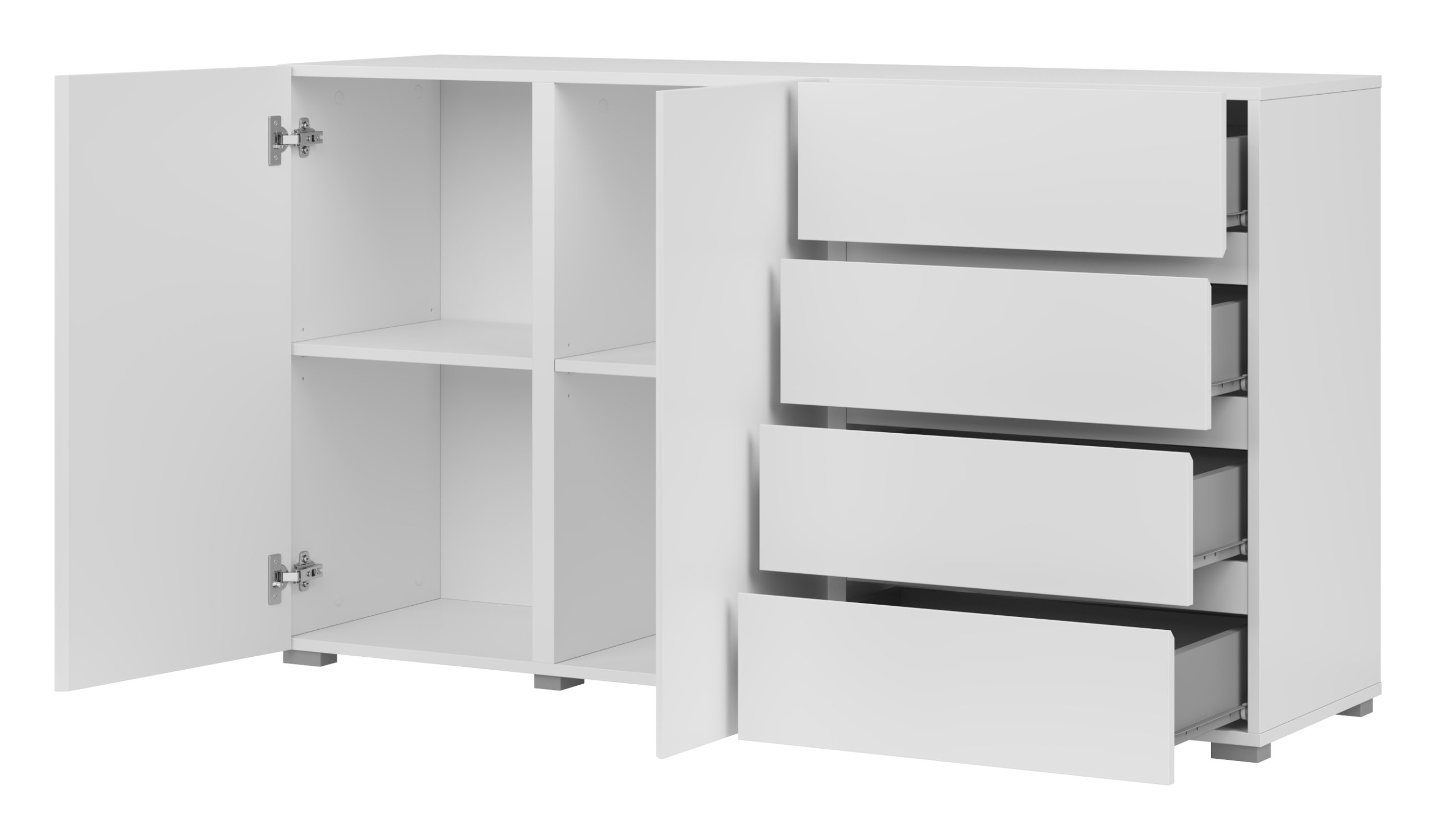 U unutrašnjosti komoda nudi praktičan raspored s 2 vrata i 4 ladice. Ladice omogućuju pohranu manjih predmeta poput dokumenata, tekstila ili dodataka, dok prostor iza vrata nudi veće površine za odlaganje knjiga, posuđa ili dekorativnih kutija. Ova kombinacija različitih tipova pohrane omogućuje urednost prostora i jednostavan pristup svakodnevnim predmetima.