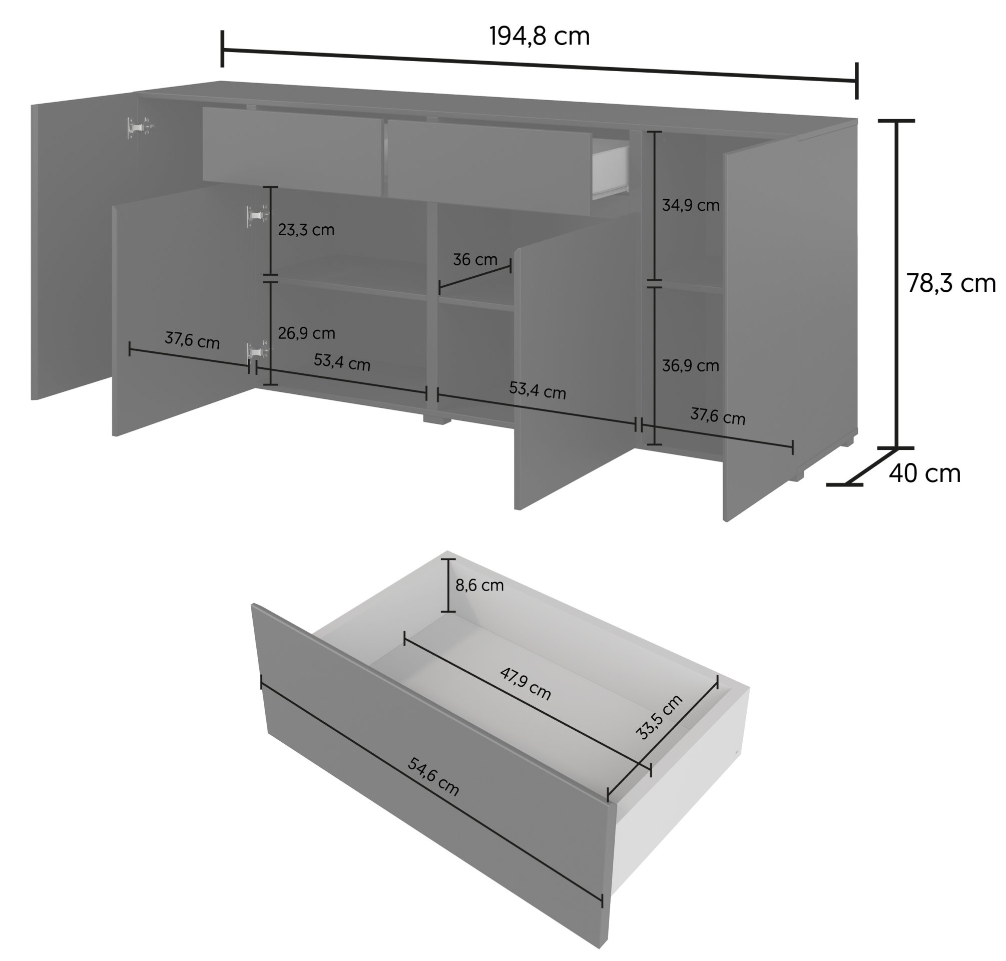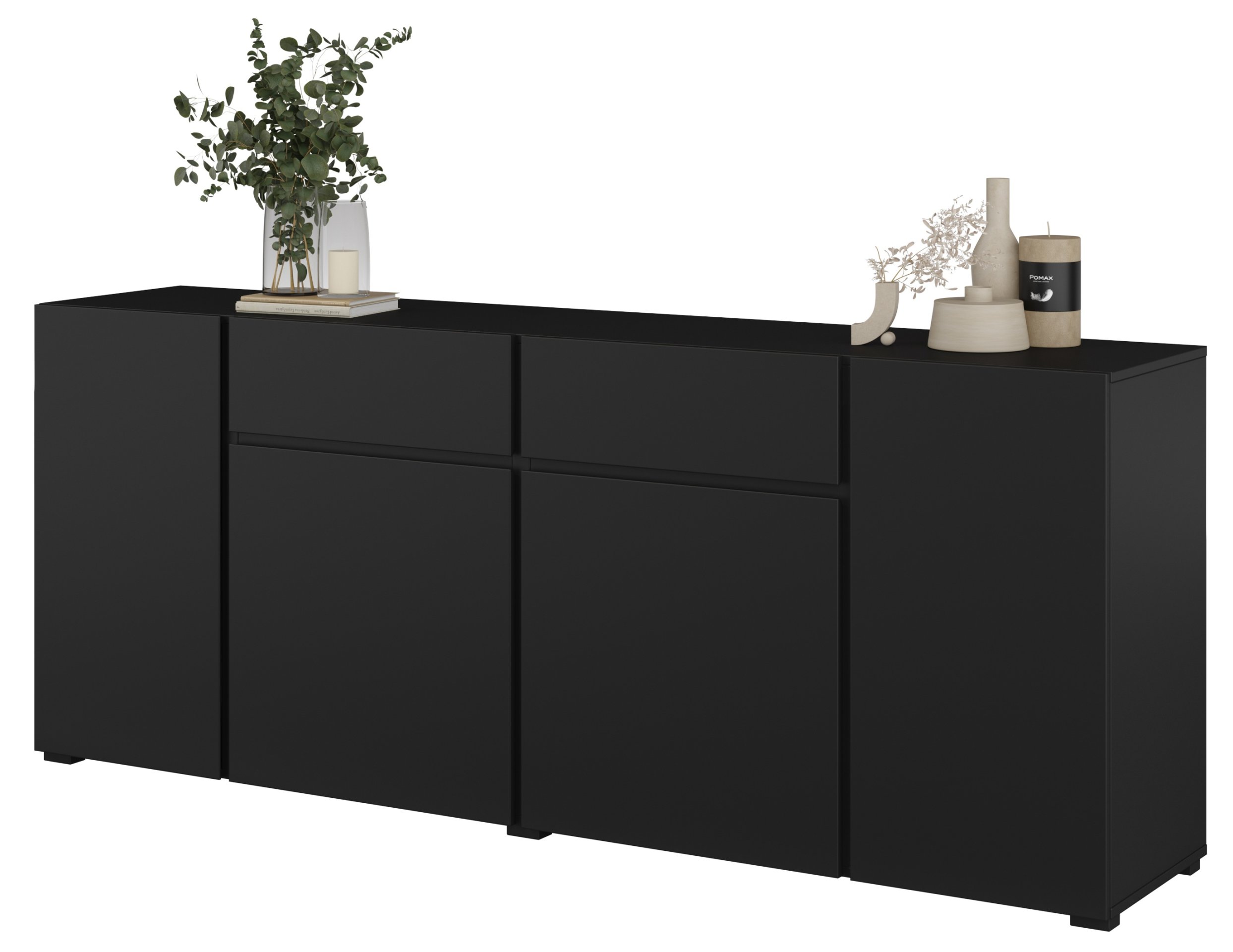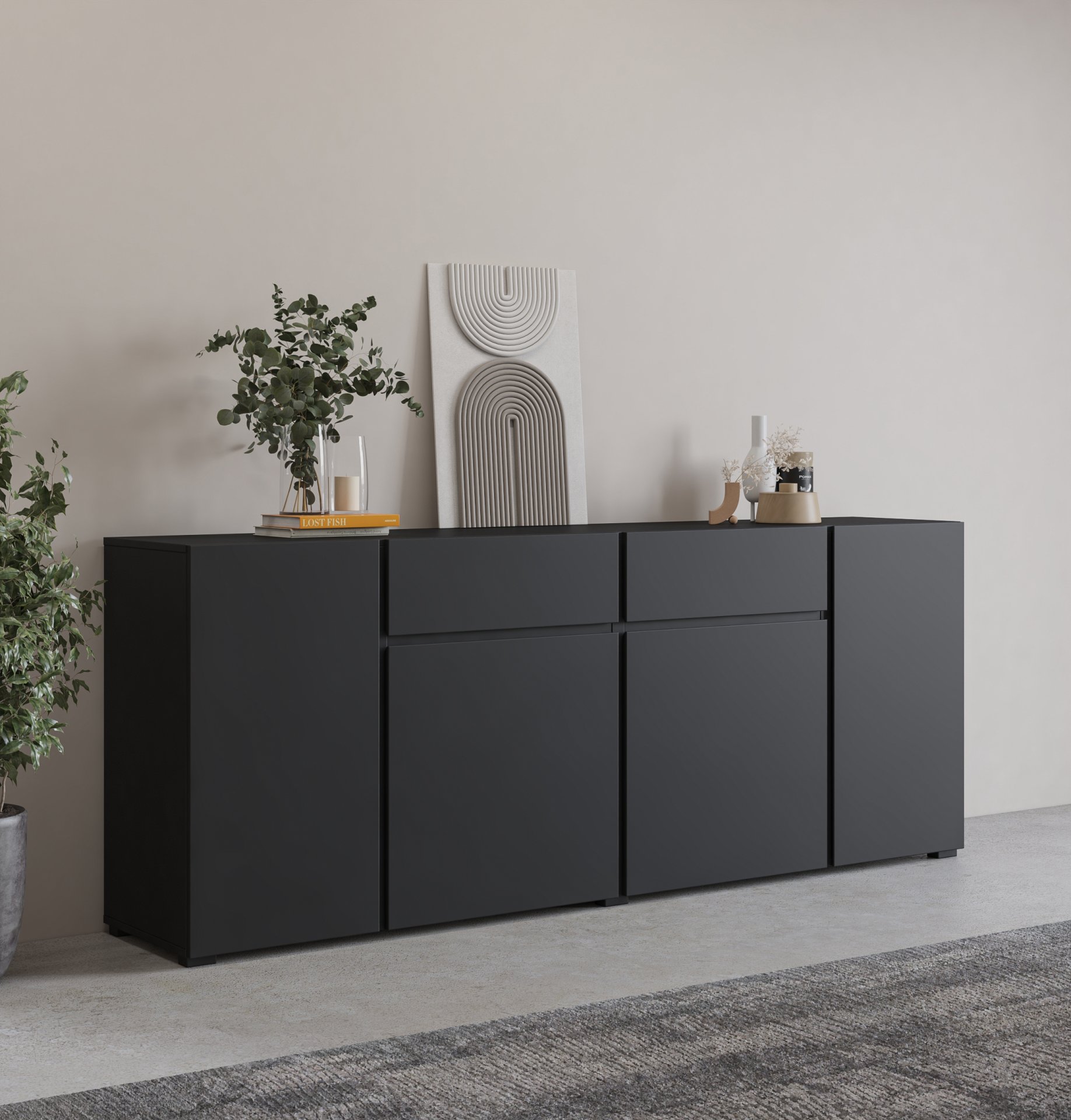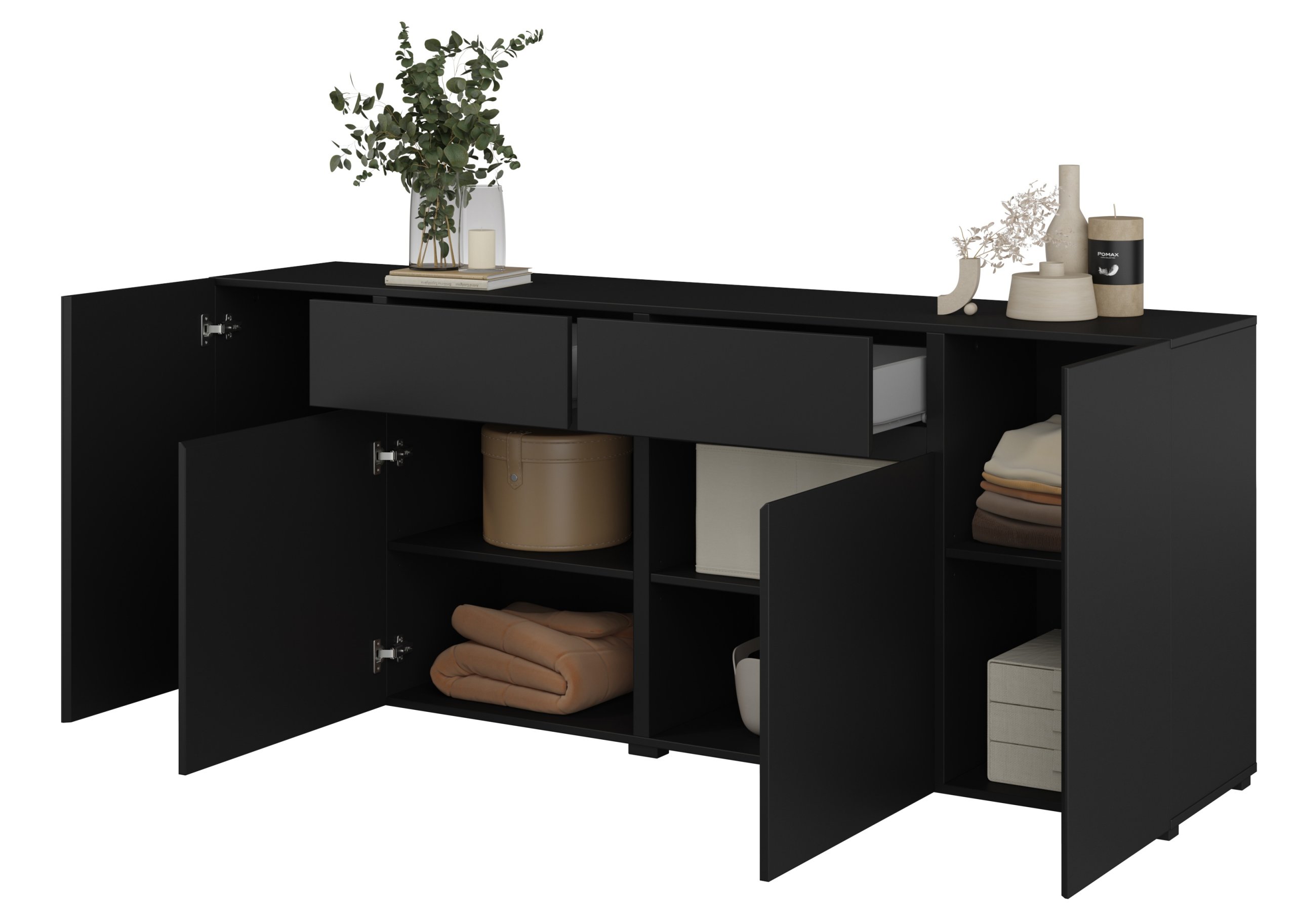 Komoda je dizajnirana kao komoda s četiri vrata i dvije ladice, što omogućuje optimalan raspored spremišnih površina. Za veće predmete namijenjeni su prostrani zatvoreni dijelovi s vratima, dok dvije ladice omogućuju praktično pohranjivanje manjih predmeta, dokumenata ili tekstila. Svi se elementi otvaraju suvremenim sustavom push-to-open, koji zamjenjuje klasične ručke i održava potpuno glatku prednju površinu. Ovaj mehanizam omogućuje tiho i jednostavno otvaranje laganim pritiskom, a pritom doprinosi elegantnom izgledu bez nepotrebnih dodataka.