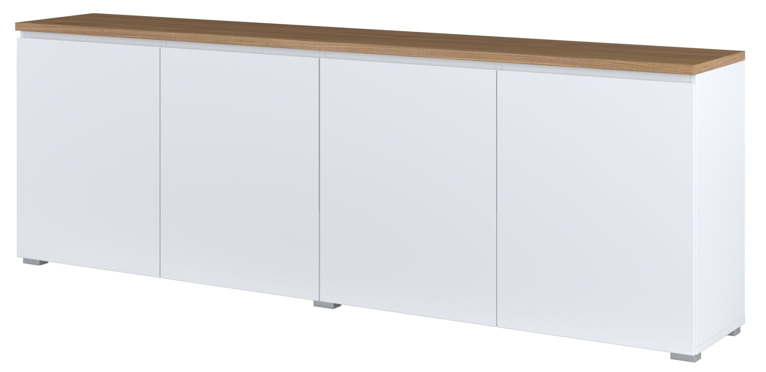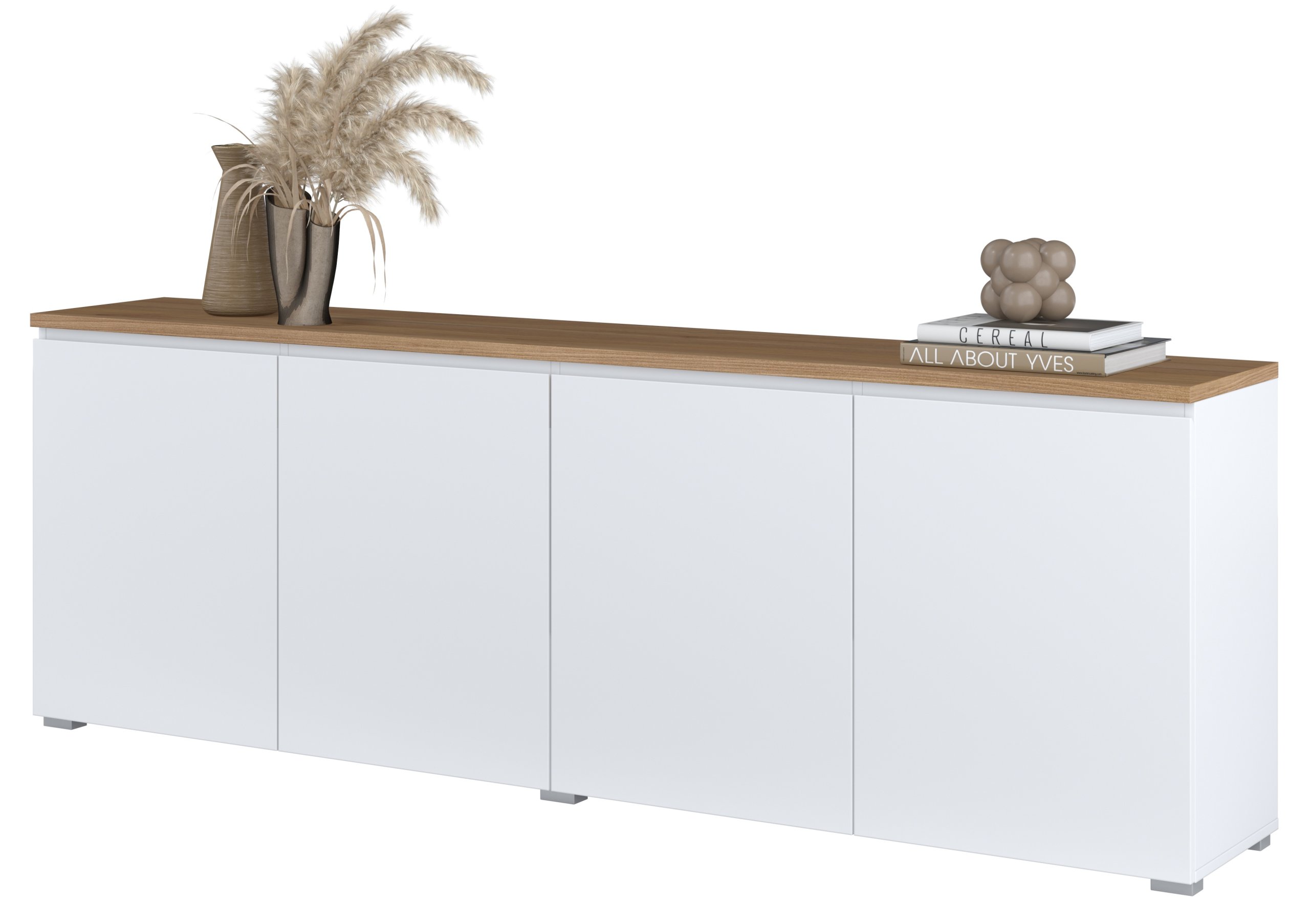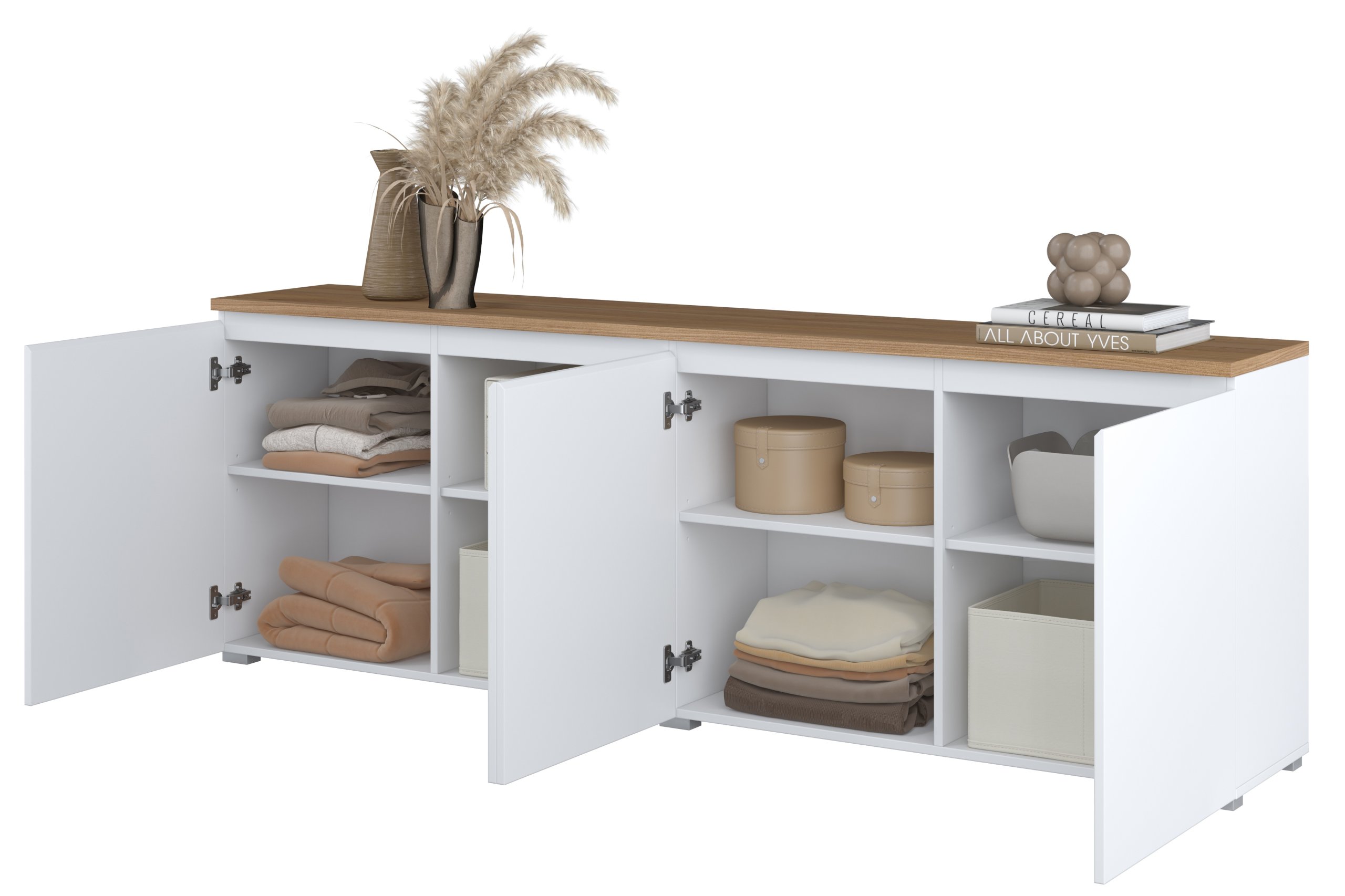 Kombinacija bijele boje i dekora hrasta mauvella pažljivo je odabrana kako bi stvorila osjećaj svjetlosti i prirodnosti. Komoda se lijepo uklapa uz svijetli namještaj, ali i uz tamnije kontrastne elemente. Njezina duljina od 200 cm omogućuje korištenje gornje površine kao dodatne odlagalne plohe – primjerice za dekorativne predmete, rasvjetu ili obiteljske fotografije. Zbog male visine od 68 cm prostor ostaje otvoren i prostran.