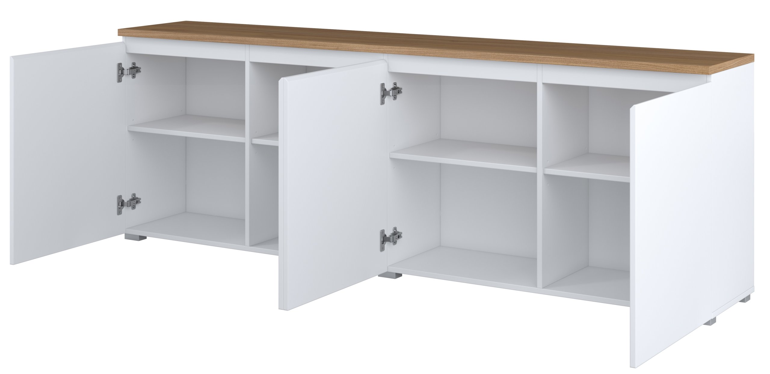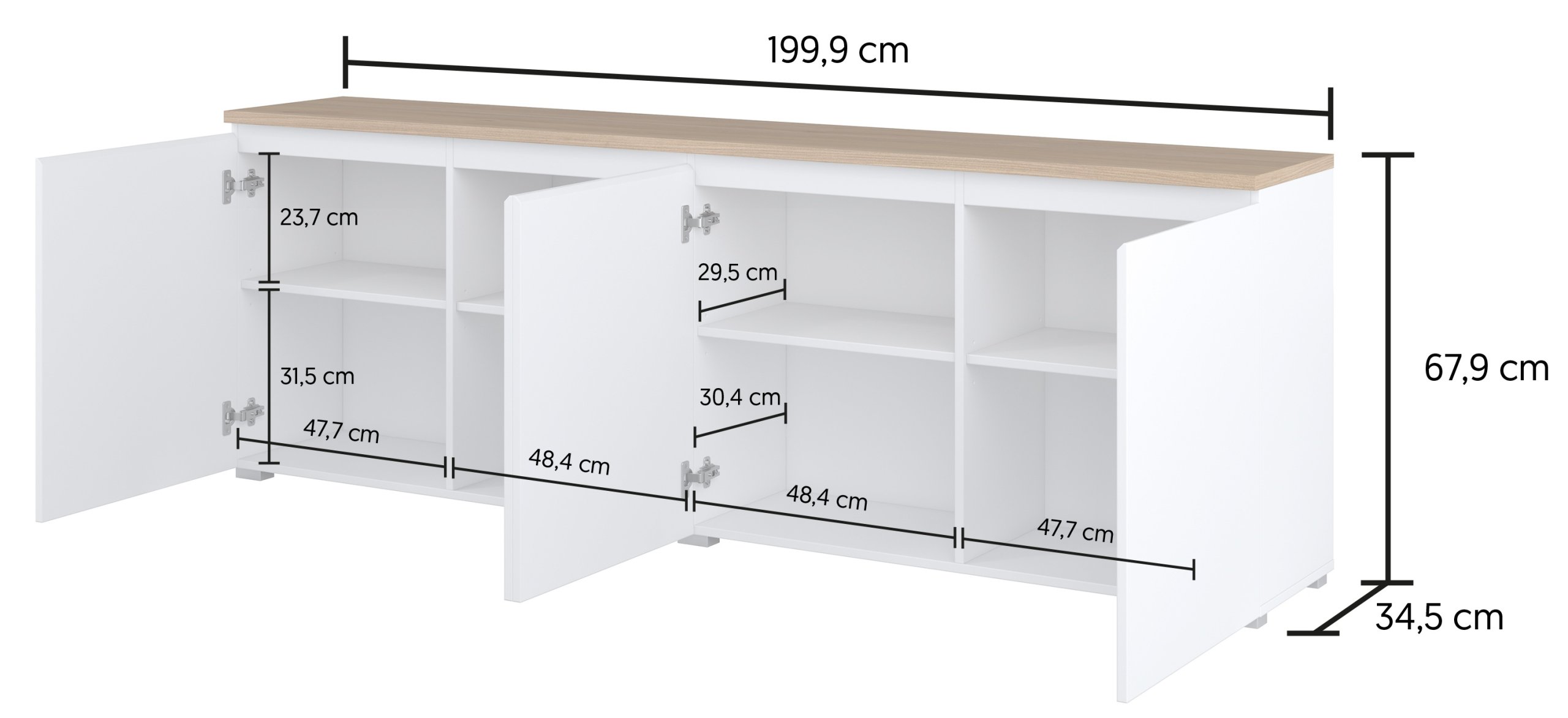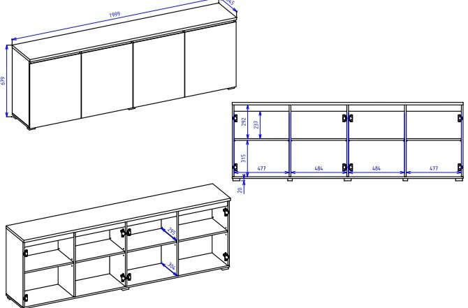 Komoda Modo 247VOJ25 mjeri 200x35x68 cm, što znači da nudi mnogo korisnog prostora, a da pritom ne opterećuje prostor. Četverovratni dizajn omogućuje podjelu unutrašnjosti na više segmenata, gdje korisnik može organizirati dokumente, tekstil, posuđe ili druge svakodnevne predmete. Zbog uske dubine od 35 cm idealan je izbor za hodnike, dnevne boravke ili blagovaonice, gdje je potrebno učinkovito iskoristiti prostor.