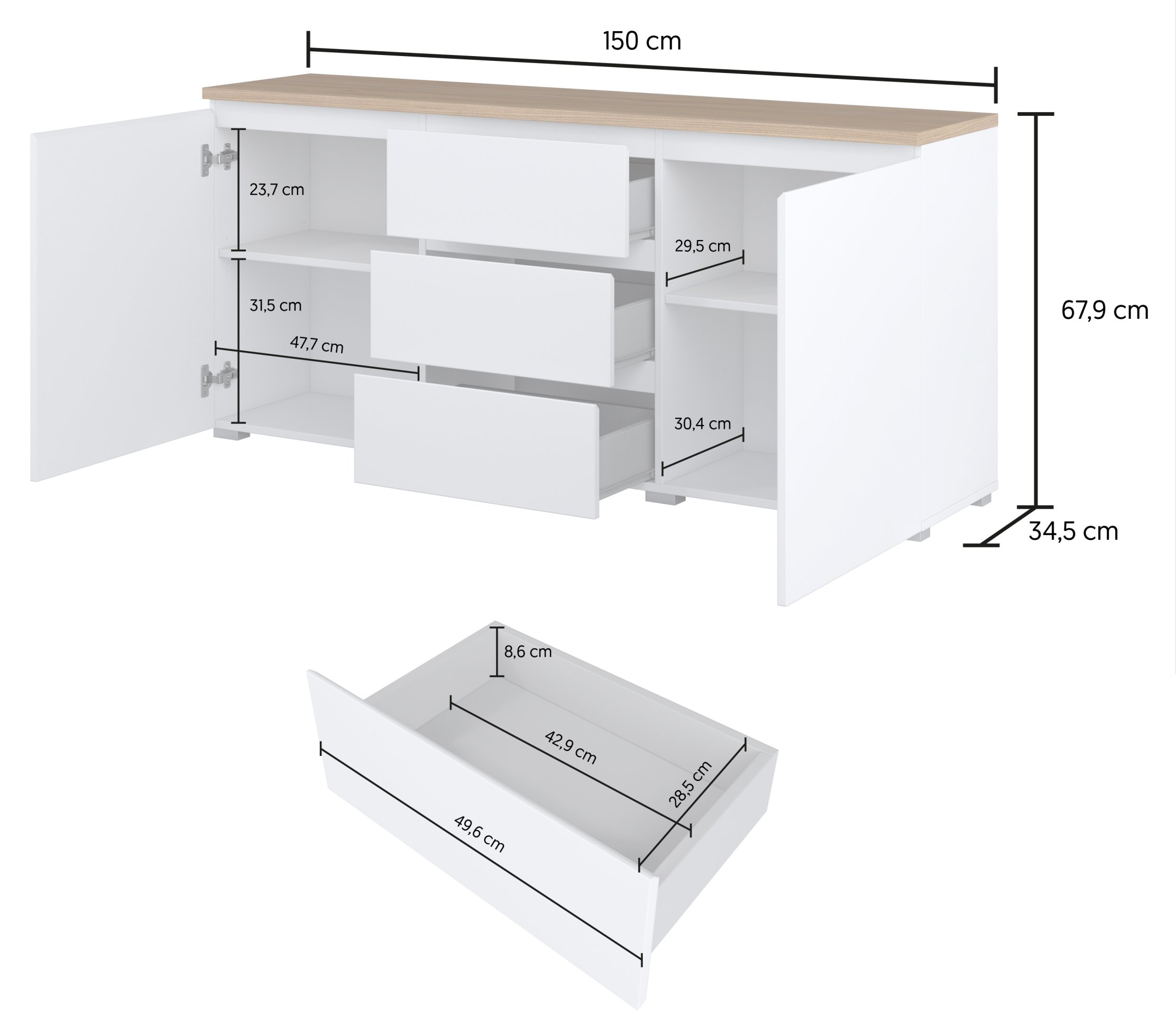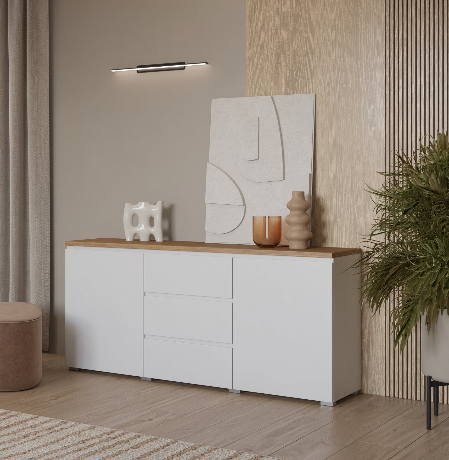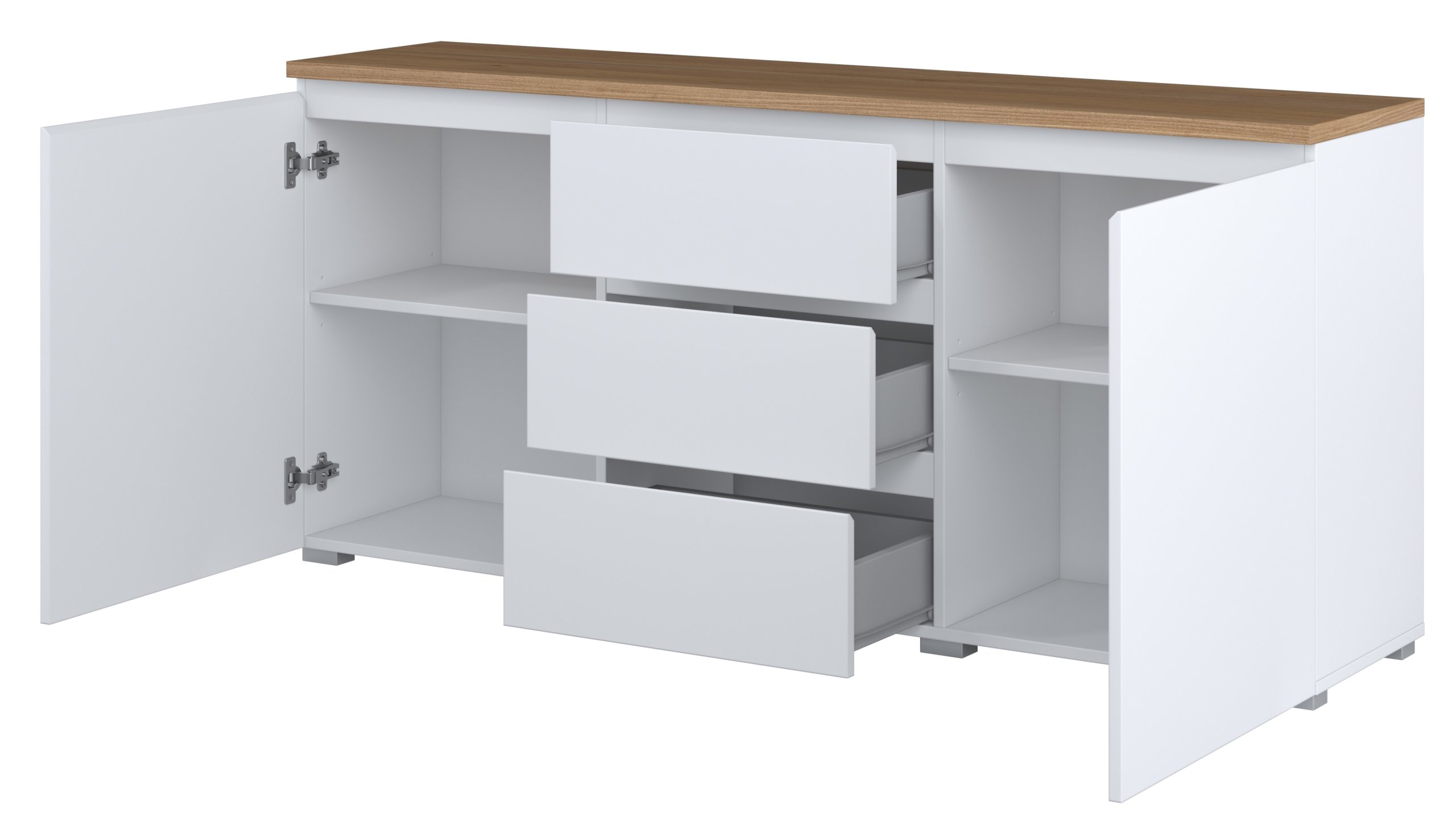 Ova komoda u kombinaciji bijele i prirodne boje hrasta mauvella izvrstan je primjer suvremenog namještaja koji spaja funkcionalnost i estetiku u jednom komadu. S dimenzijama 150x35x68 cm nudi dovoljno prostora za pohranu, a zbog uskog oblika ne zauzima previše mjesta, što je čini idealnom za manje prostore, hodnike ili dnevne sobe. Izrađena je u tvornici Helvetia meble u Poljskoj, gdje je kvaliteta izrade podržana dugogodišnjim iskustvom u proizvodnji modernog namještaja.