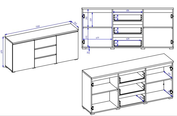 Komoda Modo 247VOJ26 nudi dvoja vrata i tri prostrane ladice, što omogućuje organizirano pohranjivanje različitih predmeta. Ladice su pogodne za manje predmete, dokumente ili tekstil, dok prostori iza vrata nude više mjesta za veće stvari, poput knjiga, posuđa ili dekorativnih dodataka. Korisni raspored unutrašnjosti omogućuje da komoda služi i kao samostalan komad u dnevnoj sobi, ali i kao dio veće kompozicije u spavaćoj sobi ili blagovaonici.