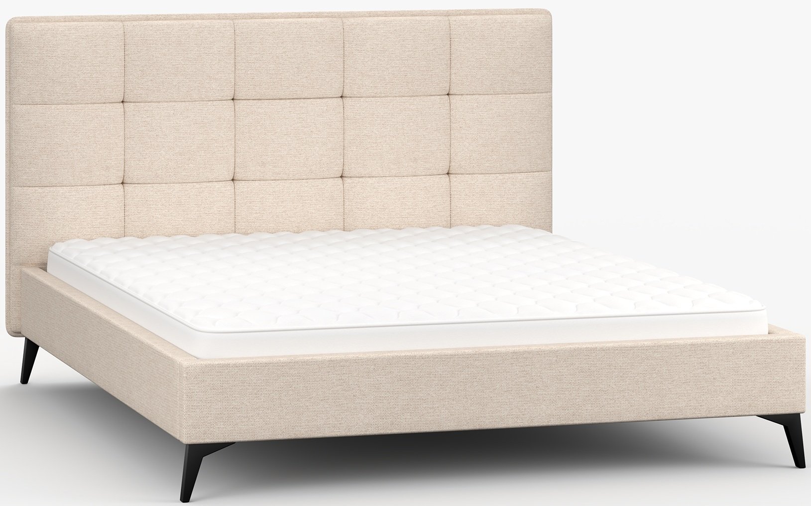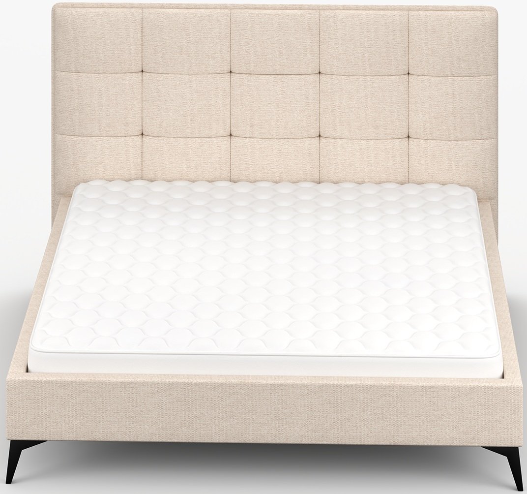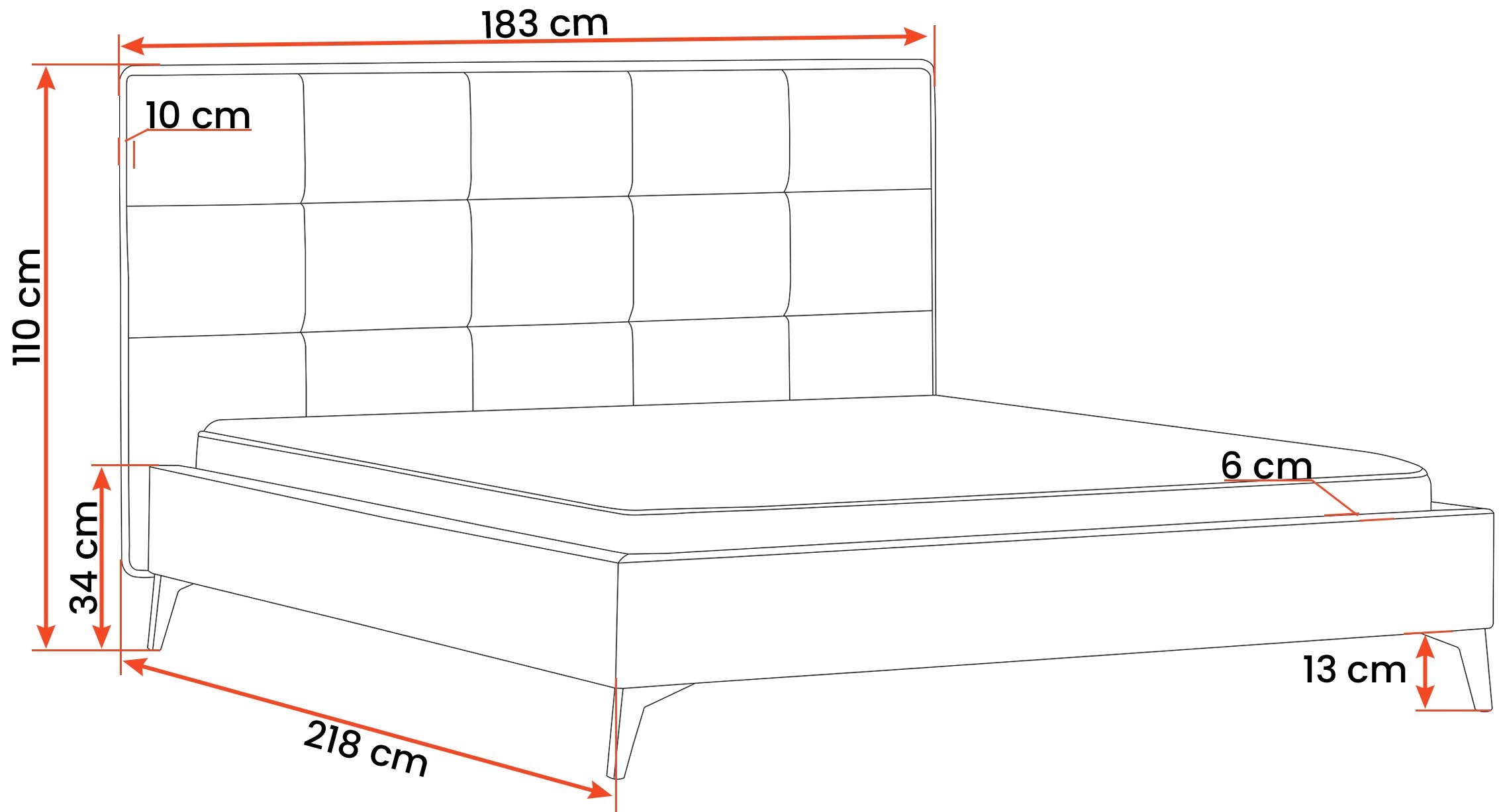 Metalne noge u crnoj boji, visoke 13 cm, daju krevetu vizualnu lakoću te omogućuju jednostavno čišćenje poda ispod njega. Cijela konstrukcija mjeri 183x218x110 cm, što pruža dovoljno prostora za standardne madrace dimenzija 160x200 cm. Krevet se prodaje bez madraca, što omogućuje svakom korisniku da odabere model koji najbolje odgovara njegovim navikama spavanja i preferencijama tvrdoće.