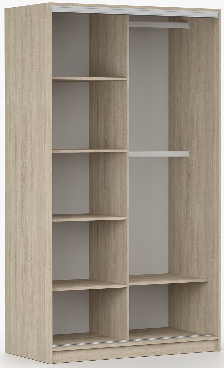 Iako ormar ima kompaktne vanjske dimenzije, unutrašnjost je dobro raspoređena i omogućuje pregledno pohranjivanje. U gornjem dijelu obično se nalazi prostor za odlaganje sezonske odjeće ili posteljine, dok se dolje nalazi dio s prečkom za vješanje odjeće na vješalicama. Bočni dio namijenjen je policama, gdje možete urediti složenu odjeću, torbe ili kutije s dodacima. Takav raspored omogućuje maksimalno iskorištavanje prostora i osigurava da je sve uvijek na dohvat ruke.