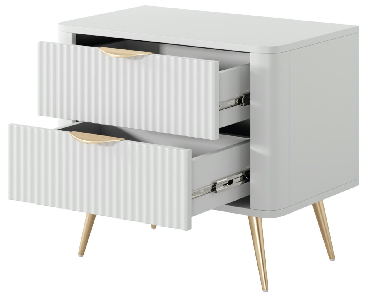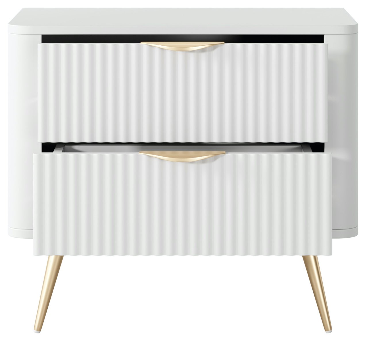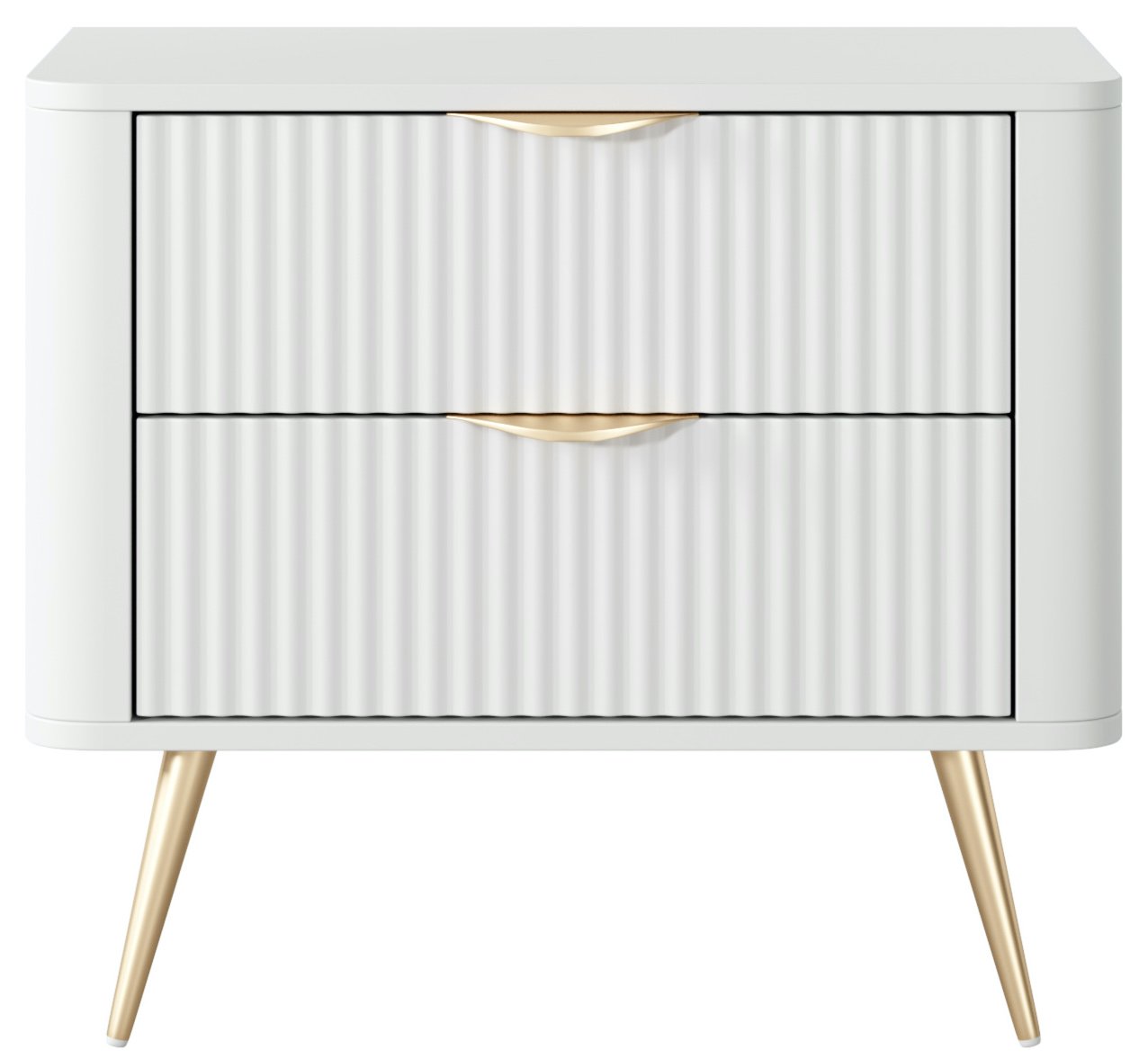 Vizualni dojam noćnog ormarića Lante 2S savršen je spoj jednostavnosti i elegancije. Bijela boja naglašava osjećaj svježine i svjetlosti te omogućuje da se ormarić lako kombinira s drugim komadima namještaja. Metalne ručke i nogice u zlatnoj boji dodaju dašak luksuza i stvaraju suptilan kontrast s bijelom površinom. Metalni elementi nisu samo estetski, već i izdržljivi i stabilni, što dodatno doprinosi kvaliteti proizvoda.