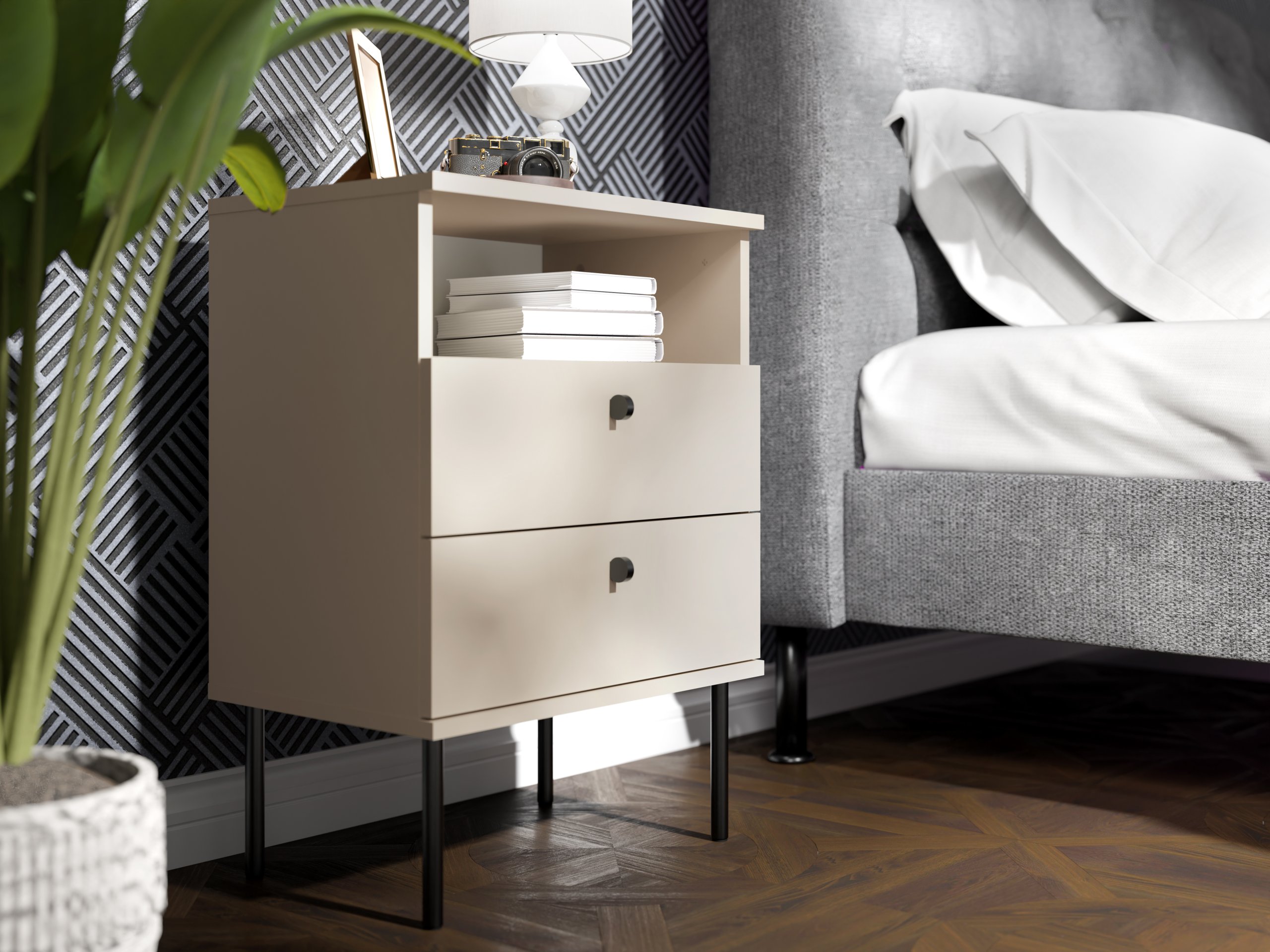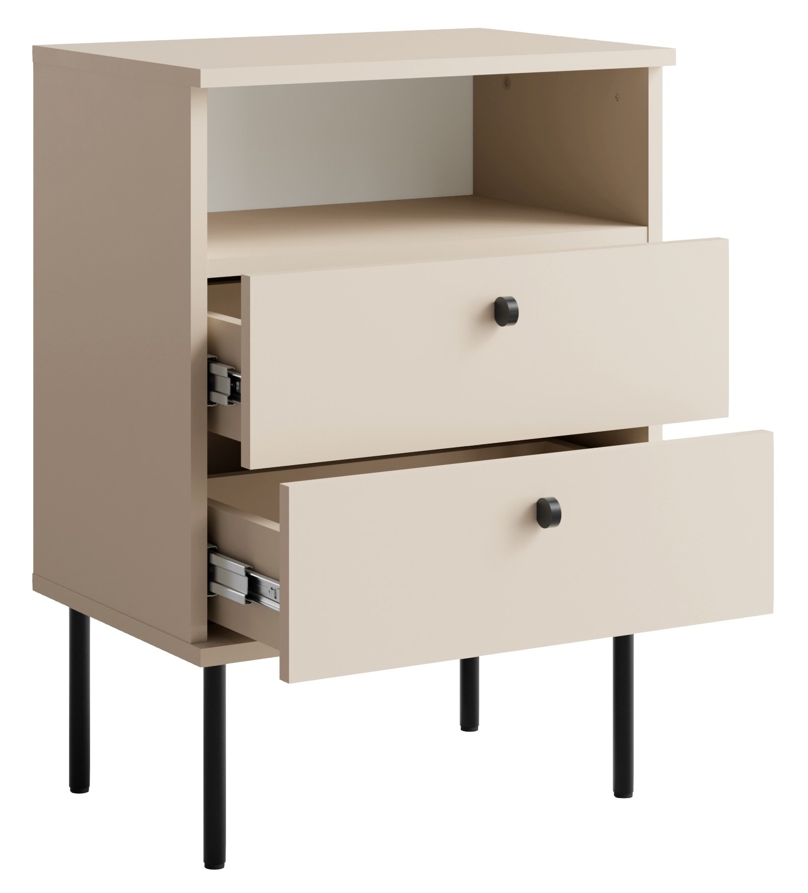 Metalne crne ručke i noge daju ovom komadu dozu modernog kontrasta i industrijskog šarma. Njihova čvrstoća garantira stabilnost, dok vizualno stvaraju efekt lakoće i elegancije. Bež ton površine unosi toplinu i mekoću u prostor, stvarajući ugodnu i opuštajuću atmosferu idealnu za odmor. Zahvaljujući neutralnoj boji, ormarić se lako kombinira s drugim elementima namještaja u različitim nijansama drva, bijele ili sive boje.