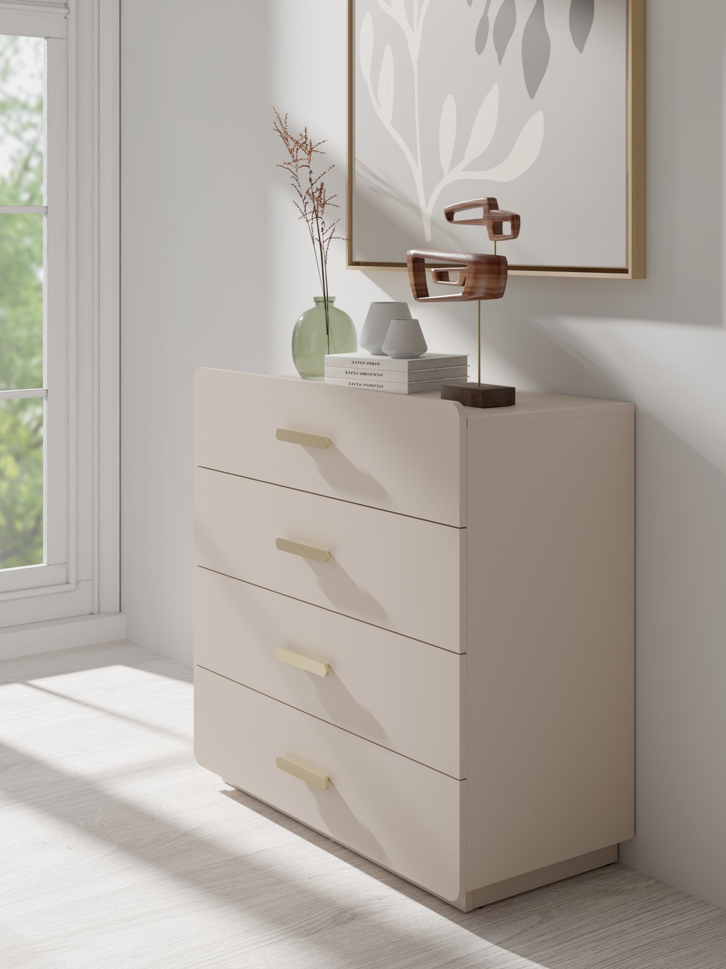 Komoda ima četiri prostrane ladice u koje možete organizirano pohraniti odjeću, posteljinu, dokumente ili druge osobne predmete. Njezin dizajn omogućuje da je koristite u spavaćoj sobi, dnevnom boravku, hodniku ili čak u uredu. Zahvaljujući neutralnoj bež boji, skladno se uklapa u različite kolorističke kombinacije i stilove – od minimalističkog do rustikalnog ili skandinavskog.