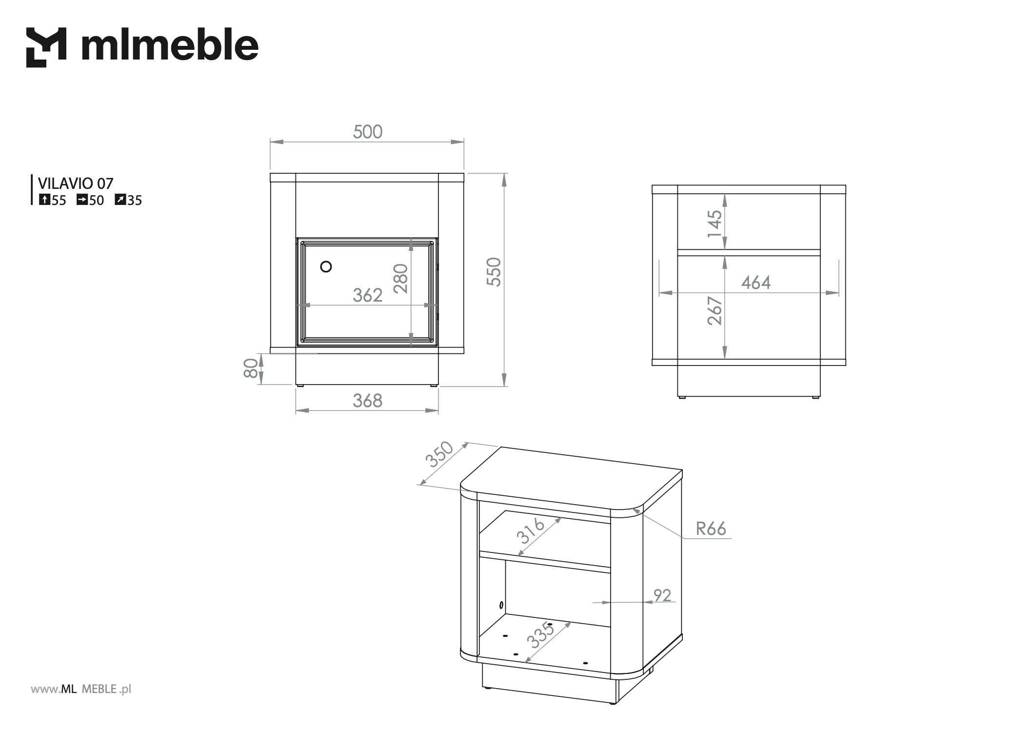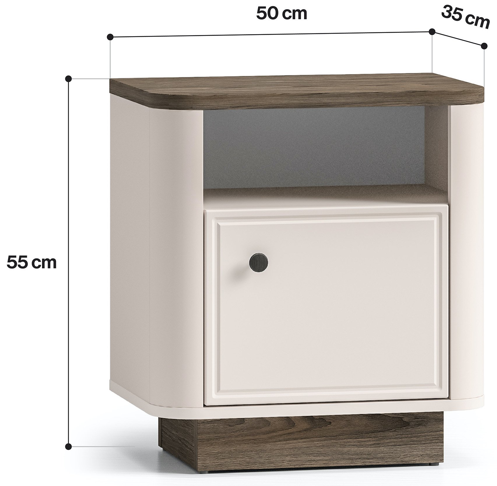 Dimenzije 50 × 35 × 55 cm osiguravaju optimalan omjer prostranosti i kompaktnosti. Noćni ormarić Vilavio 07 dovoljno je velik da pruži prostor za odlaganje noćne svjetiljke, knjige ili drugih osobnih predmeta, a istovremeno ne zauzima previše prostora uz krevet. Zahvaljujući promišljenoj visini, lijepo se prilagođava i klasičnim i modernim visinama kreveta.