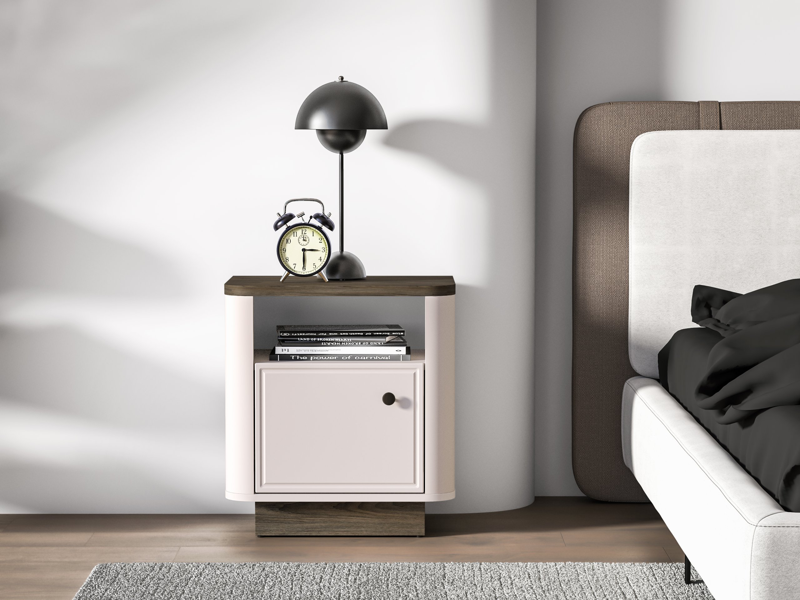 Ormarić uključuje ladicu odnosno odlagalnu površinu koja omogućuje uredno pohranjivanje manjih predmeta. Površina od kaljenog stakla ne samo da vizualno obogaćuje komad, već je i praktična za čišćenje te otporna na svakodnevnu uporabu. Elegantno zaobljeni rubovi dodaju mekoću obliku i smanjuju rizik od ozljeda, što je osobito važno u manjim prostorima ili domovima s djecom.