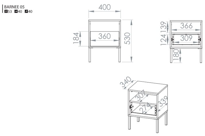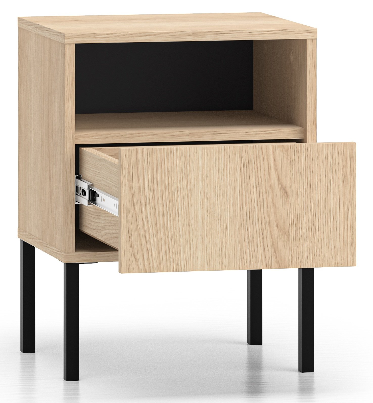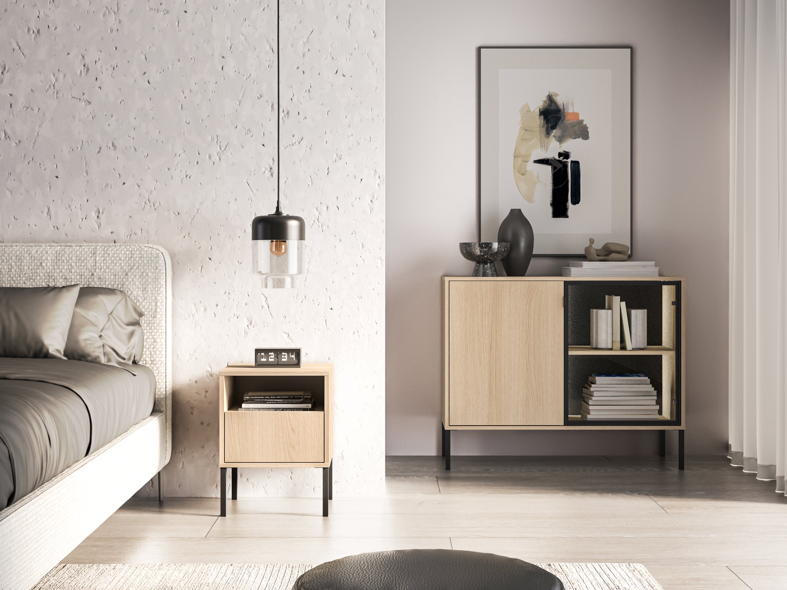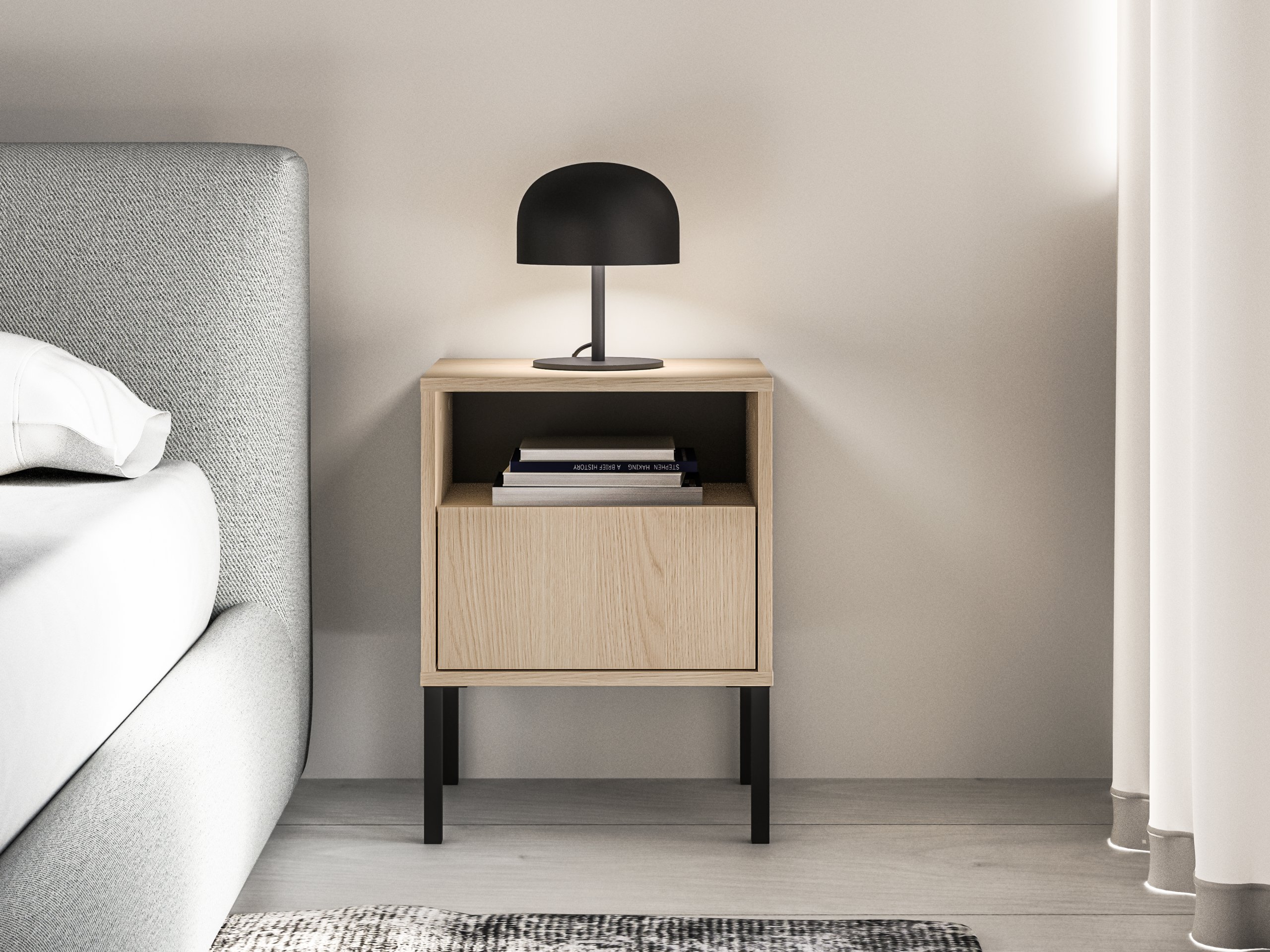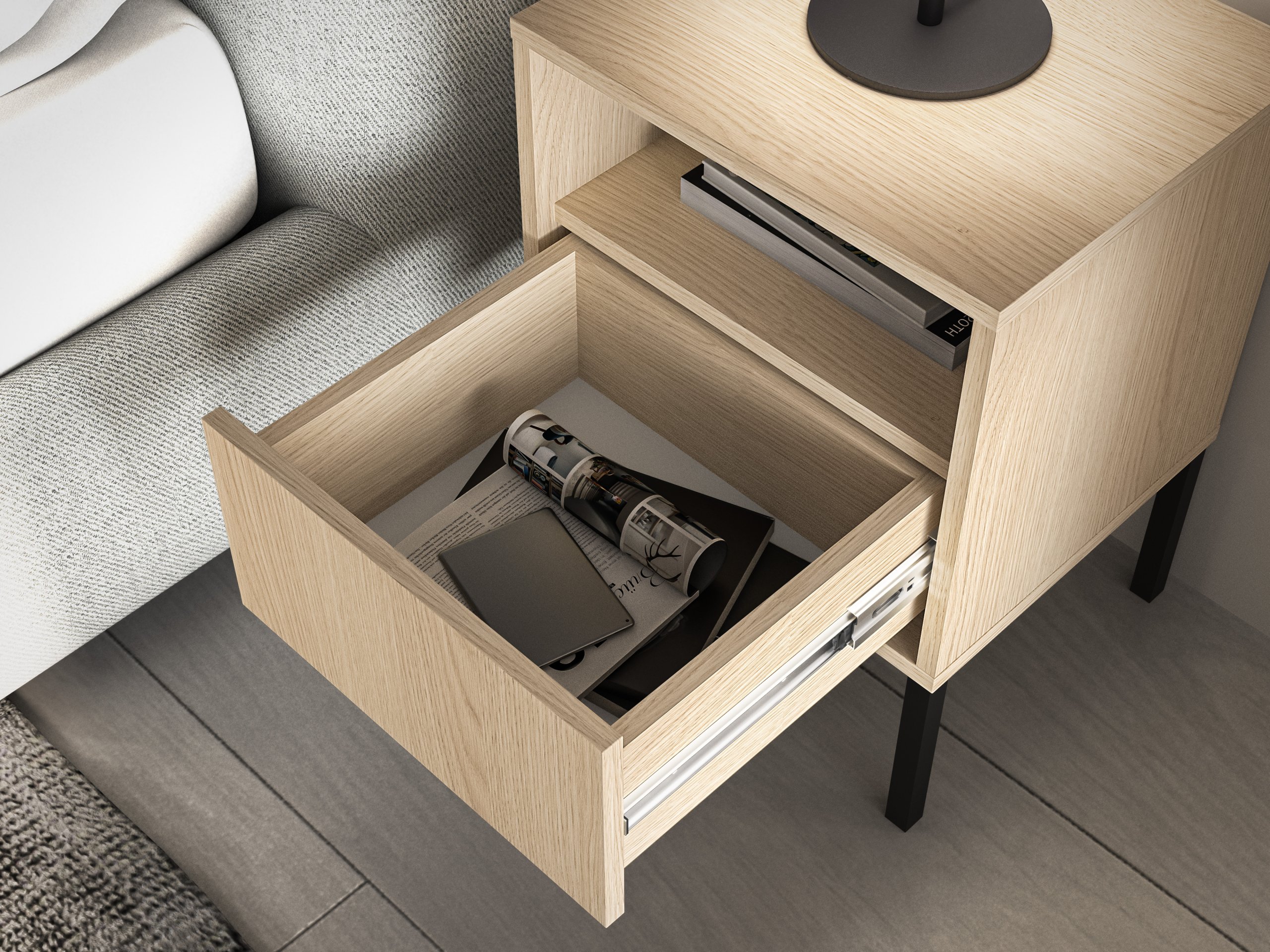 Model Barnee 05 dizajniran je s mišlju na svakodnevnu udobnost. Ormarić ima prostranu ladicu koja se otvara na kugličnim vodilicama, što omogućuje glatko i tiho otvaranje. Potpuno izvlačenje ladica znači da možete koristiti cijelu unutrašnjost bez napora, jer se ladica izvlači do kraja. To je posebno praktično ako želite imati sve potrebne predmete pri ruci – od knjiga i naočala do osobnih dodataka.